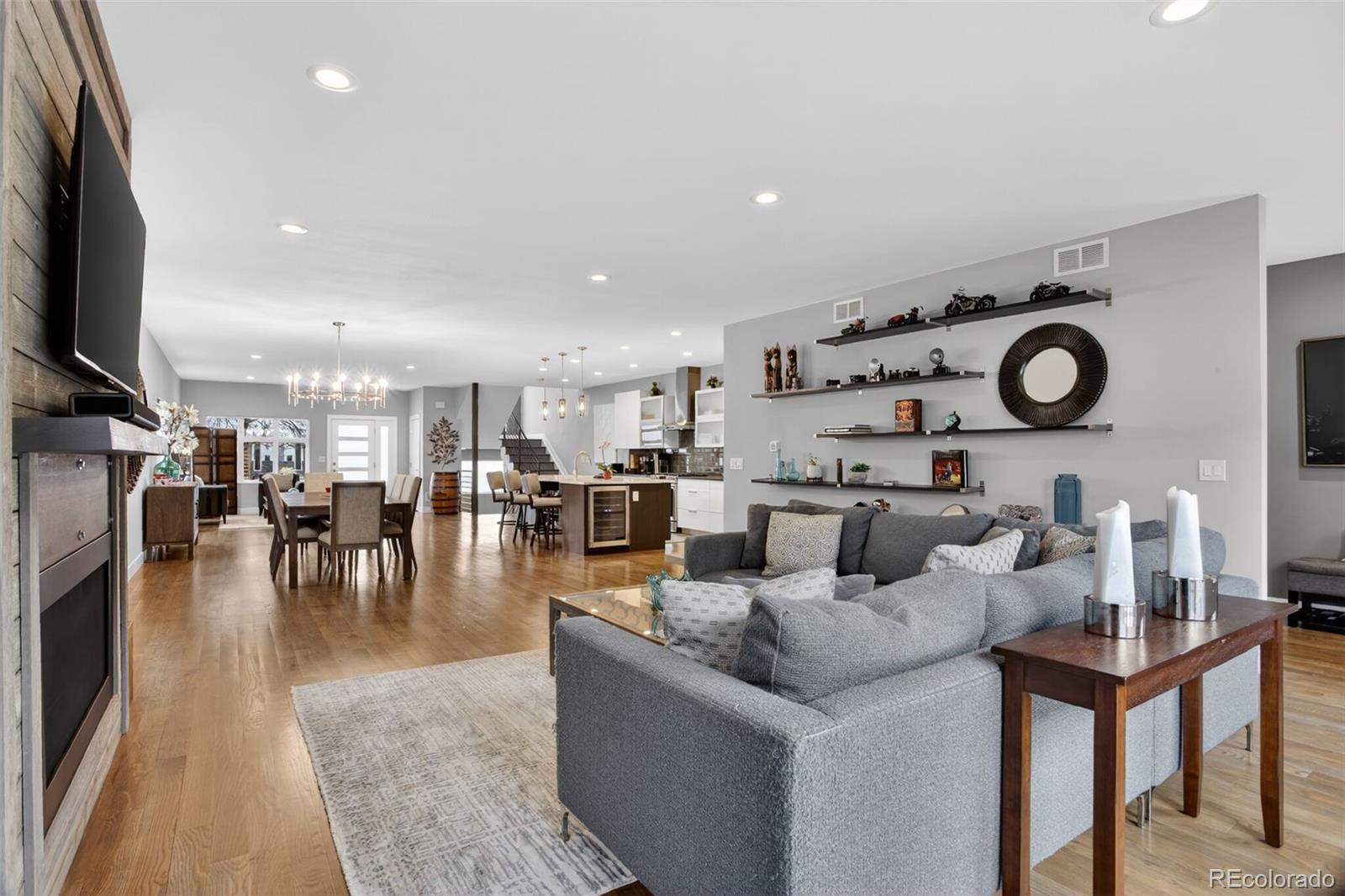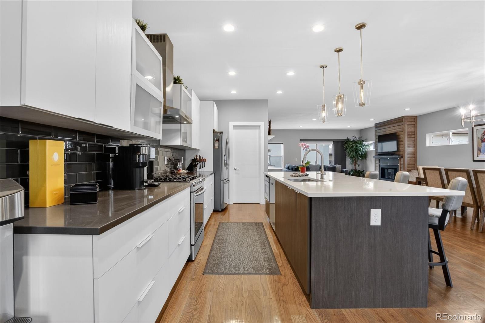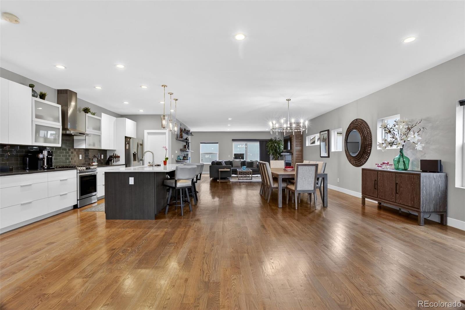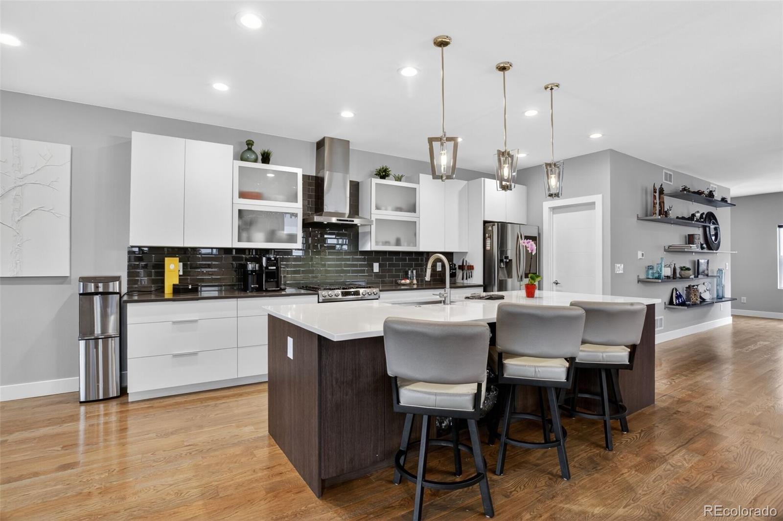 Stunningly beautiful three-story duplex with one of the largest floor plans in the area, including your very own three car garage and a fully finished basement! Richly stained hardwood floors flow seamlessly through the main level all accented by plenty of natural light streaming through various uniquely shaped windows. This open-floor concept features a contemporary kitchen with glossy flat front cabinetry, S/S appliances, a spacious quartz topped center island, complete with pendant lighting, a walk-in pantry, custom tiled backsplash and streamlined gas stove hood vent. The family room features a wall of decorative floating shelves across from a nicely textured wood encased gas fireplace and mantel area. Tucked in the corner is a powder room along with easy access to your rear patio with built-in gas BBQ. The second level features the rear primary bedroom, complete with a spa inspired five piece ensuite bathroom with a stand alone tub, spacious shower, large walk-in closet and a private rear deck. Both secondary bedrooms feature Juliet-styled balconies and their own private full bathrooms. The full-sized laundry room is also conveniently located on this level, complete with a wash sink and folding table with plenty of storage. The third level features another bedroom/office with its own balcony, a 3/4 bathroom and a large rec room with a built-in wetbar and access to your roof-top deck with spectacular mountain views. The finished basement with 9' ceilings features another large room perfect for a gym, 2nd office, or Mancave along with a 5th bedroom and bath. Countless special features are found throughout the home and outdoor deck and patio areas, bringing outdoor fun in! Easy to maintain fully fenced yard off the 3-car garage (unheard of for a duplex) with a rear service door for added security. Located within easy walking distance to local coffee shops, parks and only minutes from Downtown Denver and light rail. No added cost of an HOA-Party Wall agreement.