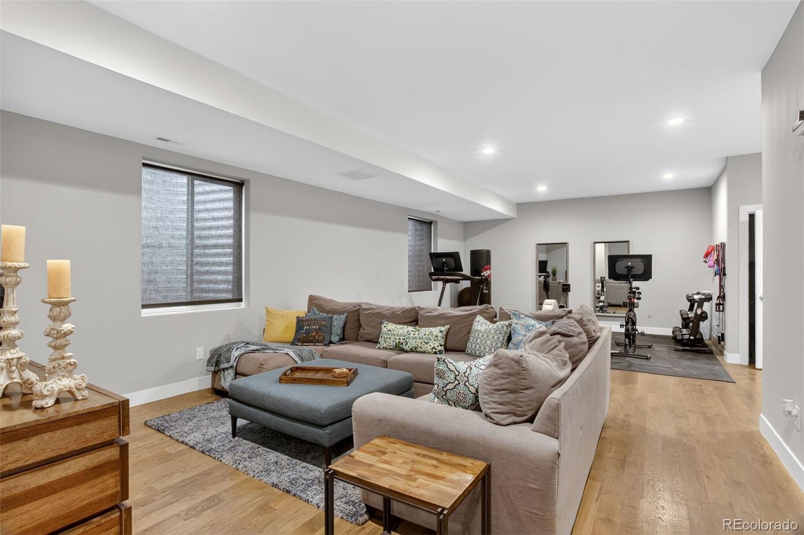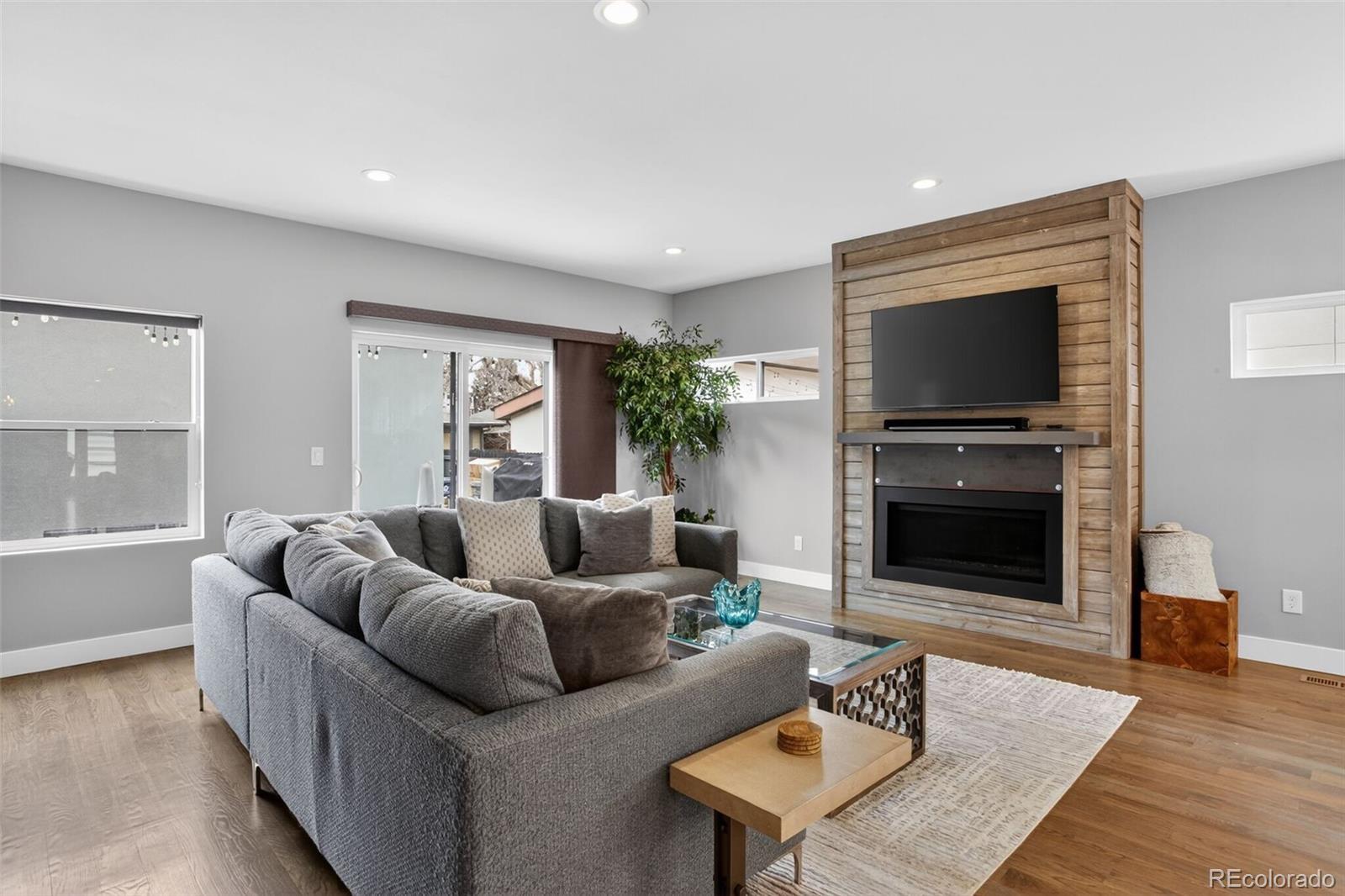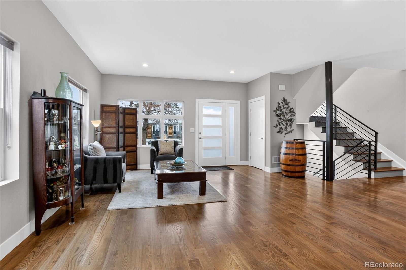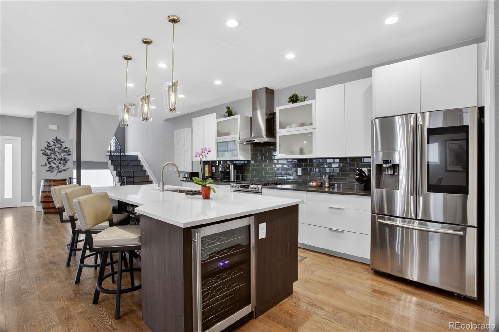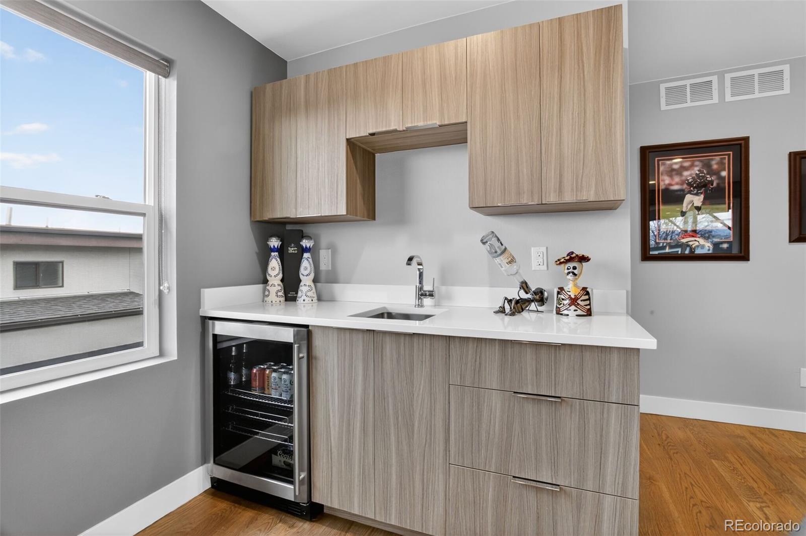 Stunningly beautiful three-story duplex with one of the largest floor plans in the area, including your very own three car garage and a fully finished basement! Richly stained hardwood floors flow seamlessly through the main level all accented by plenty of natural light streaming through various uniquely shaped windows. This open-floor concept features a contemporary kitchen with glossy flat front cabinetry, S/S appliances, a spacious quartz topped center island, complete with pendant lighting, a walk-in pantry, custom tiled backsplash and streamlined gas stove hood vent. The family room features a wall of decorative floating shelves across from a nicely textured wood encased gas fireplace and mantel area. Tucked in the corner is a powder room along with easy access to your rear patio with built-in gas BBQ. The second level features the rear primary bedroom, complete with a spa inspired five piece ensuite bathroom with a stand alone tub, spacious shower, large walk-in closet and a private rear deck. Both secondary bedrooms feature Juliet-styled balconies and their own private full bathrooms. The full-sized laundry room is also conveniently located on this level, complete with a wash sink and folding table with plenty of storage. The third level features another bedroom/office with its own balcony, a 3/4 bathroom and a large rec room with a built-in wetbar and access to your roof-top deck with spectacular mountain views. The finished basement with 9' ceilings features another large room perfect for a gym, 2nd office, or Mancave along with a 5th bedroom and bath. Countless special features are found throughout the home and outdoor deck and patio areas, bringing outdoor fun in! Easy to maintain fully fenced yard off the 3-car garage (unheard of for a duplex) with a rear service door for added security. Located within easy walking distance to local coffee shops, parks and only minutes from Downtown Denver and light rail. No added cost of an HOA-Party Wall agreement.