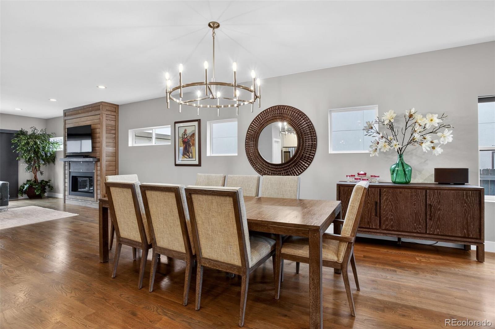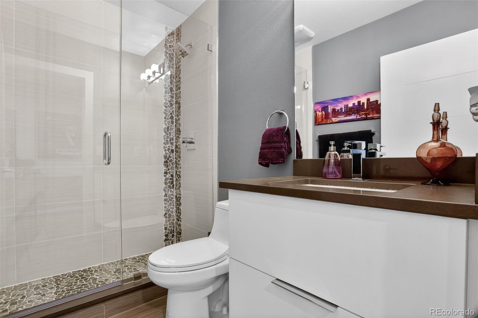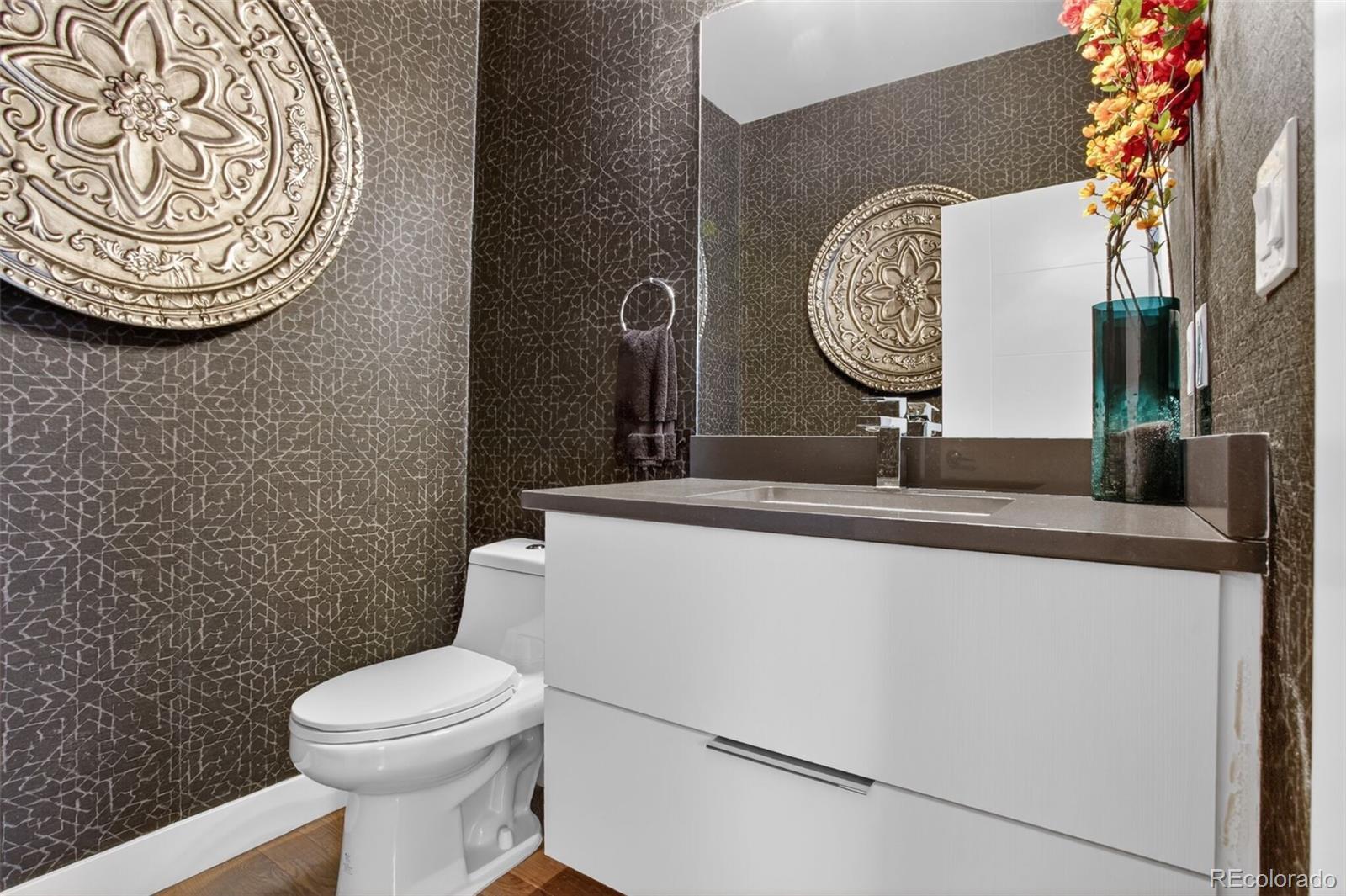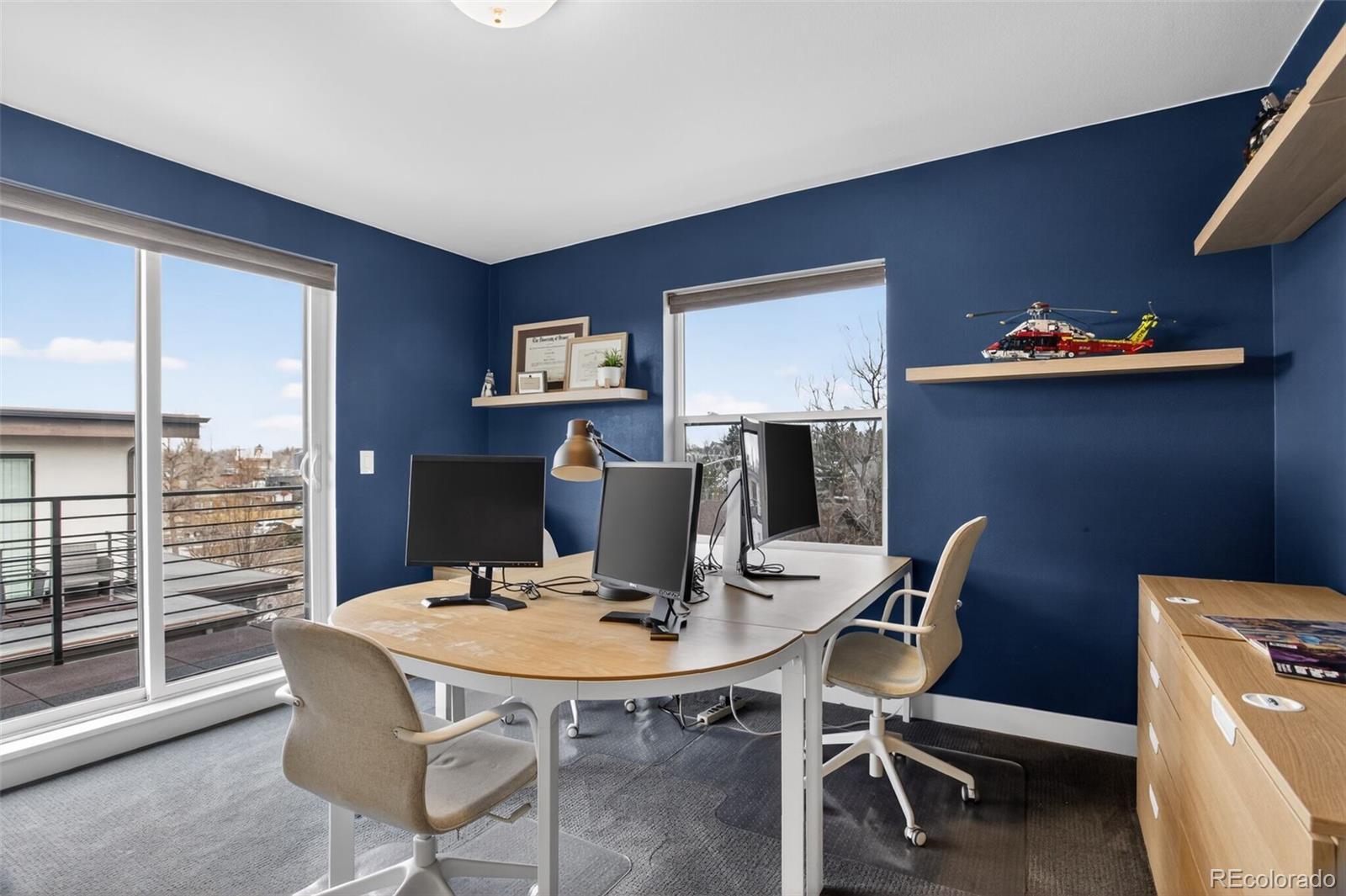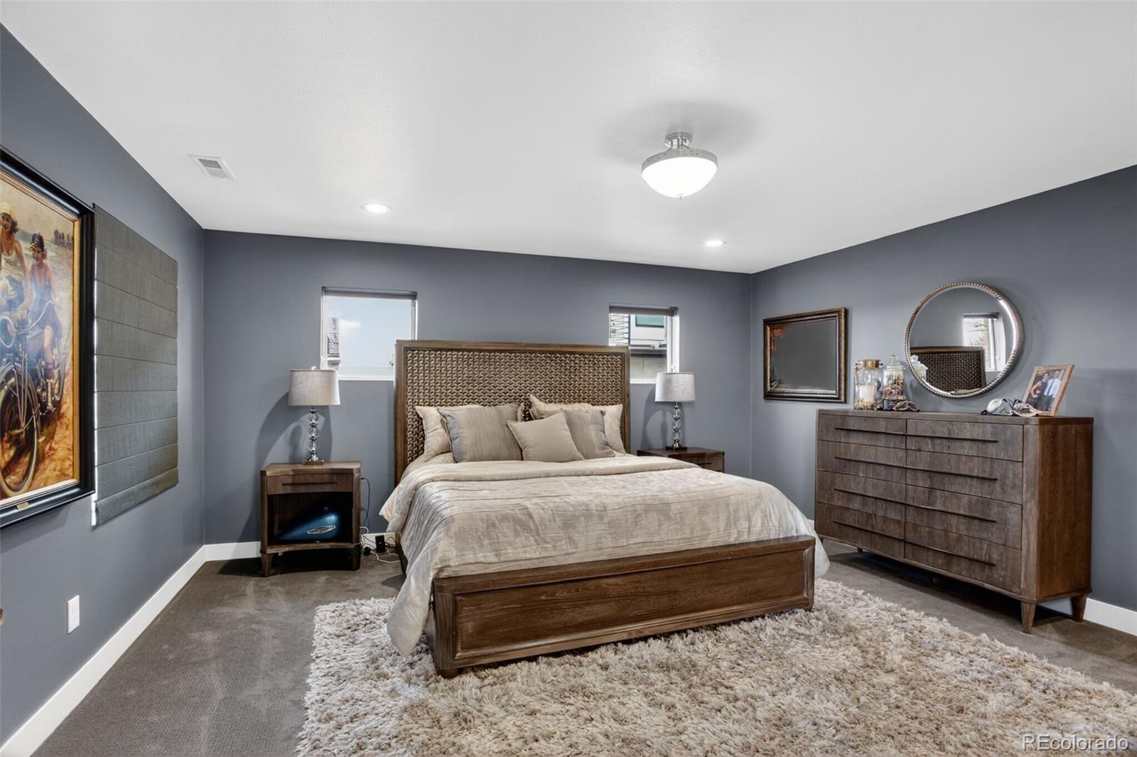 Stunningly beautiful three-story duplex with one of the largest floor plans in the area, including your very own three car garage and a fully finished basement! Richly stained hardwood floors flow seamlessly through the main level all accented by plenty of natural light streaming through various uniquely shaped windows. This open-floor concept features a contemporary kitchen with glossy flat front cabinetry, S/S appliances, a spacious quartz topped center island, complete with pendant lighting, a walk-in pantry, custom tiled backsplash and streamlined gas stove hood vent. The family room features a wall of decorative floating shelves across from a nicely textured wood encased gas fireplace and mantel area. Tucked in the corner is a powder room along with easy access to your rear patio with built-in gas BBQ. The second level features the rear primary bedroom, complete with a spa inspired five piece ensuite bathroom with a stand alone tub, spacious shower, large walk-in closet and a private rear deck. Both secondary bedrooms feature Juliet-styled balconies and their own private full bathrooms. The full-sized laundry room is also conveniently located on this level, complete with a wash sink and folding table with plenty of storage. The third level features another bedroom/office with its own balcony, a 3/4 bathroom and a large rec room with a built-in wetbar and access to your roof-top deck with spectacular mountain views. The finished basement with 9' ceilings features another large room perfect for a gym, 2nd office, or Mancave along with a 5th bedroom and bath. Countless special features are found throughout the home and outdoor deck and patio areas, bringing outdoor fun in! Easy to maintain fully fenced yard off the 3-car garage (unheard of for a duplex) with a rear service door for added security. Located within easy walking distance to local coffee shops, parks and only minutes from Downtown Denver and light rail. No added cost of an HOA-Party Wall agreement.