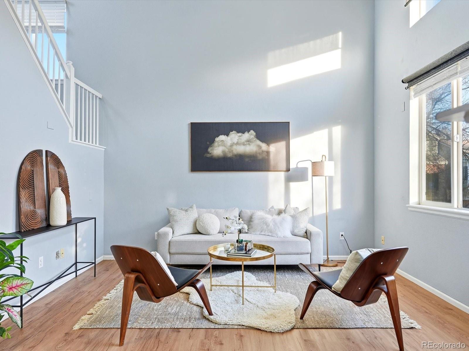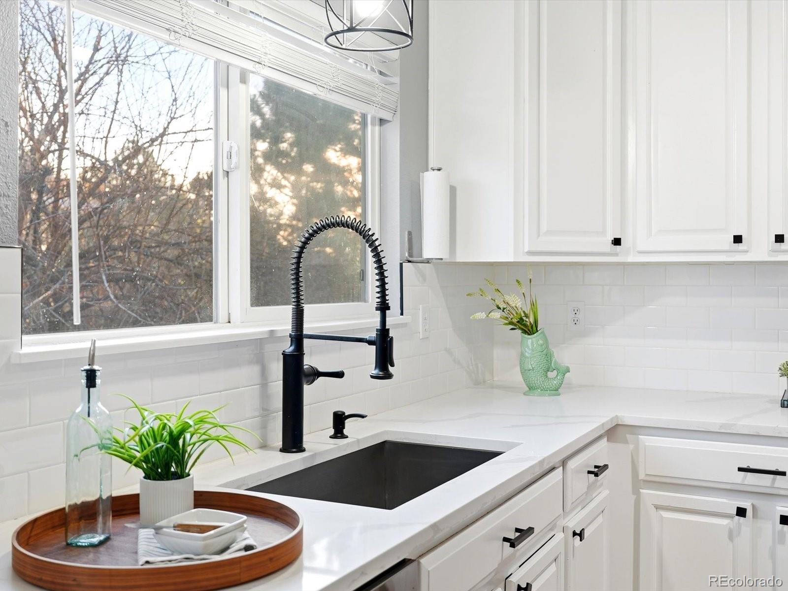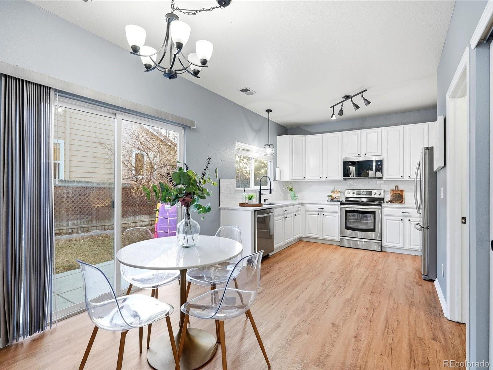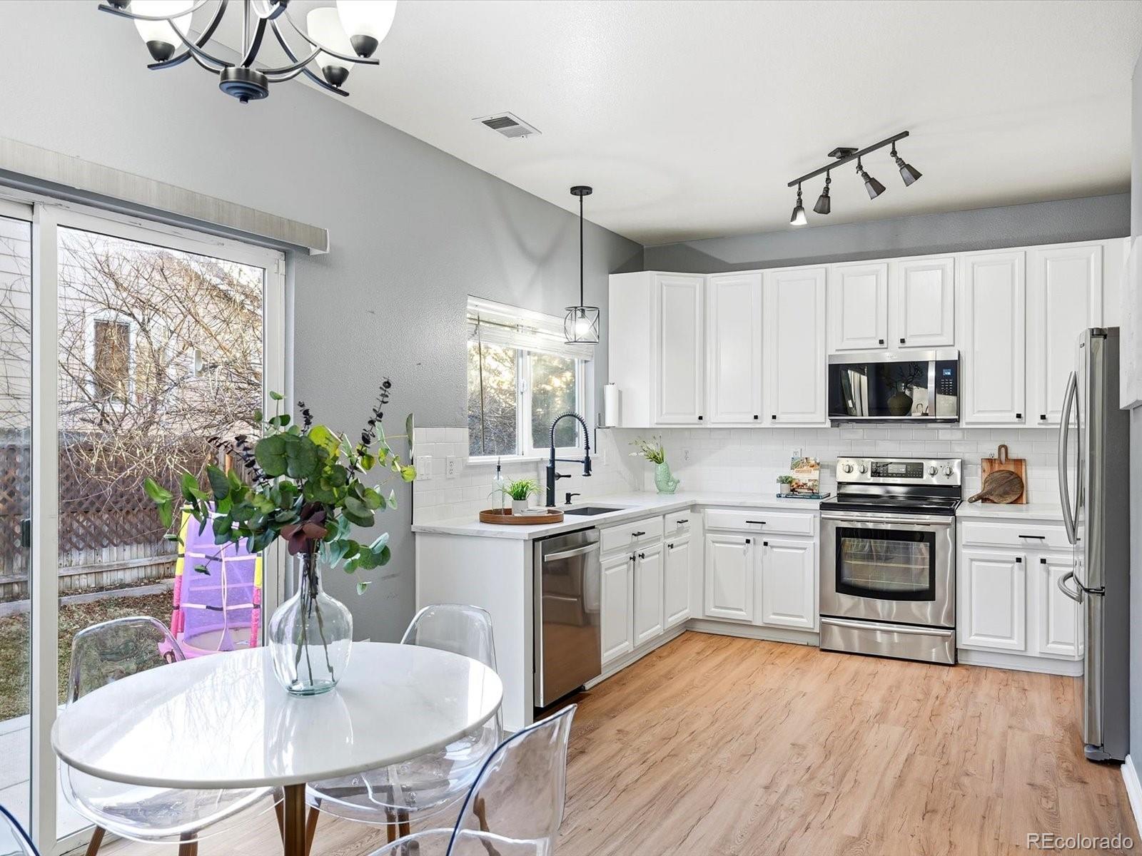 Welcome to your sun-drenched sanctuary in the heart of the highly-coveted Bluffs at Saddle Rock Ridge. Positioned perfectly on a premier corner lot, this light and airy residence greets you with dramatic vaulted ceilings and an open-concept layout designed for both seamless entertaining and everyday comfort. The heart of the home has been stunningly transformed; the recently remodeled kitchen is a dream, boasting refreshed white 42" cabinetry, brand-new quartz countertops, and a crisp, stylish subway tile backsplash. Anchored by a sleek farmhouse sink and modern black hardware, this culinary space overlooks the dining area and backyard. Transition effortlessly to the living area to cozy up by the unique three-sided gas fireplace, or head upstairs to the versatile living quarters. The primary suite is a true retreat, featuring a generous layout and a private ensuite bath complete with a double vanity and a soaking garden tub. Two additional bright bedrooms are served by a second full upstairs bathroom. Enjoy peace of mind with newer carpet installed throughout the upstairs and a versatile hallway nook that offers the perfect footprint for a reading corner or tech station. Outside, your living space extends to a newly updated backyard with an expansive, brand-new patio and professional landscaping. Unbeatable Lifestyle & Location: Enjoy the ultimate convenience of schools all within a short, walkable distance. The neighborhood is a recreation lover's dream, featuring Saddle Rock Ridge Parks with playgrounds and immediate access to the Saddle Rock Ridge Trail system, which connects to the West Tollgate Creek Trail for miles of biking and hiking. With Southlands Mall just minutes away and effortless access to E-470, this home offers the perfect balance of suburban tranquility and urban accessibility.