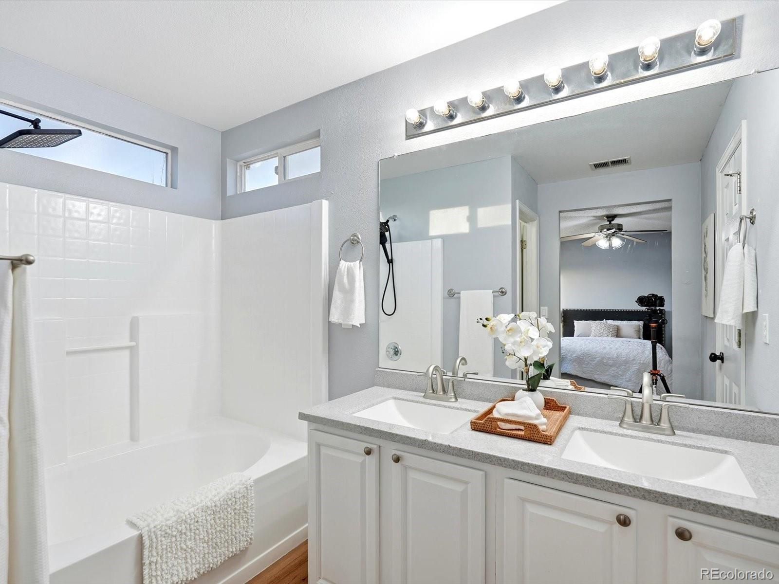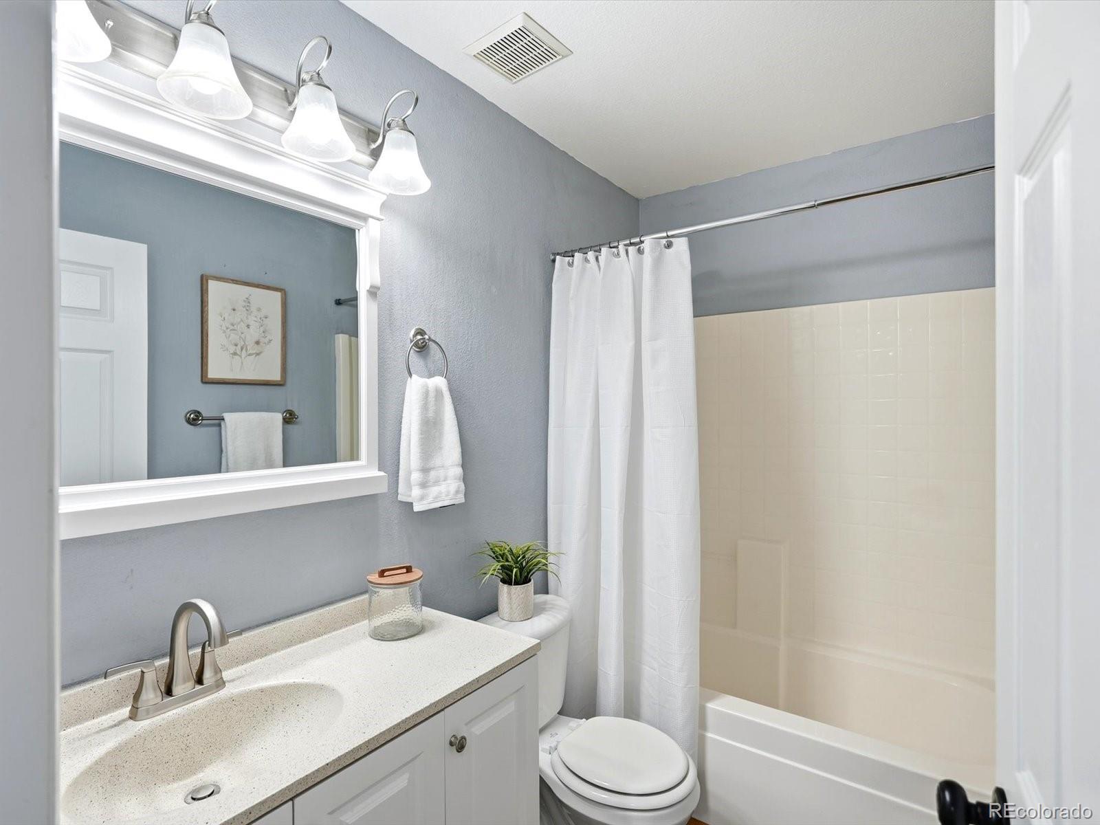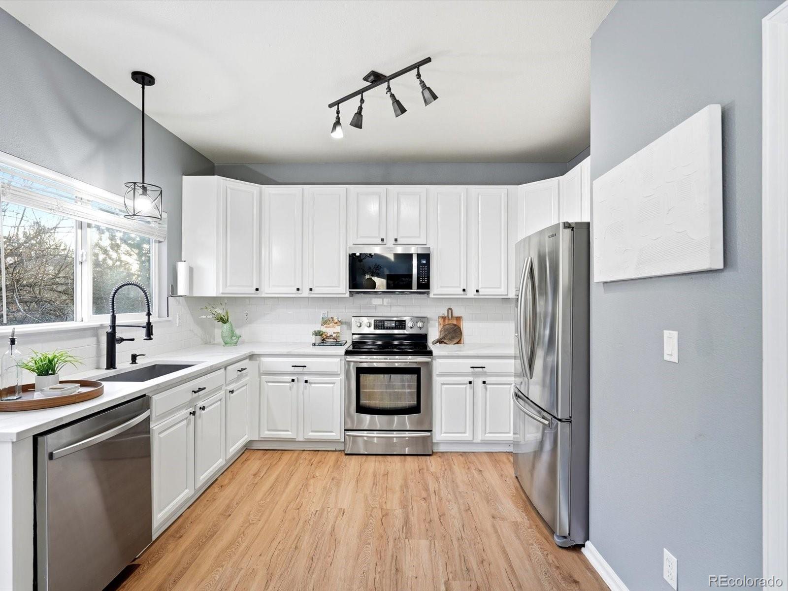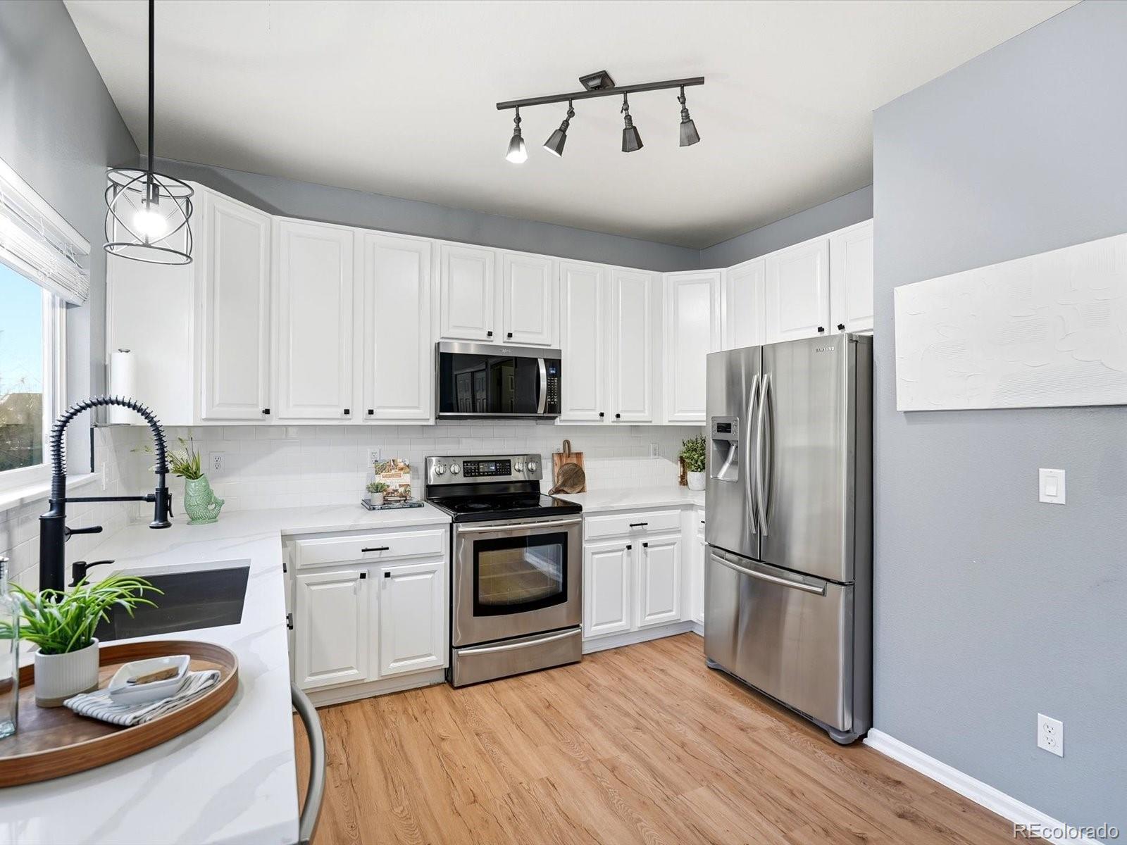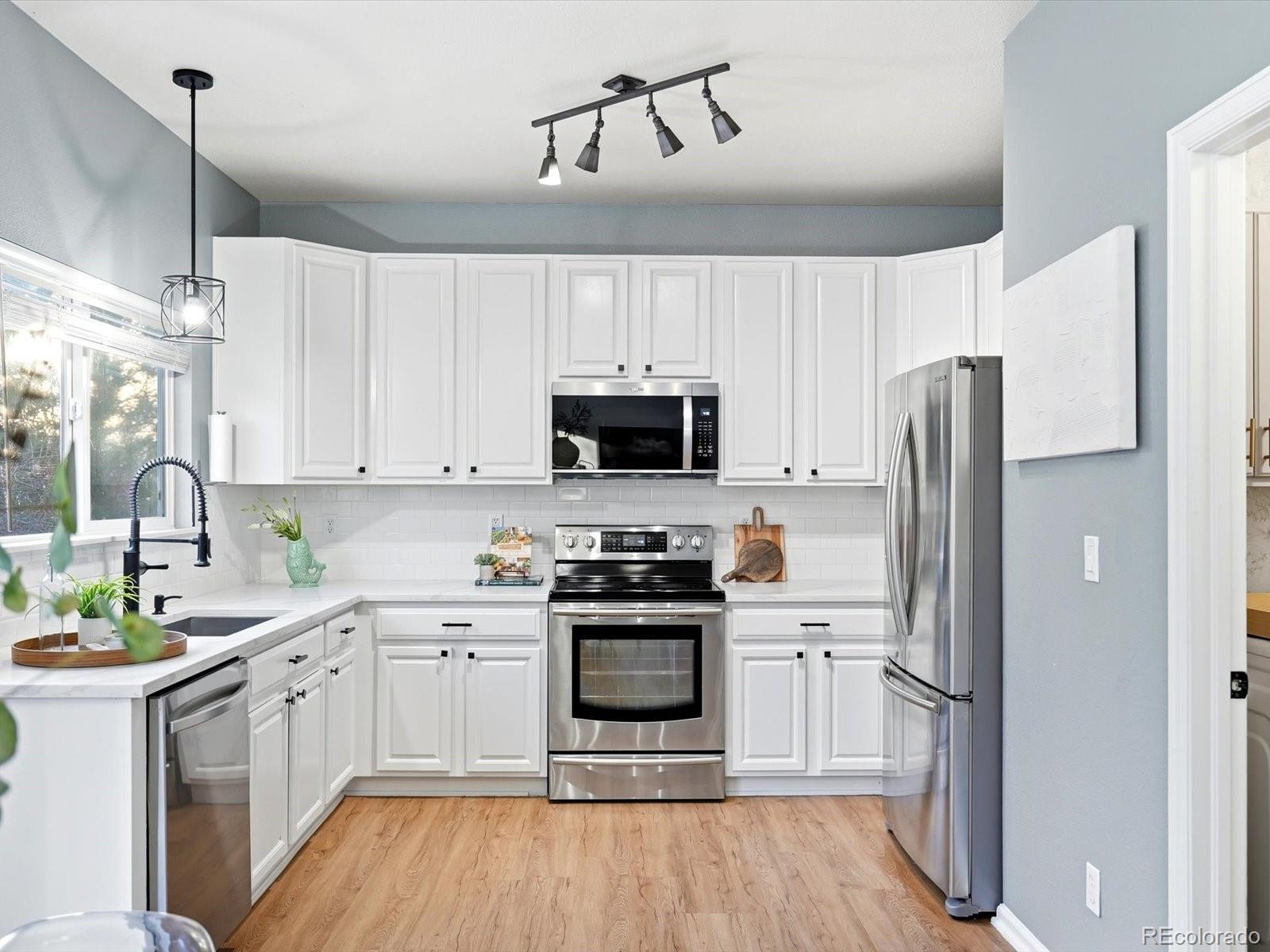 Welcome to your sun-drenched sanctuary in the heart of the highly-coveted Bluffs at Saddle Rock Ridge. Positioned perfectly on a premier corner lot, this light and airy residence greets you with dramatic vaulted ceilings and an open-concept layout designed for both seamless entertaining and everyday comfort. The heart of the home has been stunningly transformed; the recently remodeled kitchen is a dream, boasting refreshed white 42" cabinetry, brand-new quartz countertops, and a crisp, stylish subway tile backsplash. Anchored by a sleek farmhouse sink and modern black hardware, this culinary space overlooks the dining area and backyard. Transition effortlessly to the living area to cozy up by the unique three-sided gas fireplace, or head upstairs to the versatile living quarters. The primary suite is a true retreat, featuring a generous layout and a private ensuite bath complete with a double vanity and a soaking garden tub. Two additional bright bedrooms are served by a second full upstairs bathroom. Enjoy peace of mind with newer carpet installed throughout the upstairs and a versatile hallway nook that offers the perfect footprint for a reading corner or tech station. Outside, your living space extends to a newly updated backyard with an expansive, brand-new patio and professional landscaping. Unbeatable Lifestyle & Location: Enjoy the ultimate convenience of schools all within a short, walkable distance. The neighborhood is a recreation lover's dream, featuring Saddle Rock Ridge Parks with playgrounds and immediate access to the Saddle Rock Ridge Trail system, which connects to the West Tollgate Creek Trail for miles of biking and hiking. With Southlands Mall just minutes away and effortless access to E-470, this home offers the perfect balance of suburban tranquility and urban accessibility.