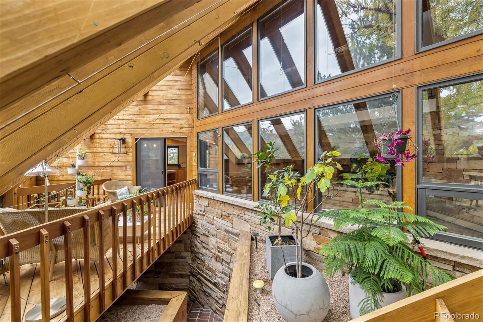 Modern Mountain Masterpiece in Ken-Caryl Ranch. Perched on an elevated .65-acre site backing to protected open space, this modern retreat pairs sophisticated design with cinematic views in every direction. Wrapped in cedar and crafted with custom finishes throughout, the residence blends timeless materials with contemporary lines for a look that’s both warm and refined. A dramatic glass atrium ushers in natural light and year-round greenery; its passive-solar design helps keep winter heating remarkably low. Inside, the great room is a showpiece—hickory floors, dual-sided stacked-flagstone fireplace, cedar ceilings, and sleek black-iron railings amplified by a statement modern chandelier. The chef’s kitchen is made for effortless entertaining with an island cooktop, bar fridge, and walk-in pantry, while the window-lined dining area feels like dining in the treetops. Slide open to one of two expansive decks for al fresco lounging above the valley. Upstairs, the tranquil primary suite captures panoramic vistas of city lights and golden hills. Secondary bedrooms feature vaulted ceilings and striking outlooks; a renovated bath channels spa serenity with soft-gray vanities and textured tile. A custom built-in office, an oversized laundry/mudroom, and thoughtful details at every turn elevate daily living. Outside, a stone patio nestles beneath mature trees—your private vantage point within nature. With direct trail access and exclusive community amenities (pools, tennis, fitness center, equestrian facilities, and 5,000 acres of open space), this is Ken-Caryl living at its finest: private, polished, and perfectly connected to the outdoors.