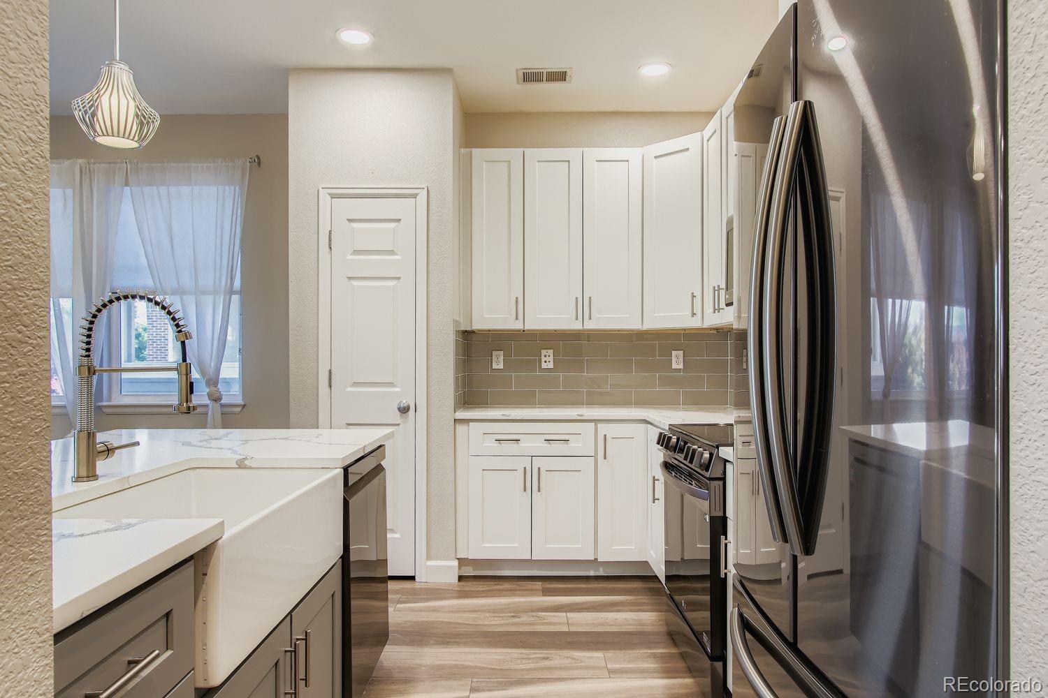 Move in before Christmas! Get over and see this gorgeous place! Price recently reduced! Carefree Colorado living at its finest! You must see this gorgeous home in the Village of Five Parks! Stunning finishes throughout this condo including granite countertops, custom cabinetry, black stainless steel appliances, new flooring, custom tile work in the bathrooms and kitchen, fully updated primary and hall bathrooms, custom wall fireplace in living room, newer lighting, custom window coverings, large walk-in closet with organizer system and much more. No expense was spared in the remodel. Brand new furnace and central air installed in August of 2025. Two patios, one off the living/dining room and one off the primary bedroom, both with mountain views. Nicely sized laundry room with included washer and dryer. And to top it all off, a HUGE attached nearly 3 car garage with room for two cars, and a large shop or parking for motorcycles or toys. The Village of Five Parks also includes a ton of amenities, pool, walking trails, large community clubhouse, restaurants and more! No yard work, no snow shoveling, lock it up and leave or just enjoy the benefits of care-free living! Minutes from the mountains, close to Boulder, Standley Lake and all that Arvada has to offer! This home is one-of-a-kind, and is waiting for you to make it yours before the holidays! Do not wait to schedule your showing! This is a must see!