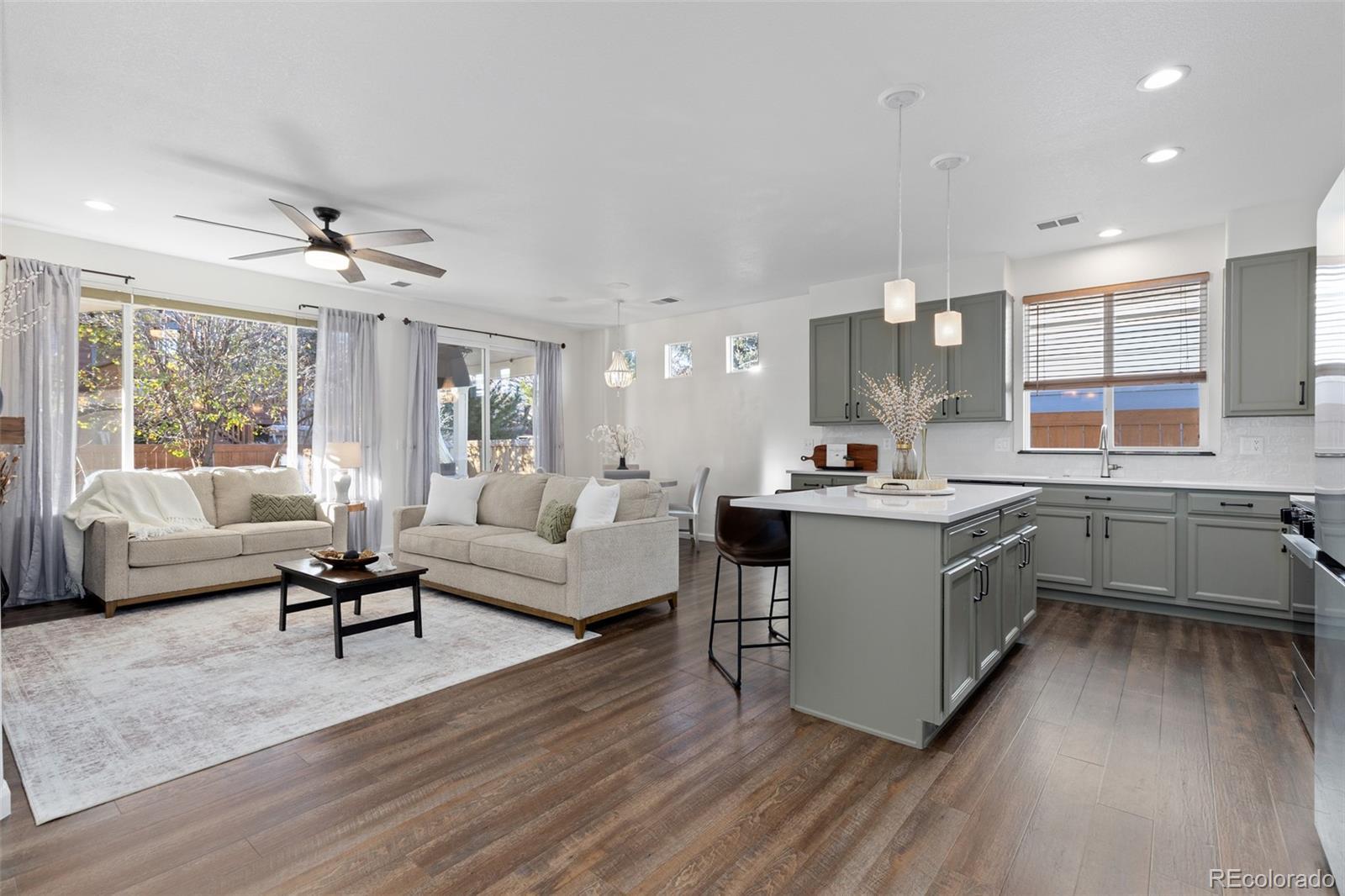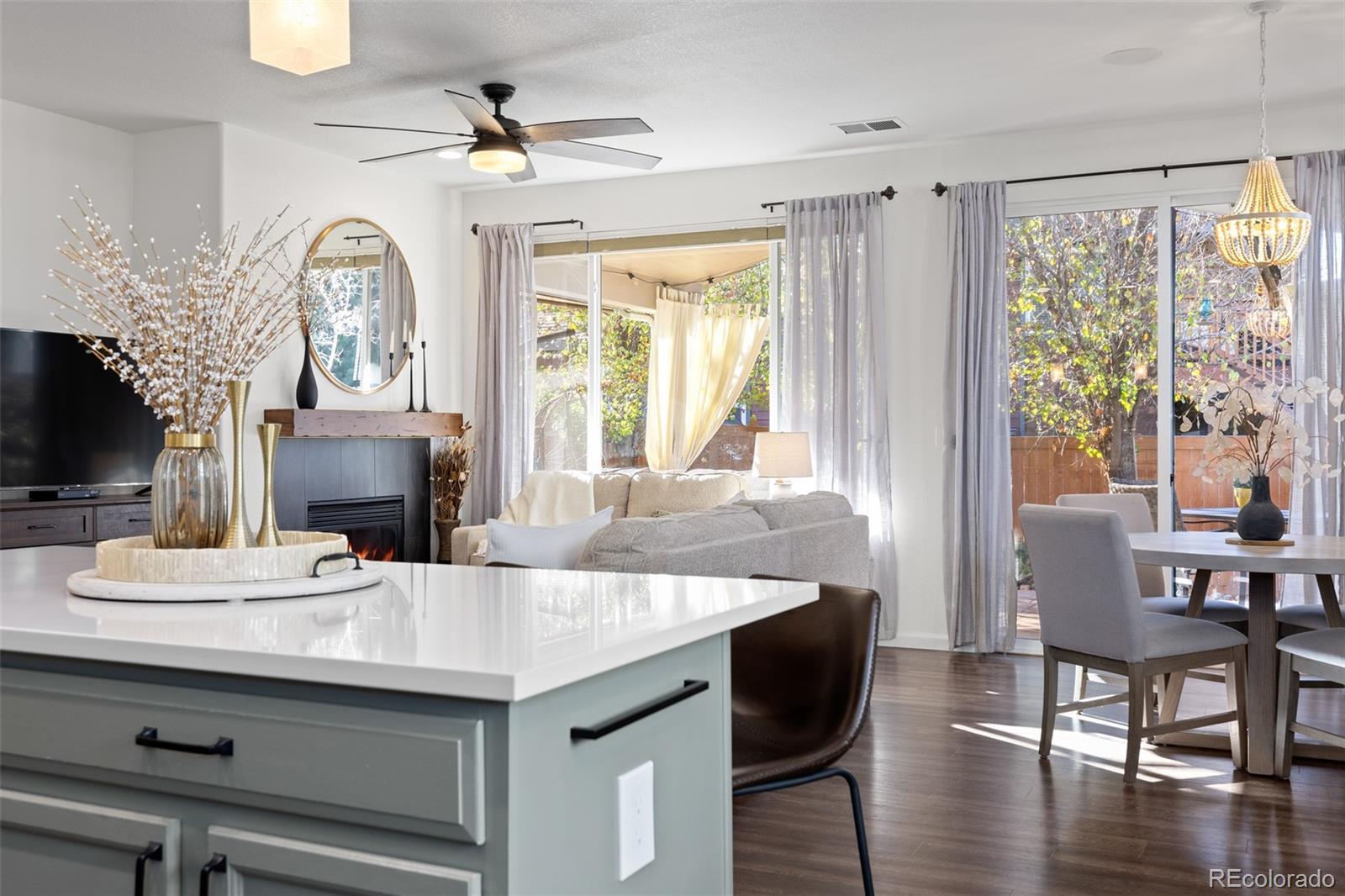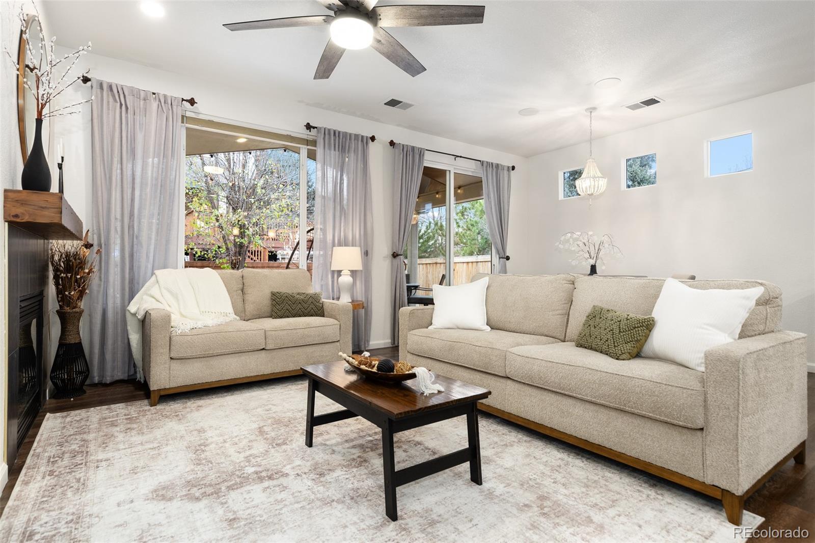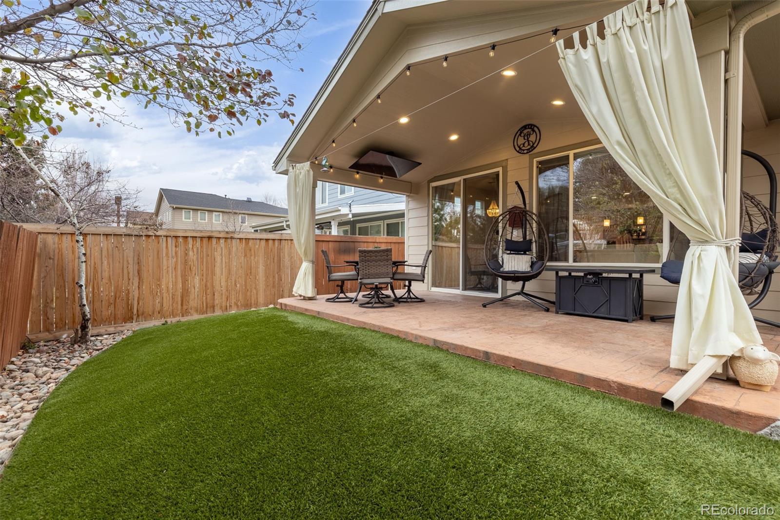 Enjoy the comfort and ease of main level living in this updated ranch style home. This home has been thoughtfully designed to provide low maintenance living without sacrificing the value of living in a single family home. The front and backyard have been landscaped with artificial turf providing maintenance free lawn care. Upon entry you’ll notice the thoughtful design where a guest bedroom, bathroom, and den/office/flex room are on one side of the house. On the other side of the home you’ll find the open concept kitchen/living/dining room, main floor laundry, as well as the primary bedroom and en suite. This unique design creates separation of space for comfort and privacy. The bathrooms have been updated with new quartz counters, mirrors, light fixtures, and paint. The kitchen has also been updated with all new stainless steel appliances, quartz counters, paint, new hardware, and lighting. The large kitchen island is perfect for gatherings and provides additional seating/eating space. The gas fireplace creates a cozy ambiance in the living room with the flick of a switch. The dining area leads right out to the covered back patio perfect for entertaining inside and out. The backyard is lined with aspen trees and a peaceful rock fountain adjacent to the covered stamped concrete patio with a drop down motorized TV. This oasis is perfect for the person that wants to enjoy beautiful outdoor spaces without all the work. This low-maintenance home offers a lock-and-go lifestyle, giving you the freedom to travel without worrying about upkeep. Come make this house-your HOME!