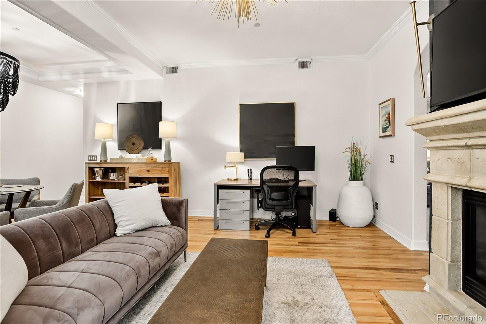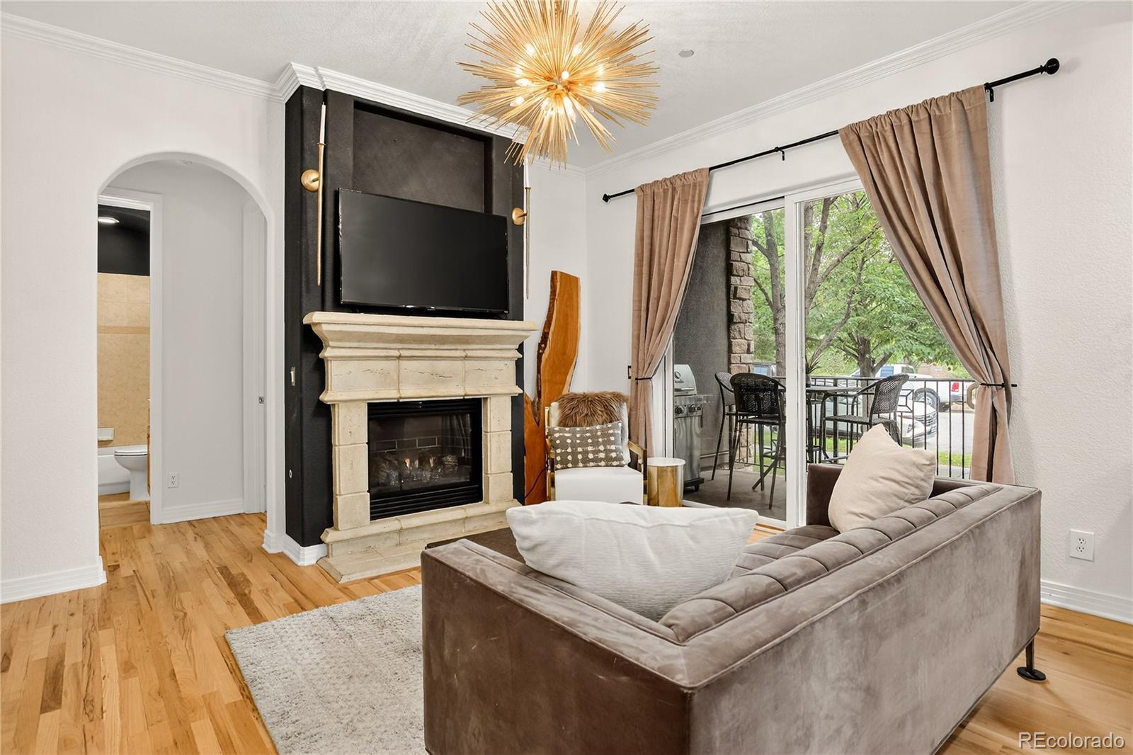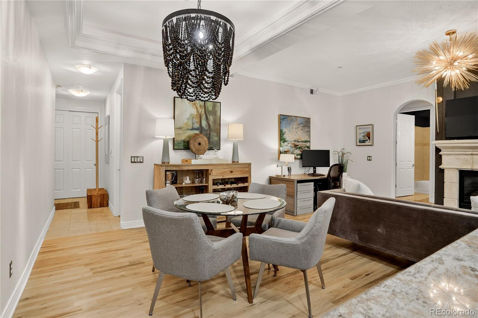 Welcome to this beautifully appointed 2-bedroom, 2-bath condo in the heart of Cherry Creek North, where upscale living and unmatched convenience come together. Step inside to rich hardwood floors that flow through the open-concept kitchen, dining, and living area. The kitchen shines with slab granite countertops, abundant cabinetry, pantry storage, newly replaced gas range, and stainless steel appliances. Elegant crown molding, tray ceiling details, and a stone-accented gas fireplace create a designer feel throughout the space. The spacious primary suite is a true retreat, featuring a 5-piece bath with a large soaking tub, dual sinks, tile flooring, and a generous walk-in closet. The secondary bedroom is served by a full bath with tile finishes. Recent upgrades include new interior paint, designer light fixtures, recently insulated ceiling to reduce noise, and a new washer and dryer. Enjoy the convenience of a large laundry room, two heated garage parking spaces, and elevator access. The oversized patio offers a private, tranquil escape, surrounded by mature trees. Situated on a quiet street yet just blocks away from the very best of Cherry Creek North—boutique shopping, art galleries, fine dining, tennis, parks, and the Cherry Creek Trail—you’ll enjoy the perfect balance of sophistication and lifestyle. Additional highlights include: Low HOA dues at just $340/month. Furniture negotiable. Don’t miss the opportunity to call this stunning condo home and experience all that Cherry Creek has to offer!