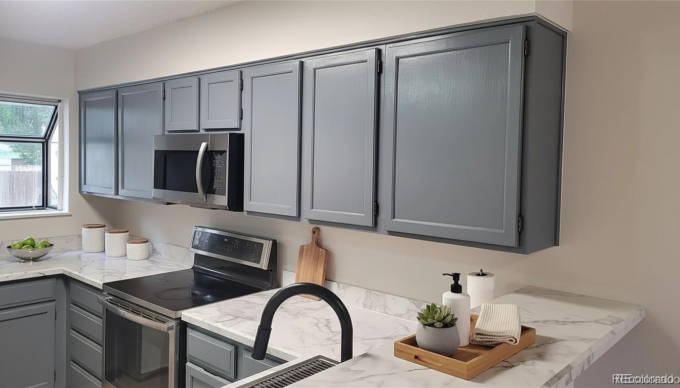 Elegant Townhome in Prime Denver Location. Experience urban charm in this beautifully remodeled 2-story townhome. Live in a spacious open layout, full of natural light all day and with modern comforts. Newly Renovated: Kitchen - Brand-new beveled-edge laminate countertops. New large single-basin sink and gooseneck faucet. Refinished cabinets, bright new overhead lighting, and new microwave with outside vent. Bathrooms - Both bathrooms have newly refinished vanities, new faucets, new lighting. Downstairs bathroom has new vanity top to match the kitchen. Upstairs bathroom has new tub and shower, and floor-to-ceiling large format tile. Downstairs has new wood-laminate flooring and new 3.5 inch baseboards and fresh paint on all walls and doors. The expansive living room boasts a wood-burning stone fireplace and new ceiling fan. Upstairs has new plush carpet and fresh paint on all walls and doors. The standard bedroom has dual closets and nestles a gorgeous tree just outside the window. The master bedroom reaches up to vaulted ceilings and comes with a new ceiling fan. Modern Comforts: Forced air heating from a furnace newly installed last year. Central AC and double-pane windows. An oversized garage with cabinets and workspace-countertop. An additional large storage room off the garage provides vast room for all your extra things, plus washer/dryer. Prime Location: Just 20 minutes from downtown Denver and 15 minutes from DTC, with nearby light rail. Outdoor Oasis: Runs along High Line Canal Trail, a favorite area for joggers, cyclists, and weekend walkers. Enjoy the gated pool and dog parks. Nature and greenery abounds.