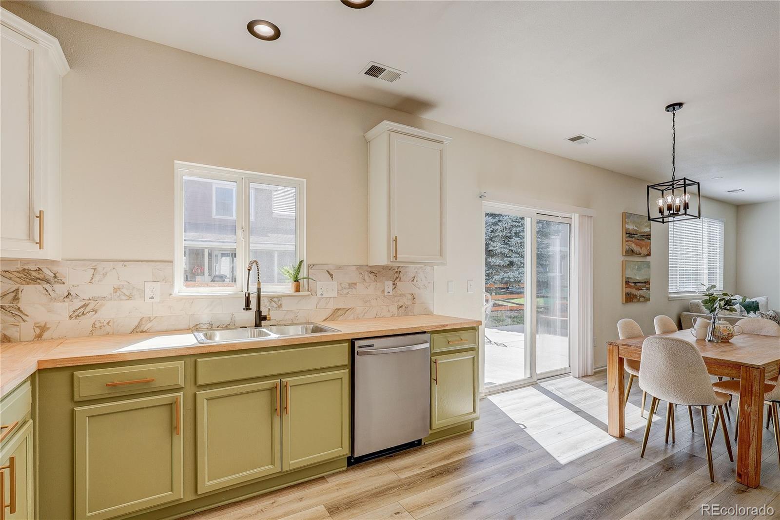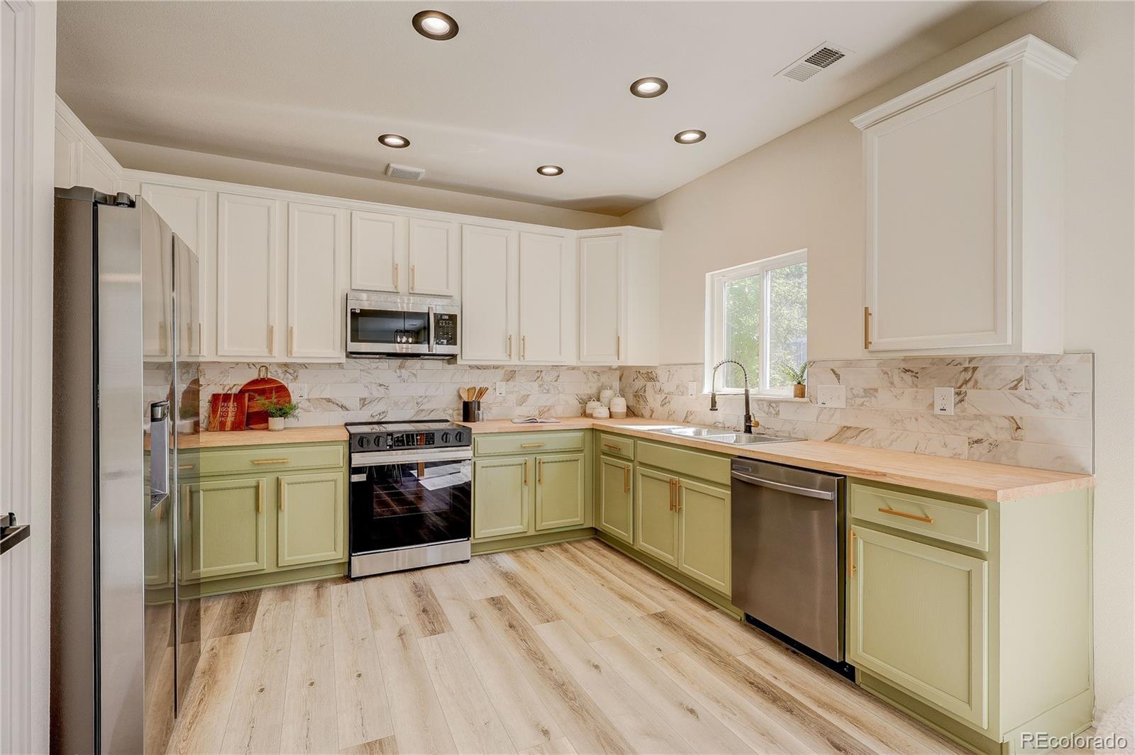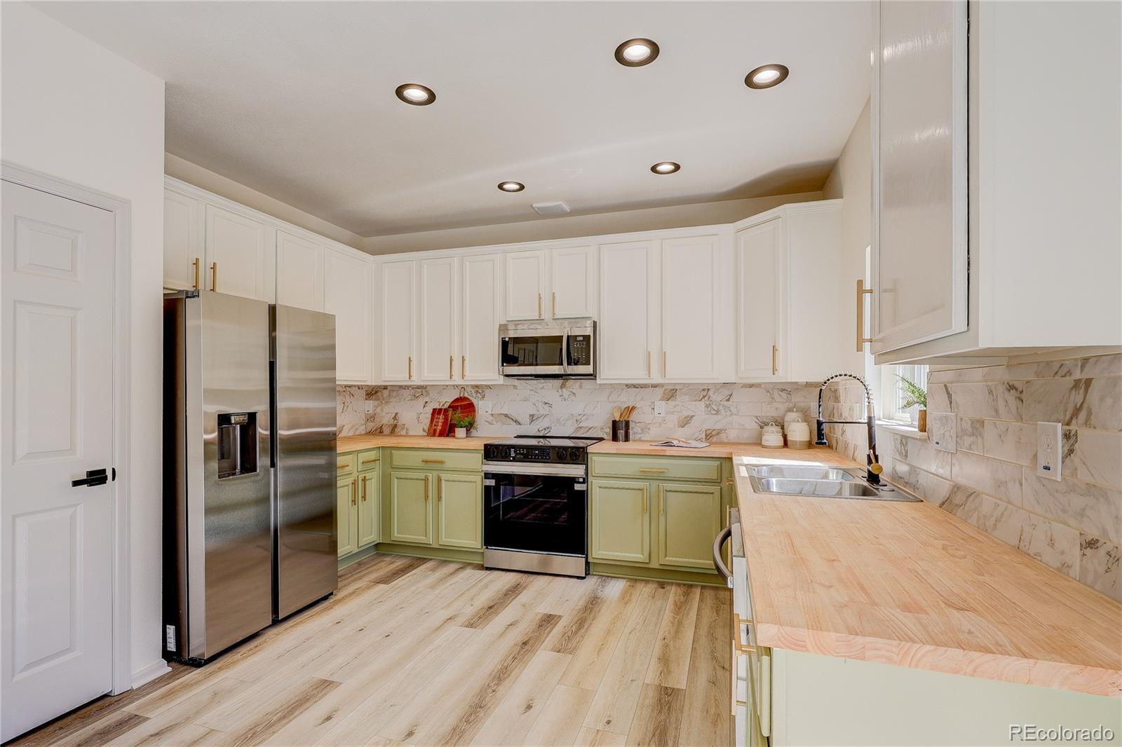 Step inside this tastefully updated property, where classic Spanish elegance meets modern updates. The main level boasts brand-new luxury vinyl flooring throughout, complemented by fresh interior paint for a bright, inviting feel. The heart of the home is the updated kitchen, featuring refreshed cabinets with sleek butcher block countertops and all-new stainless steel appliances: an electric stove, microwave, dishwasher, and refrigerator. Enjoy a combination living and family room that shares a double sided gas fireplace and the convenient downstairs powder bath adds everyday ease. Upstairs, all four generously sized bedrooms await, each with plush new carpet for ultimate comfort. The primary suite is a serene retreat with its own private full bathroom. The other three bedrooms share a well-appointed full hallway bathroom – ideal for families or guests. Outside, the curb appeal is undeniable with fresh stucco siding, new exterior paint, and an authentic tile roof. Relax in the friendly, fenced backyard oasis, complete with a large concrete patio perfect for barbecues or quiet evenings. The two-car attached garage provides plenty of storage and parking, while the prime location keeps you close to Aurora's vibrant shopping, parks like Cherry Creek State Park, and the city's 6,000 acres of open space. In today's buzzing Aurora market – where homes sell quickly with great buyer opportunities – this updated gem won't last long! 4 Beds | 3 Baths | Move-In Ready. Contact us today to schedule a viewing and start living the Aurora lifestyle!
