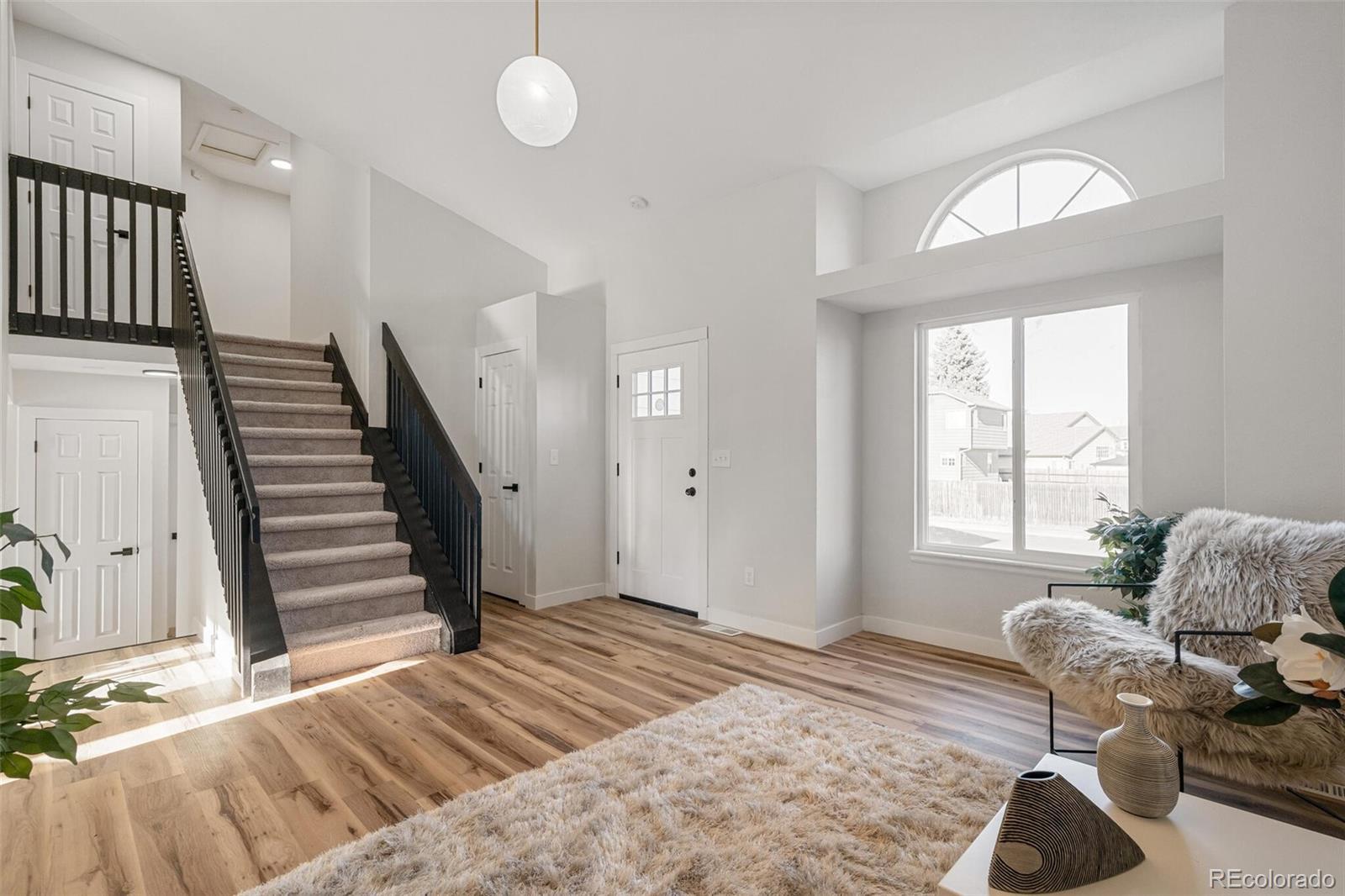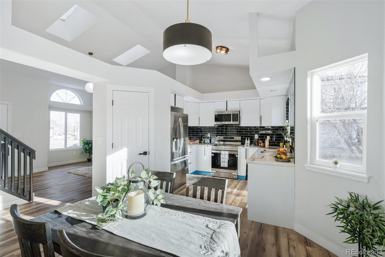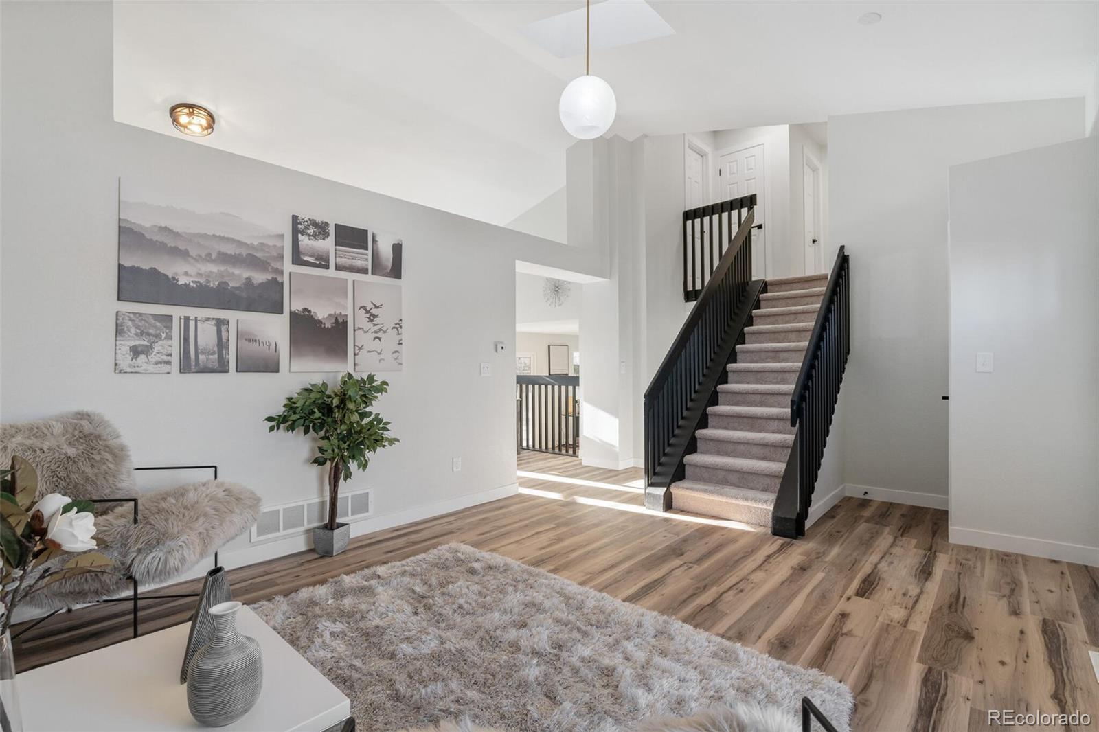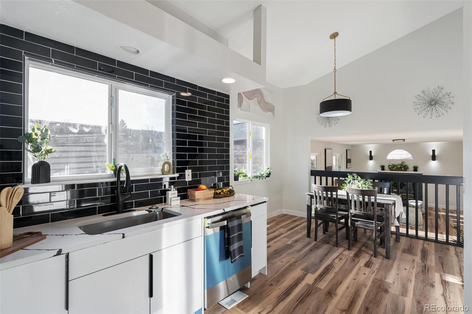 Welcome to this beautifully updated home located in the highly desirable Cherry Creek School District, offering the added benefit of NO HOA. With over 2,100 square feet of thoughtfully designed living space, this home features high vaulted ceilings and a bright, open layout that creates an inviting, modern atmosphere. The open-concept kitchen flows effortlessly into the main living and dining areas, making it ideal for both everyday living and entertaining. The kitchen has been modernly updated with new cabinets, quartz countertops, a stylish backsplash, and stainless-steel appliances, while the bathrooms showcase contemporary tile finishes. Recent upgrades also include new luxury vinyl plank flooring on the main level and new carpet upstairs and in the basement, providing style, durability, and comfort throughout the home. A spacious 2-car garage adds everyday convenience and ample storage. The finished basement features a separate entrance from the garage and includes a non conforming bedroom, bathroom, and laundry area, offering excellent potential for multi-generational living, guest privacy, or additional flexible space. The home also includes two laundry areas — one on main level and one in the basement — for added convenience and functionality. Step outside to a fully fenced backyard spanning over 6600 square feet, complete with a covered patio that is perfect for outdoor entertaining, gardening, or creating your own private retreat. With its functional layout, extensive modern upgrades, generous yard, and prime location near top-rated schools, shopping, dining, and major amenities, this move-in-ready home offers exceptional value. Schedule your private showing today.