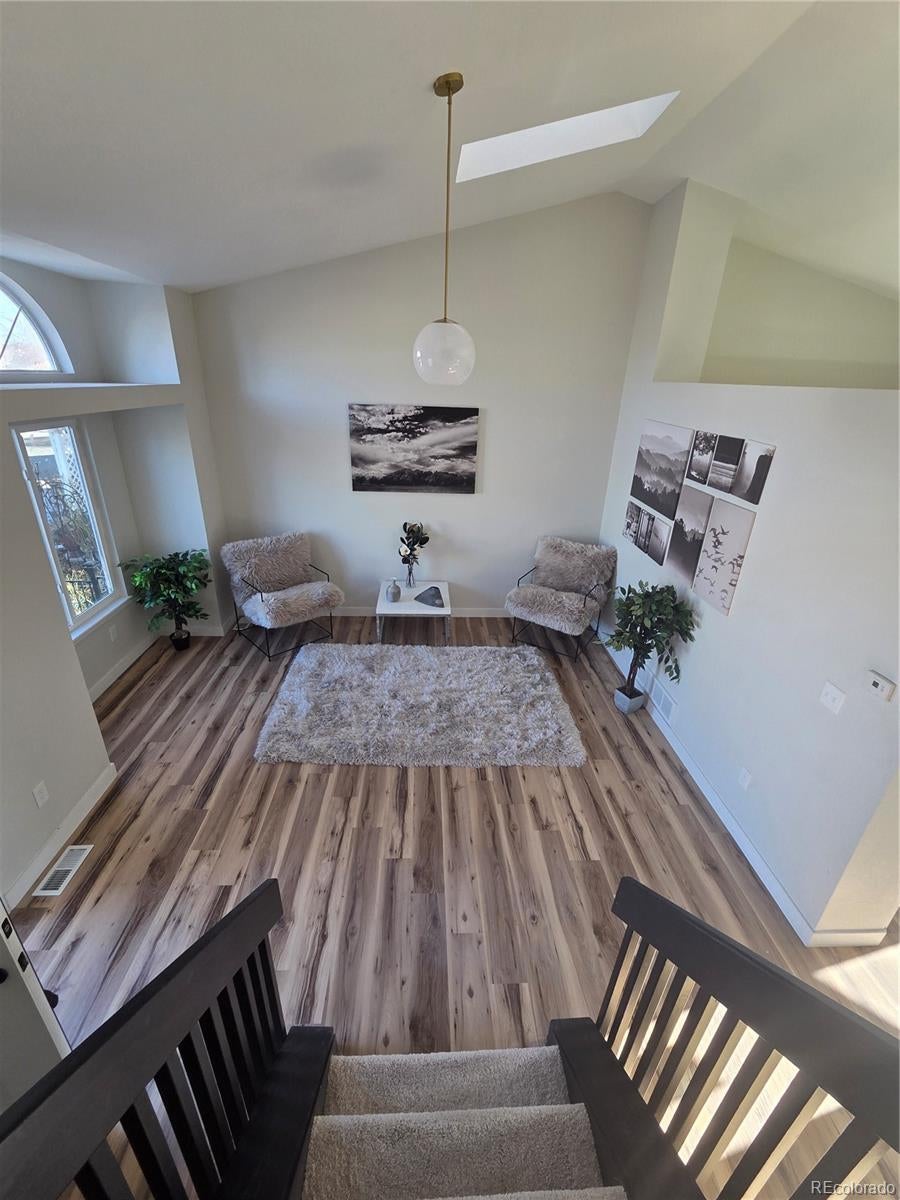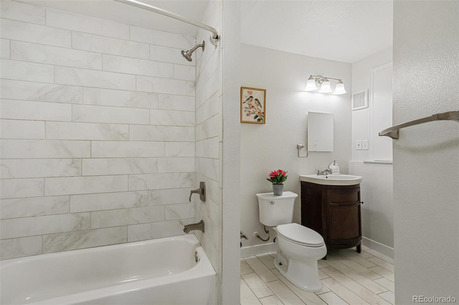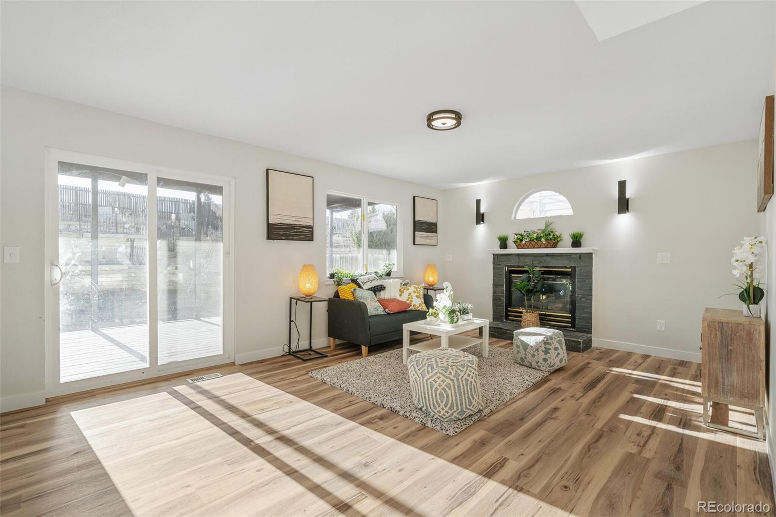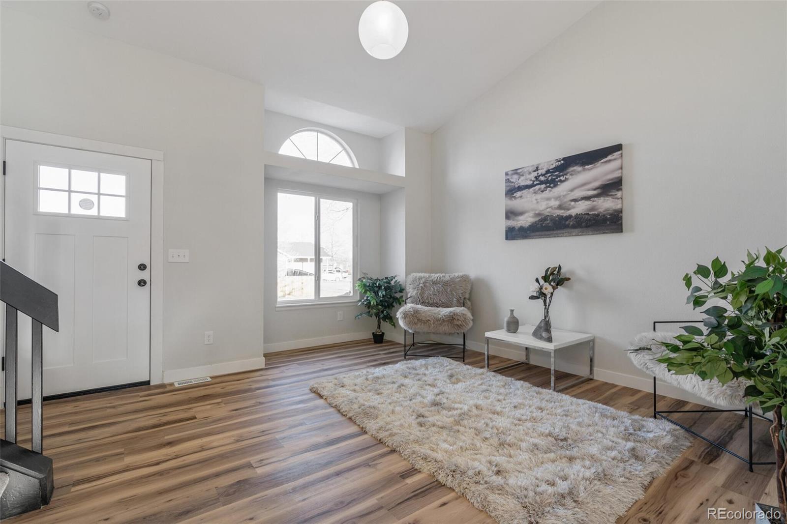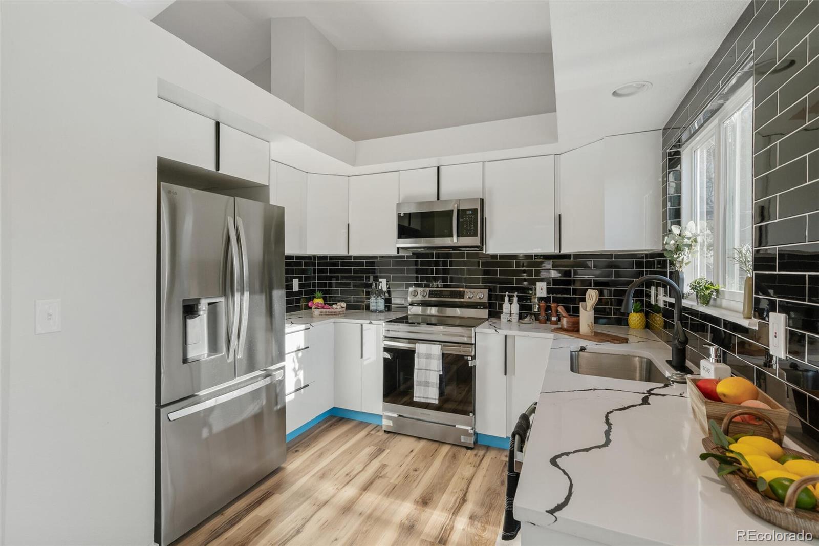 Welcome to this beautifully updated home located in the highly desirable Cherry Creek School District, offering the added benefit of NO HOA. With over 2,100 square feet of thoughtfully designed living space, this home features high vaulted ceilings and a bright, open layout that creates an inviting, modern atmosphere. The open-concept kitchen flows effortlessly into the main living and dining areas, making it ideal for both everyday living and entertaining. The kitchen has been modernly updated with new cabinets, quartz countertops, a stylish backsplash, and stainless-steel appliances, while the bathrooms showcase contemporary tile finishes. Recent upgrades also include new luxury vinyl plank flooring on the main level and new carpet upstairs and in the basement, providing style, durability, and comfort throughout the home. A spacious 2-car garage adds everyday convenience and ample storage. The finished basement features a separate entrance from the garage and includes a non conforming bedroom, bathroom, and laundry area, offering excellent potential for multi-generational living, guest privacy, or additional flexible space. The home also includes two laundry areas — one on main level and one in the basement — for added convenience and functionality. Step outside to a fully fenced backyard spanning over 6600 square feet, complete with a covered patio that is perfect for outdoor entertaining, gardening, or creating your own private retreat. With its functional layout, extensive modern upgrades, generous yard, and prime location near top-rated schools, shopping, dining, and major amenities, this move-in-ready home offers exceptional value. Schedule your private showing today.