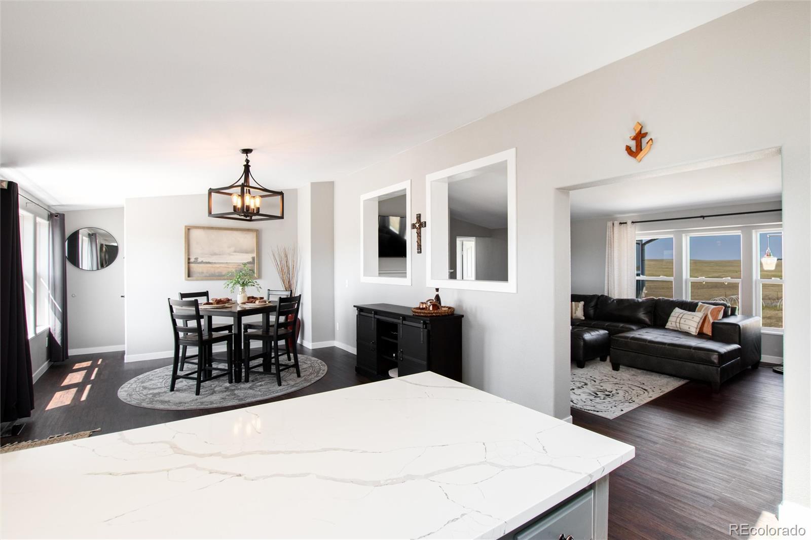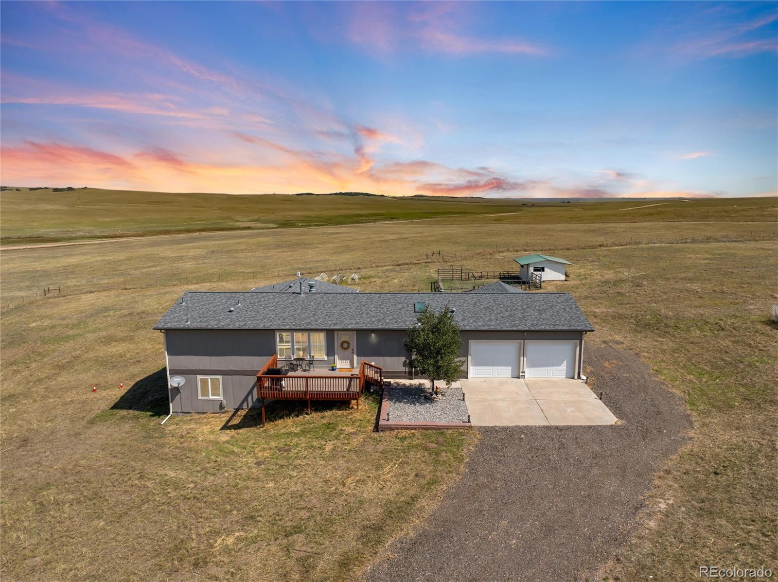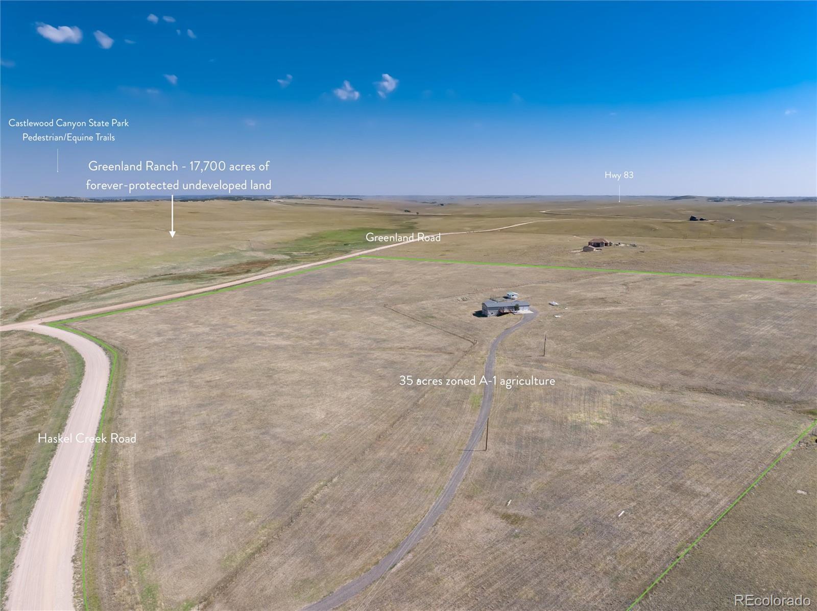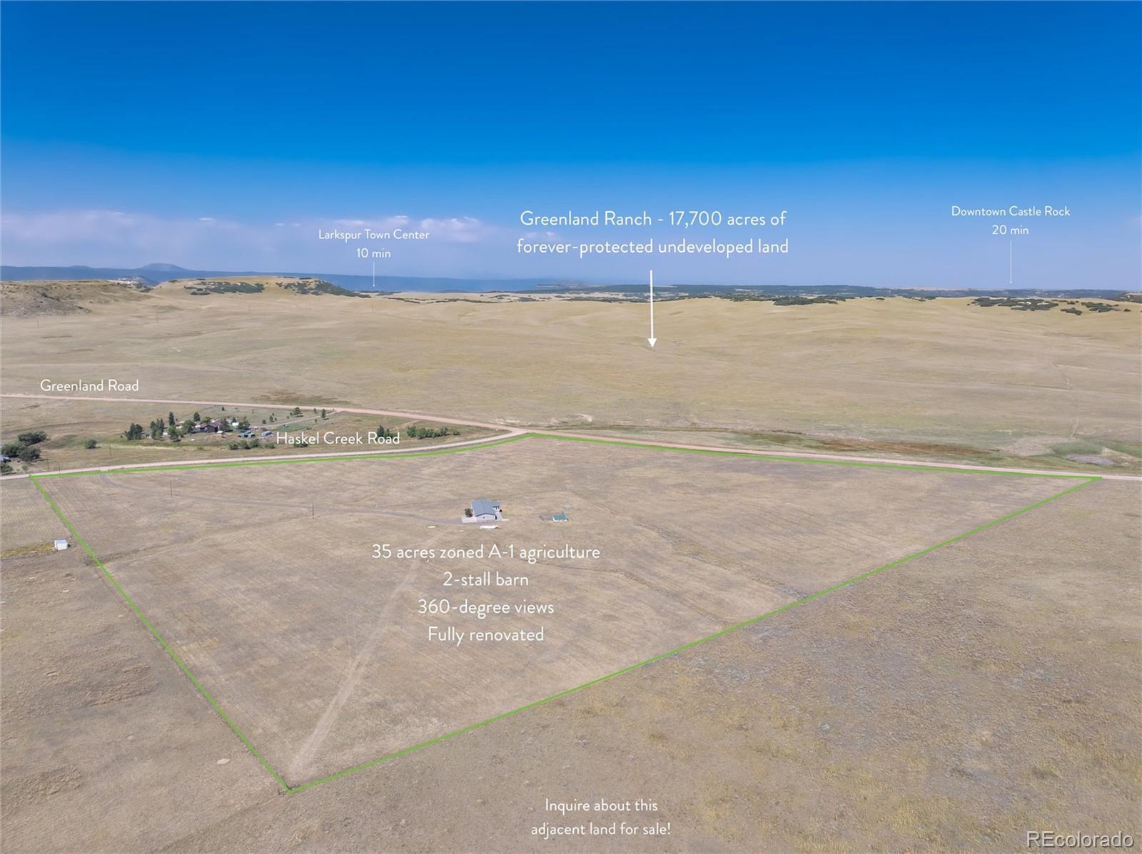 Welcome home to East Larkspur! A RARE, 35-acre lot zoned for A-1 agriculture zoning with prairie-to-peak panoramic views! Conveniently located only 3.5 miles east of I-25 on Greenland Road where your only neighbors to the north are the cattle that graze the nearly 18,000 acres of forever-protected land known as Greenland Ranch. With Pikes Peak's majestic presence to the south, and Rattlesnake Butte to the west where the sunsets are a sight to behold, you'll feel like you've escaped the busy life "out there." Here, it's quiet, expansive, and breathtaking — and all yours to create the life you've always wanted. Live out your dream of becoming a rancher or hobby farmer, or simply enjoy the low-maintenance lifestyle this move-in ready, fully renovated, ranch-style home can offer! Inside you'll immediately notice all the sunlight this home allows in and how functionally and thoughtfully remodeled this home is. You'll feel like you've walked into a new home with new luxury vinyl plank floors, carpeting, gorgeous kitchen quartz countertops, appliances, washer and dryer, lighting, hardware, baseboards, interior and exterior paint, new furnace and hot water heater, and a new Class-4 impact-resistant roof! No surface was left untouched on the main level! You'll enjoy the vaulted ceilings, skylight, views from every window, and the easy flow here. The primary suite will win you over with its 5-piece bathroom, complete with freestanding soaking tub and huge walk-in closet! The full, walkout basement offers plenty of storage or a blank canvas to add more bedrooms and living space! The 2-stall barn with corral is ready for your can't-leave-behind domestic animals! Your home on 35 acres borders Greenland Road and Haskel Creek and is priced appropriately for you to add outbuildings to complete your lifestyle! Join the Larkspur, Castle Rock, and Monument events — all lively and welcoming towns with plentiful shopping and restaurants! Come live the good life in East Larkspur!
