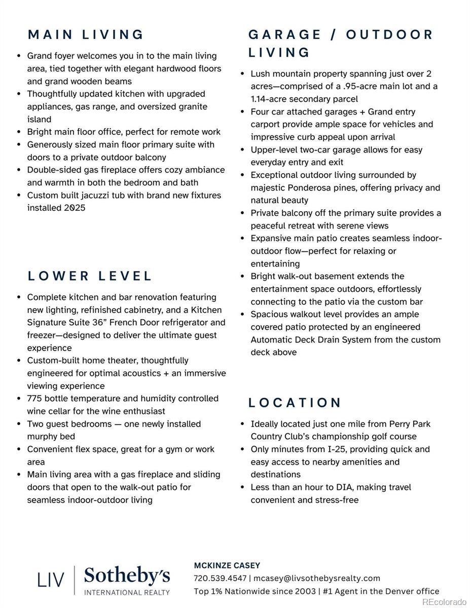 Tucked within the serene landscape of Perry Park, this exceptional custom ranch offers unparalleled Colorado mountain living. Spanning two separate parcels totaling just over two acres—the main lot (.95 acres) and a secondary parcel (1.14 acres)—this remarkable estate offers the perfect blend of privacy, security, and opportunity for future expansion. Thoughtfully designed, the home offers four oversized, heated garage bays, plus a distinguished porte-cochère. Inside, the grand main living area welcomes you with soaring ceilings accented by rich wooden beams, creating a warm yet sophisticated atmosphere. The bright, open-concept layout flows seamlessly between the chef’s kitchen and main living space. Expansive Pella windows frame views of towering Ponderosa pines, while over 2,000 sqft of deck and patio space allow for effortless indoor-outdoor living. The kitchen is a chef’s dream, equipped with premium Wolf, Dacor, and Sub-Zero appliances, a new Monogram Café Door double oven, oversized island, and exquisite slab granite countertops. The main floor primary suite is a private retreat, featuring a spa-inspired bath with a Jacuzzi tub, two-way fireplace, abundant natural light, and tranquil forest views. Downstairs, you’ll find two additional guest suites along with a full kitchen and a stylish bar and entertainment area. This level opens to a bright walkout patio through a sliding glass door custom-fitted with Hunter Douglas Duette Honeycomb blinds, extending the living space and maximizing outdoor living. Entertainment is elevated throughout with a dedicated Dolby Atmos 7.1.4 home theater, designed with custom acoustics, three AC power circuits, and Apple TV integration. For wine enthusiasts, a 775-bottle climate-controlled cellar completes this lower level. Perfectly positioned just one mile from Perry Park Country Club’s championship golf course and only minutes from I-25, this secluded retreat offers serenity without sacrificing accessibility.