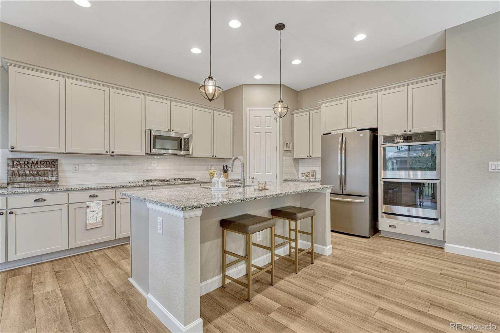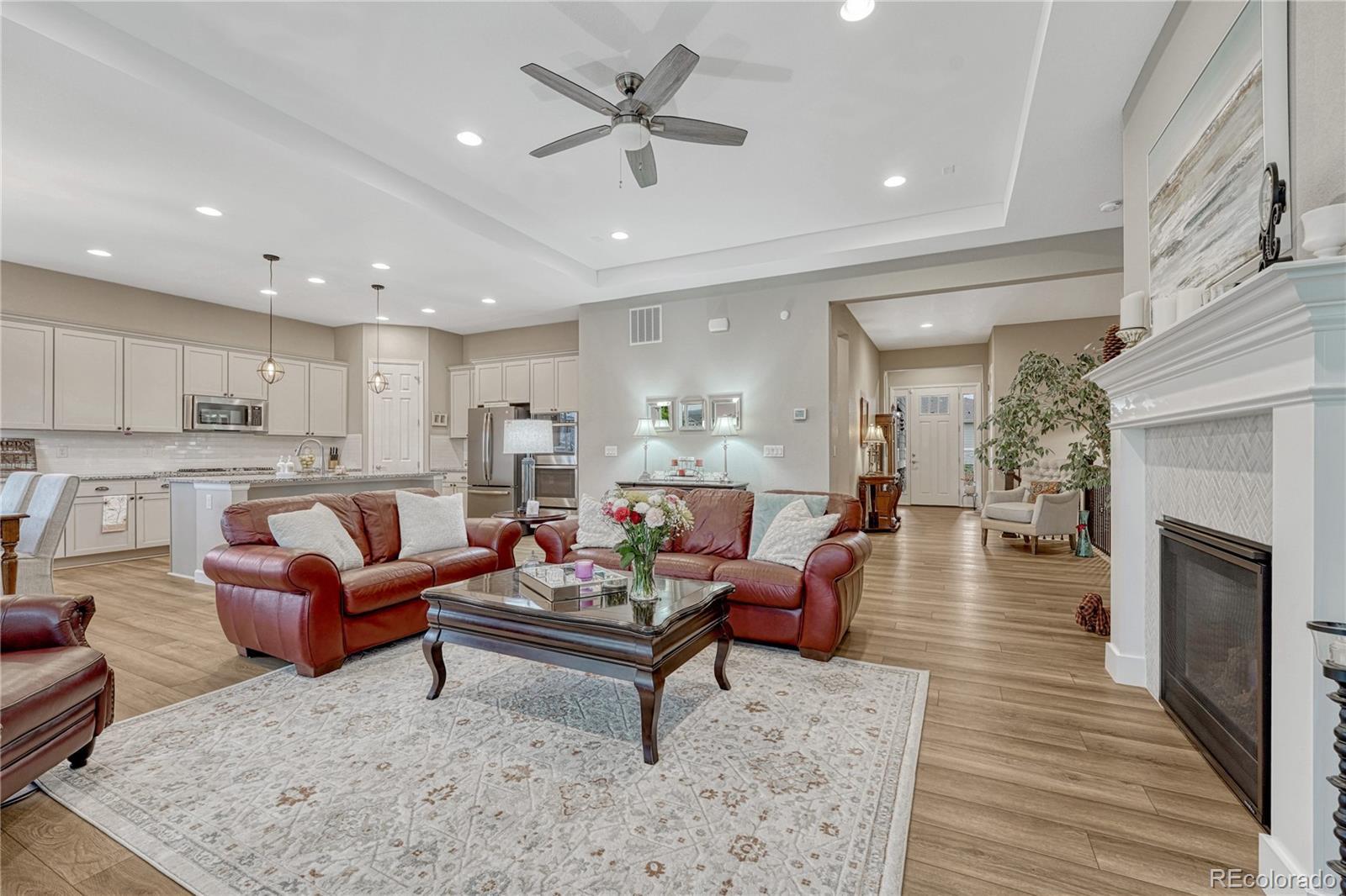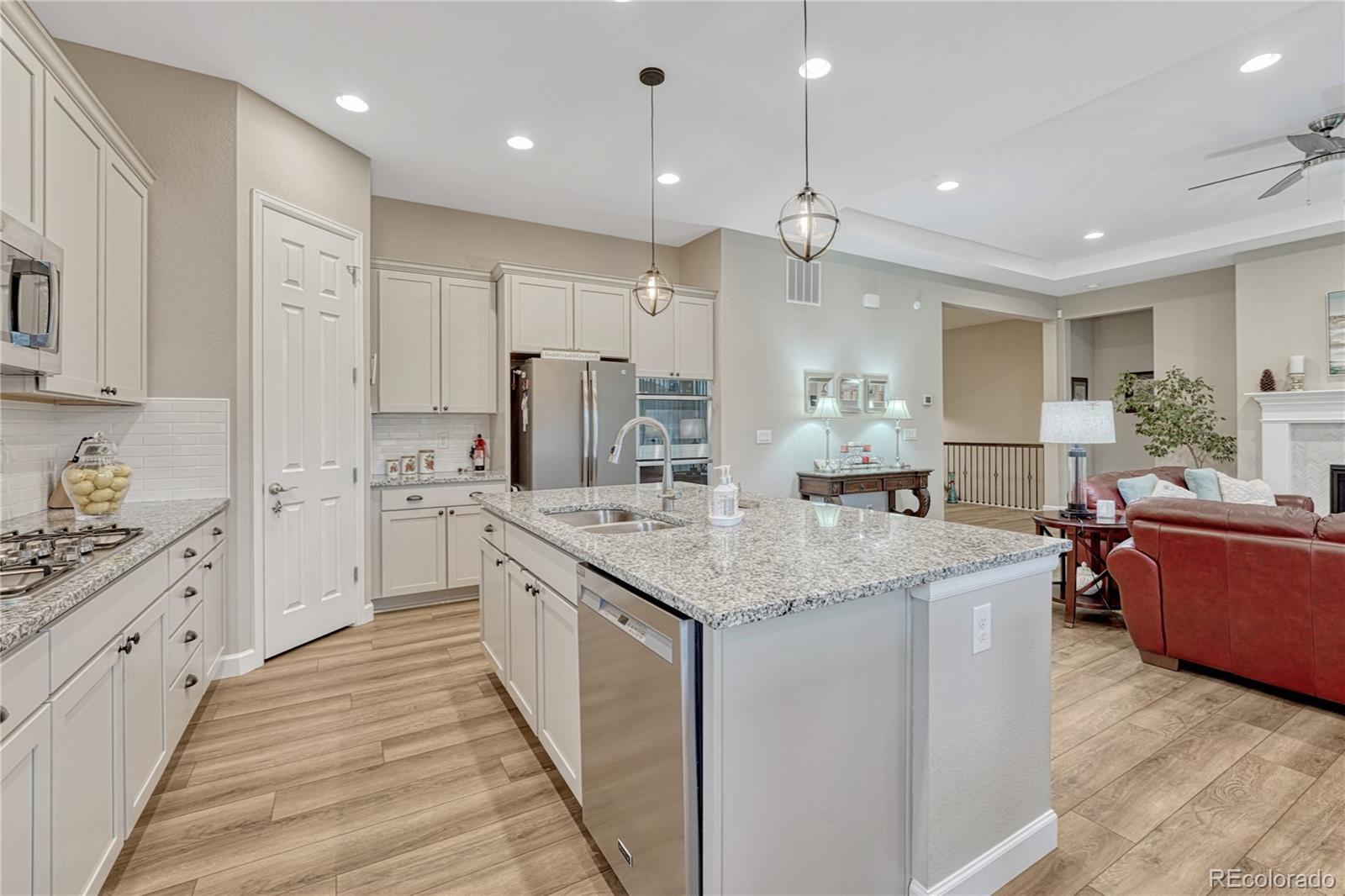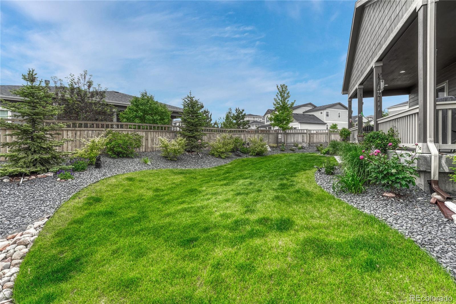 ***GET OFFER ALERTS AT FINALOFFER.COM***Newer built, one story/ranch style home in the heart of The Meadows has amazing upgrades throughout. Living room boasts a sliding glass wall that walks out to a full size covered patio as a beautiful outdoor living area with a professionally landscaped setting. Gourmet kitchen includes extended cabinets, slab granite countertops, white subway tile back splash,double oven, upgraded cabinets, gas cook top, & a large center piece kitchen island with room for stools. Living room opens to the kitchen and outdoor living area with 11' coffered ceilings, luxury tile flooring, and a gas fireplace with a herring bone stone surround. Main level has 3 bedrooms, 3 bathrooms, laundry, office, luxury tile, & 8' doors. Finished basement has 2 bedrooms, 1 bathroom, a very open main room and about another 1,000 square feet of unfinished storage/work shop space. Close proximity to I-25, DTC, several elementary, middle, & high schools, parks, hiking & biking trails, tennis courts, golf courses, hospital, stores, Outlets at Castle Rock, Taft House, Grange, The MAC, & more.