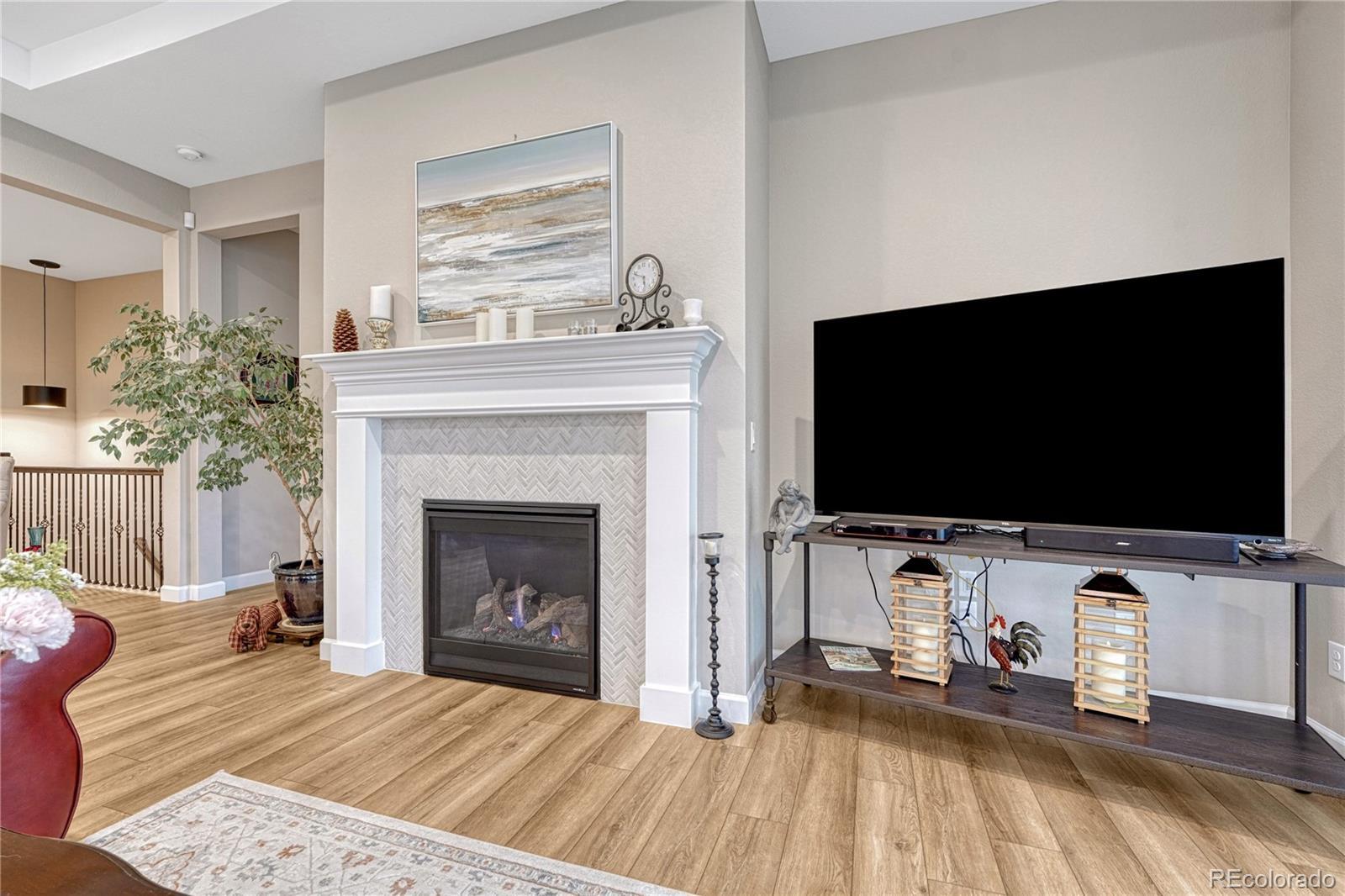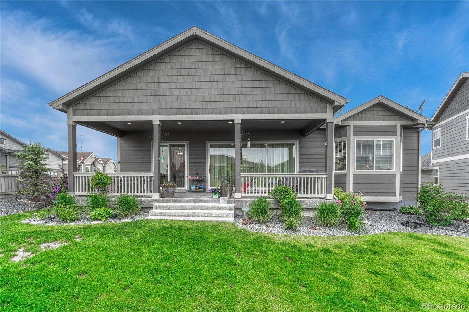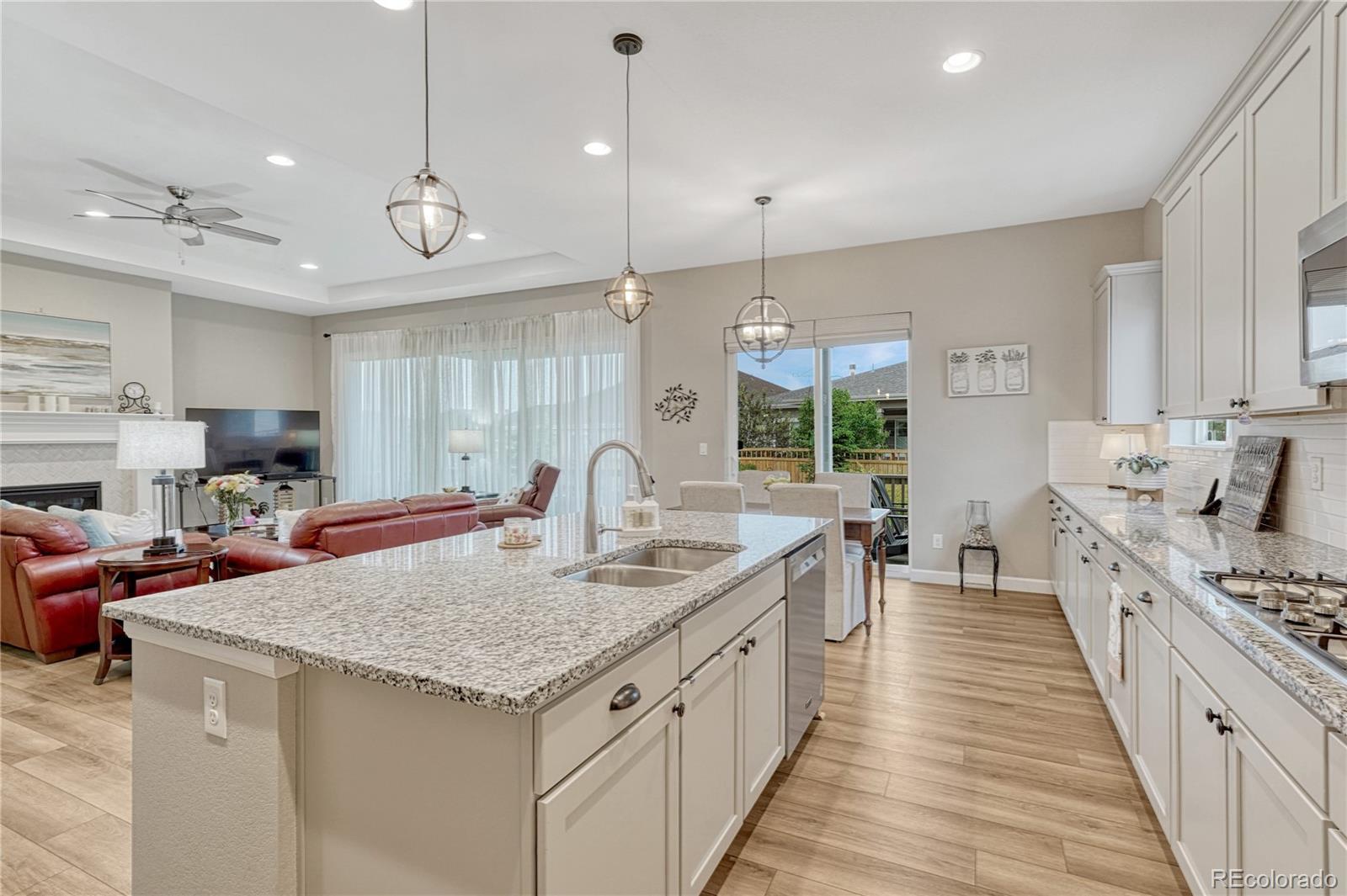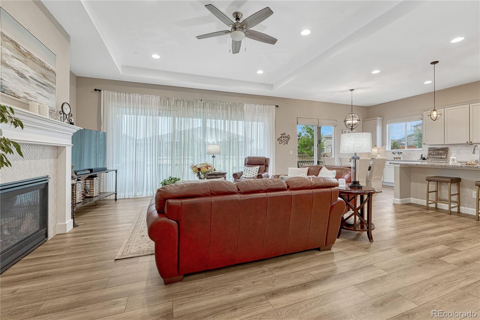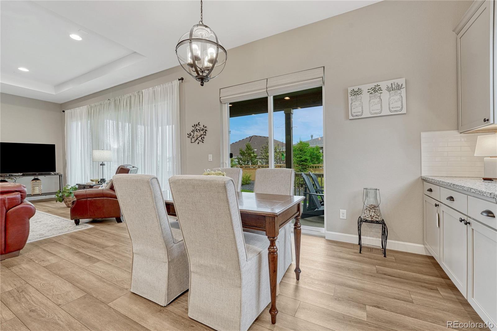 ***GET OFFER ALERTS AT FINALOFFER.COM***Newer built, one story/ranch style home in the heart of The Meadows has amazing upgrades throughout. Living room boasts a sliding glass wall that walks out to a full size covered patio as a beautiful outdoor living area with a professionally landscaped setting. Gourmet kitchen includes extended cabinets, slab granite countertops, white subway tile back splash,double oven, upgraded cabinets, gas cook top, & a large center piece kitchen island with room for stools. Living room opens to the kitchen and outdoor living area with 11' coffered ceilings, luxury tile flooring, and a gas fireplace with a herring bone stone surround. Main level has 3 bedrooms, 3 bathrooms, laundry, office, luxury tile, & 8' doors. Finished basement has 2 bedrooms, 1 bathroom, a very open main room and about another 1,000 square feet of unfinished storage/work shop space. Close proximity to I-25, DTC, several elementary, middle, & high schools, parks, hiking & biking trails, tennis courts, golf courses, hospital, stores, Outlets at Castle Rock, Taft House, Grange, The MAC, & more.