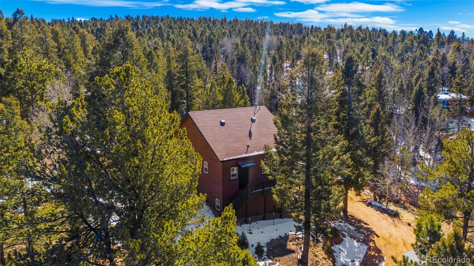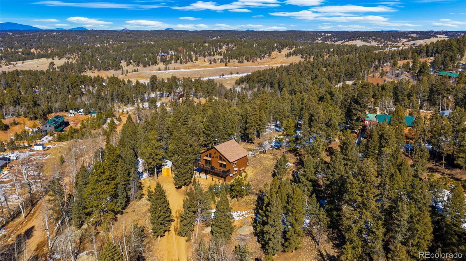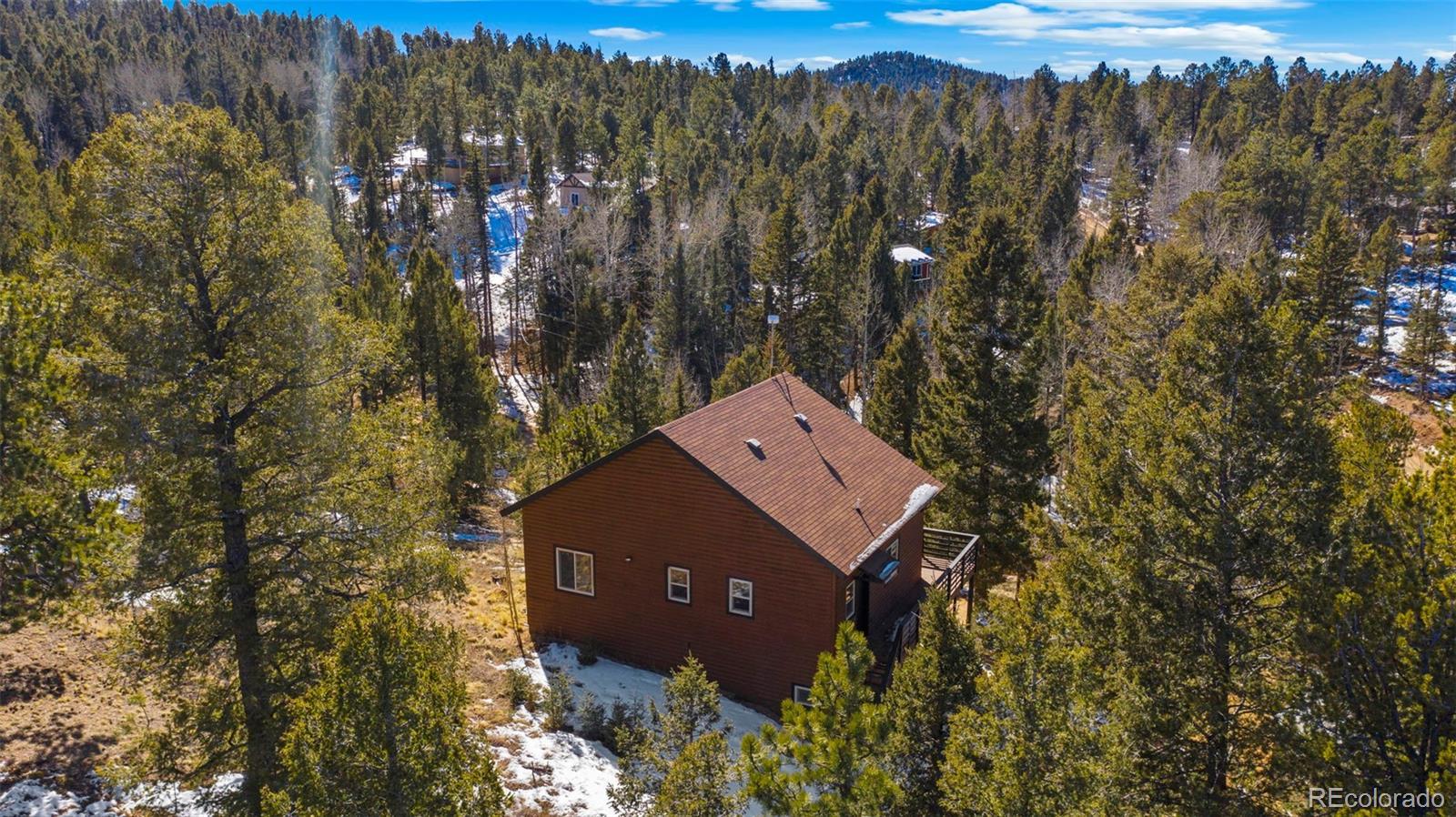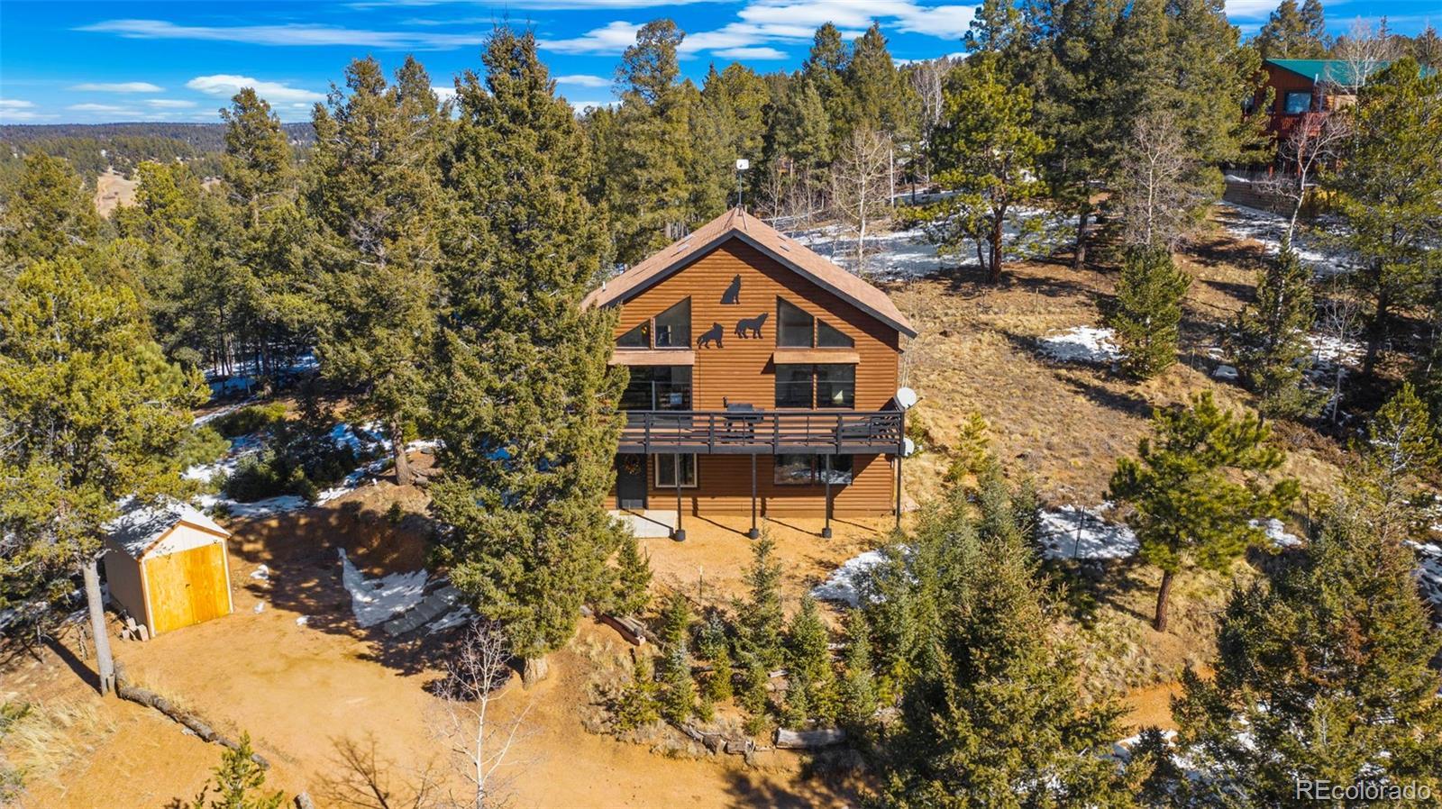 Nestled in a peaceful mountain setting surrounded by a mature mix of pine and aspen trees, this 1,536 square foot raised ranch-style home offers comfort, privacy, and convenient access to nearby amenities. The main level features an open floorplan designed for easy living and entertaining, highlighted by clerestory windows in the living room that fill the space with abundant natural light. Luxury vinyl flooring runs throughout the main level, providing durability and a cohesive modern look. The updated kitchen is well-appointed with LG stainless steel appliances, granite countertops, and ample cabinetry, making meal preparation both functional and inviting. Step outside to the expansive wraparound walkout deck, where you can relax or entertain while enjoying panoramic treetop views of the surrounding hills—a true mountain retreat. The walkout lower level offers excellent flexibility with a comfortable family room, two additional bedrooms, and an updated bathroom, ideal for guests, multi-generational living, or work-from-home needs. Outdoor features include street level RV parking, a fenced dog run, and plenty of usable space to enjoy the natural surroundings. With three bedrooms and two baths, a thoughtful layout, and a serene yet accessible location, this home strikes the perfect balance between mountain living and everyday convenience. A move-in-ready opportunity for those seeking space, light, and a peaceful Colorado lifestyle.