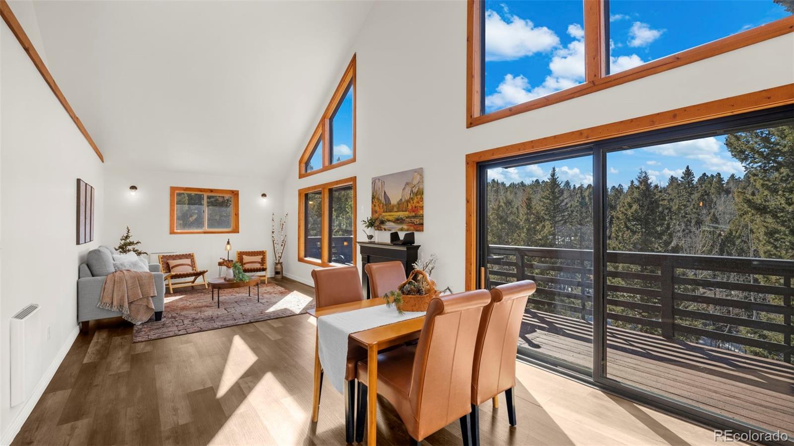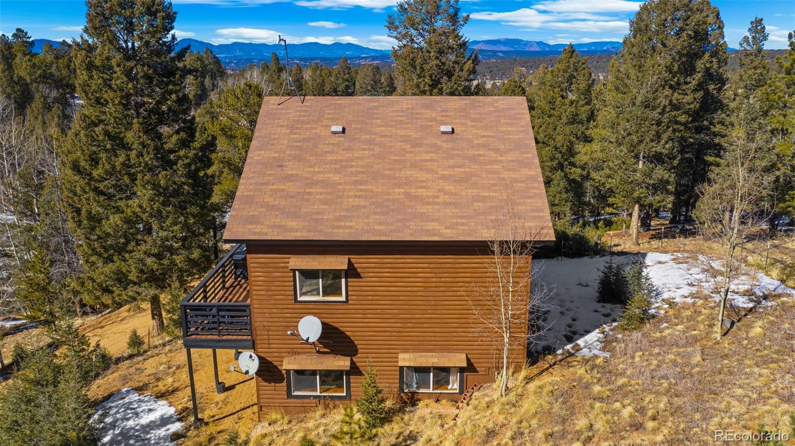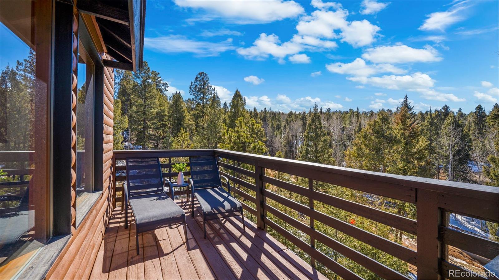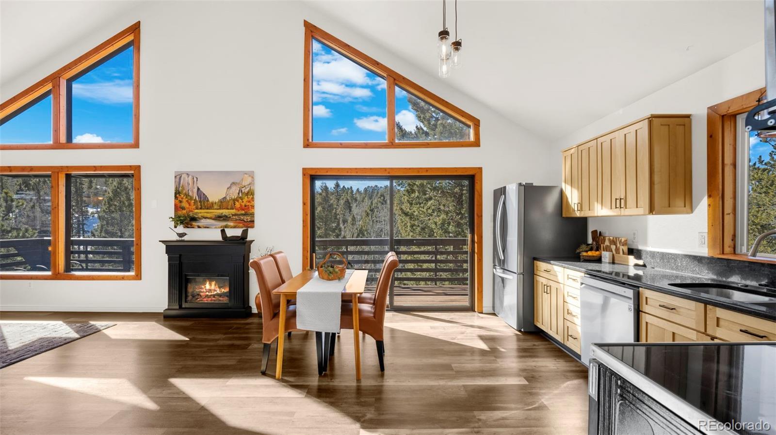 Nestled in a peaceful mountain setting surrounded by a mature mix of pine and aspen trees, this 1,536 square foot raised ranch-style home offers comfort, privacy, and convenient access to nearby amenities. The main level features an open floorplan designed for easy living and entertaining, highlighted by clerestory windows in the living room that fill the space with abundant natural light. Luxury vinyl flooring runs throughout the main level, providing durability and a cohesive modern look. The updated kitchen is well-appointed with LG stainless steel appliances, granite countertops, and ample cabinetry, making meal preparation both functional and inviting. Step outside to the expansive wraparound walkout deck, where you can relax or entertain while enjoying panoramic treetop views of the surrounding hills—a true mountain retreat. The walkout lower level offers excellent flexibility with a comfortable family room, two additional bedrooms, and an updated bathroom, ideal for guests, multi-generational living, or work-from-home needs. Outdoor features include street level RV parking, a fenced dog run, and plenty of usable space to enjoy the natural surroundings. With three bedrooms and two baths, a thoughtful layout, and a serene yet accessible location, this home strikes the perfect balance between mountain living and everyday convenience. A move-in-ready opportunity for those seeking space, light, and a peaceful Colorado lifestyle.