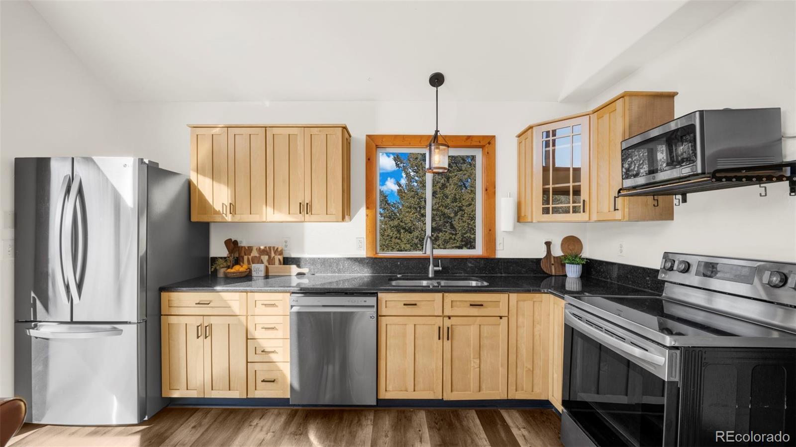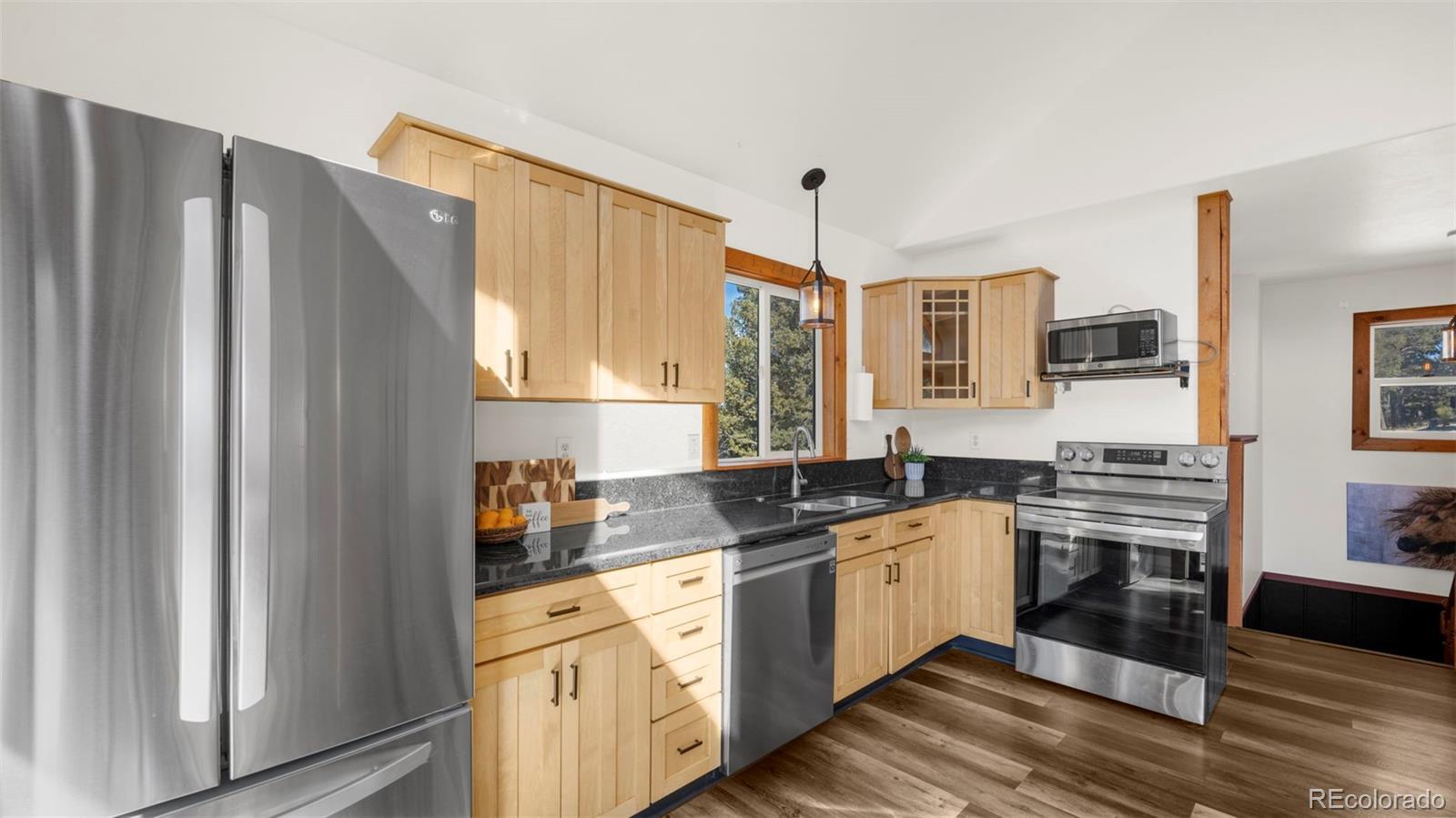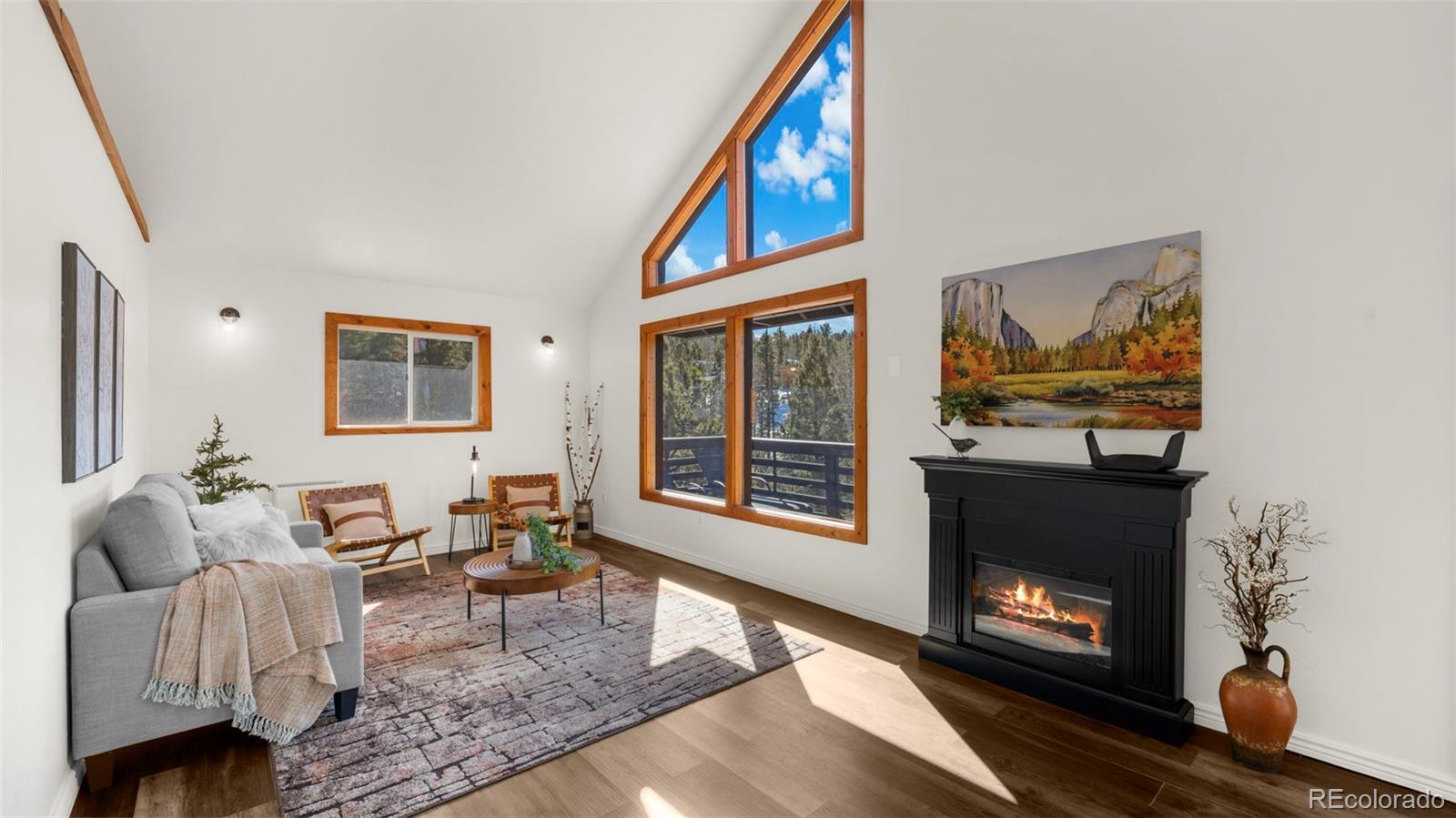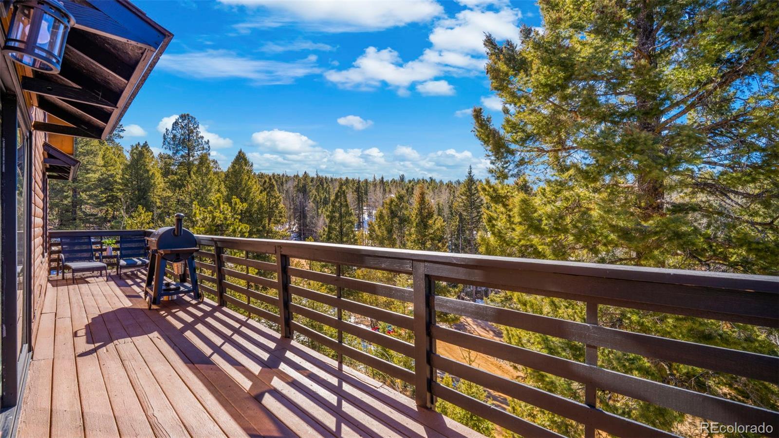 Nestled in a peaceful mountain setting surrounded by a mature mix of pine and aspen trees, this 1,536 square foot raised ranch-style home offers comfort, privacy, and convenient access to nearby amenities. The main level features an open floorplan designed for easy living and entertaining, highlighted by clerestory windows in the living room that fill the space with abundant natural light. Luxury vinyl flooring runs throughout the main level, providing durability and a cohesive modern look. The updated kitchen is well-appointed with LG stainless steel appliances, granite countertops, and ample cabinetry, making meal preparation both functional and inviting. Step outside to the expansive wraparound walkout deck, where you can relax or entertain while enjoying panoramic treetop views of the surrounding hills—a true mountain retreat. The walkout lower level offers excellent flexibility with a comfortable family room, two additional bedrooms, and an updated bathroom, ideal for guests, multi-generational living, or work-from-home needs. Outdoor features include street level RV parking, a fenced dog run, and plenty of usable space to enjoy the natural surroundings. With three bedrooms and two baths, a thoughtful layout, and a serene yet accessible location, this home strikes the perfect balance between mountain living and everyday convenience. A move-in-ready opportunity for those seeking space, light, and a peaceful Colorado lifestyle.