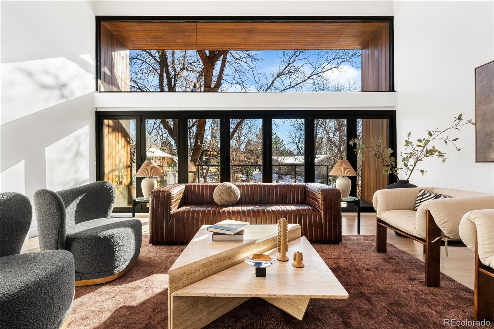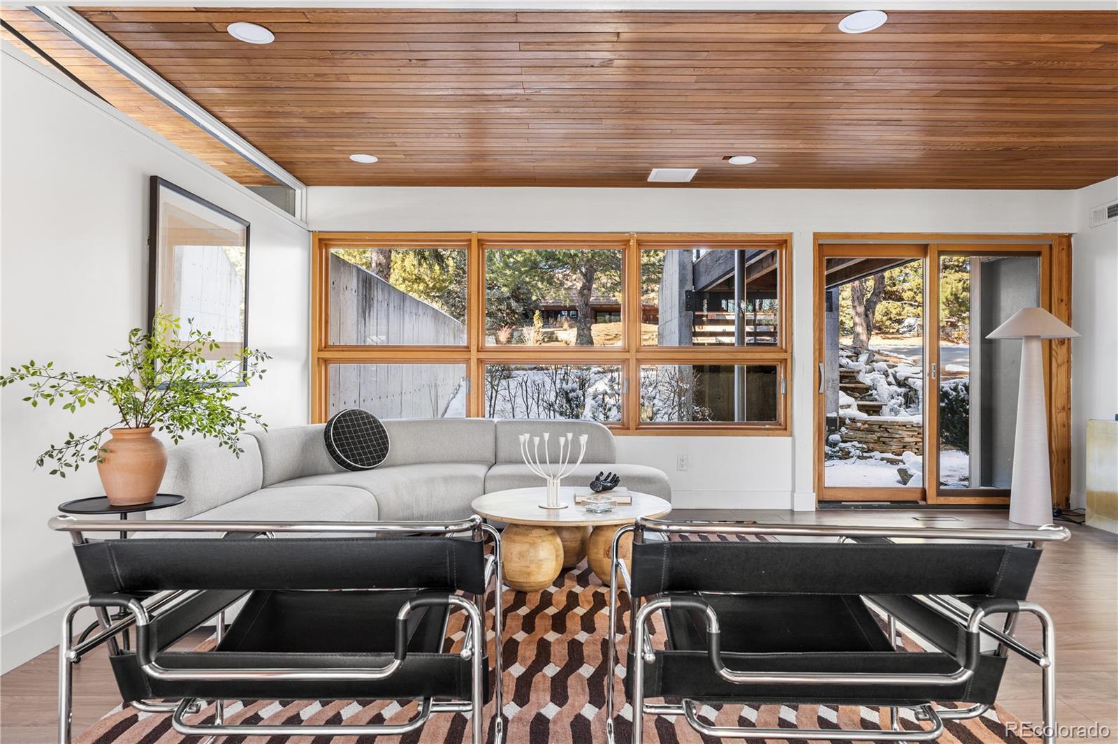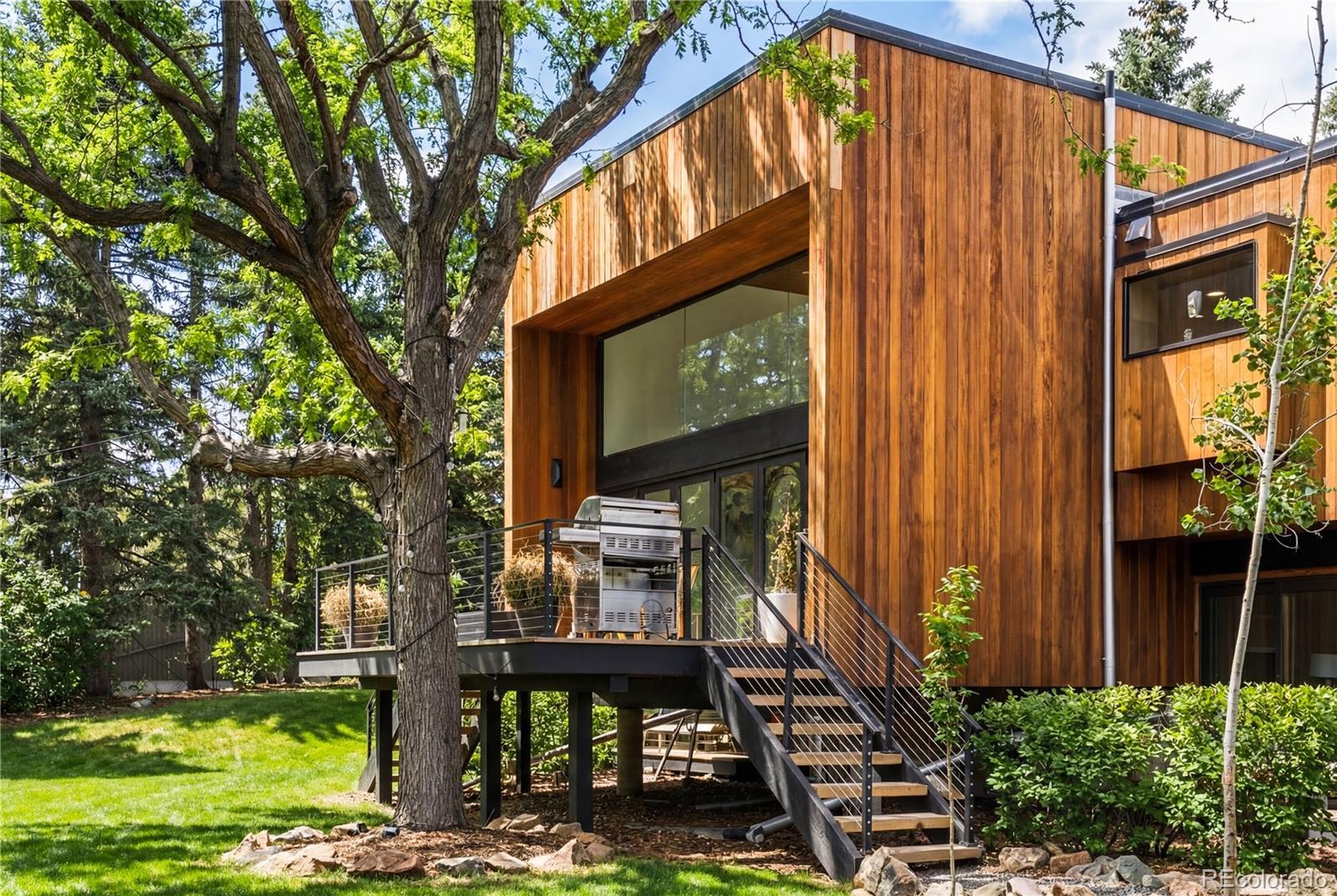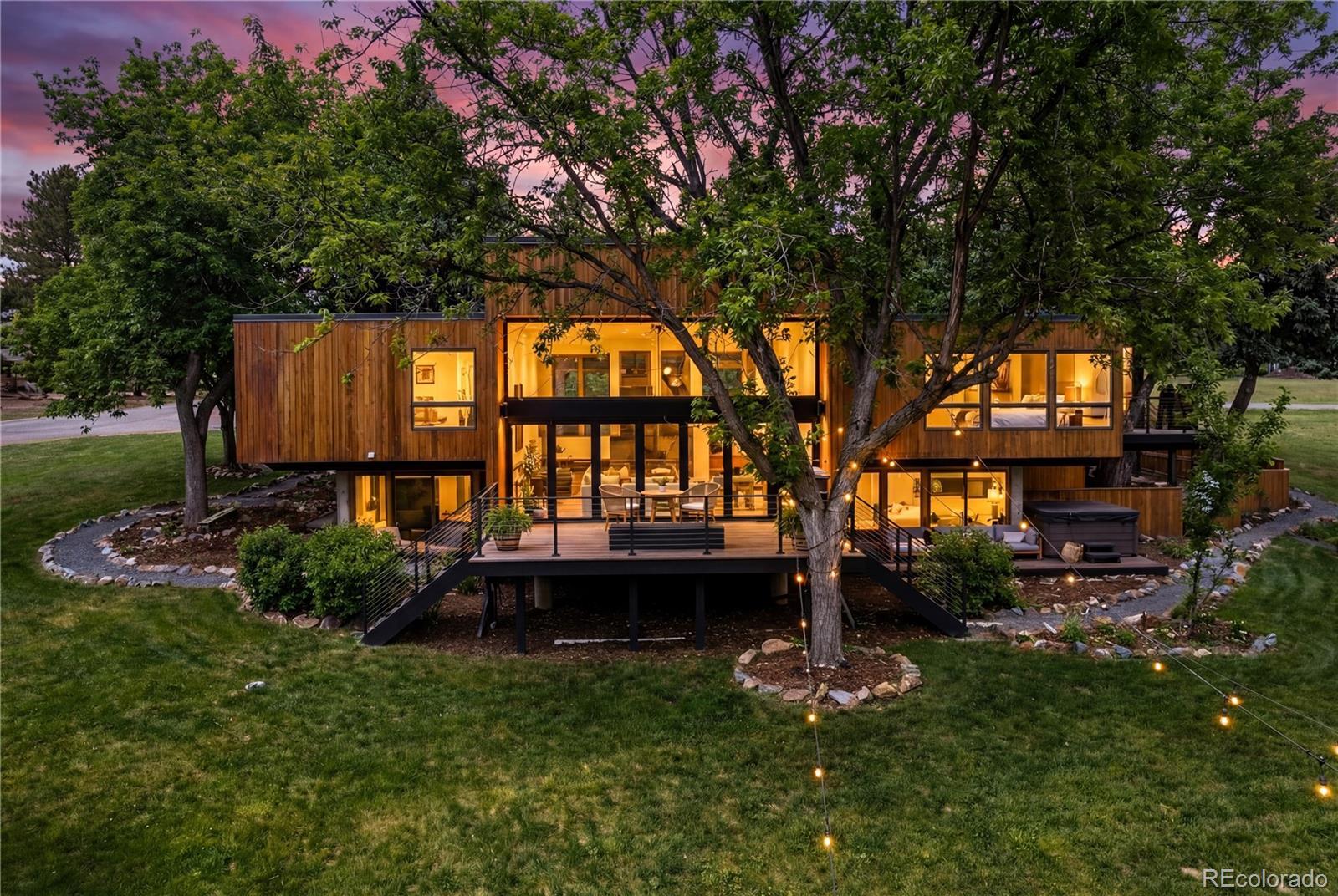 Step into the Orchard Hills Treehouse, a one-of-a-kind modern architectural house in Greenwood Village designed for people who want their home to feel as good as it looks. Set on a private half acre with mature trees in Orchard Hills, a thoughtfully planned community by renowned architect Eugene Sternberg. This is a home where light, space, & nature work together in a way that feels quiet, grounded, & intentionally designed for how you actually live. A front waterfall feature welcomes you home & carries the subtle sound of moving water throughout the property, creating a sense of calm from the moment you arrive. A custom designer kitchen with Monogram appliances anchors the home, opening seamlessly to the dining & living areas. Vaulted ceilings, expansive windows, & a gas fireplace create a warm, open main living space, while accordion glass doors dissolve the line between indoors & out, leading to the deck & surrounding greenery. Every room is connected to light & landscape in a way that feels calm & effortless. The primary suite & two additional bedrooms are all on the same level, offering true main-floor living. The walkout lower level adds a fourth bedroom, a 3/4 bath, additional living space, & flexible recreation areas, creating room to spread out & adapt as life evolves. A private-entry in-law suite provides ideal space for multigenerational living, a live-in au pair, or extended guest stays. Originally designed as a modern custom residence & taken down to the studs for a comprehensive 2023 remodel, the home reflects intentional design, quality craftsmanship, & thoughtful flow in every space. An additional $40,000 in landscaping upgrades were completed in 2024. Orchard Hills is shaped by greenbelts, walking paths, & limited through-traffic, creating a sense of calm & privacy. Located in the Cherry Creek School District, this is a home that feels intentional & livable, modern without being cold, & private without feeling removed.