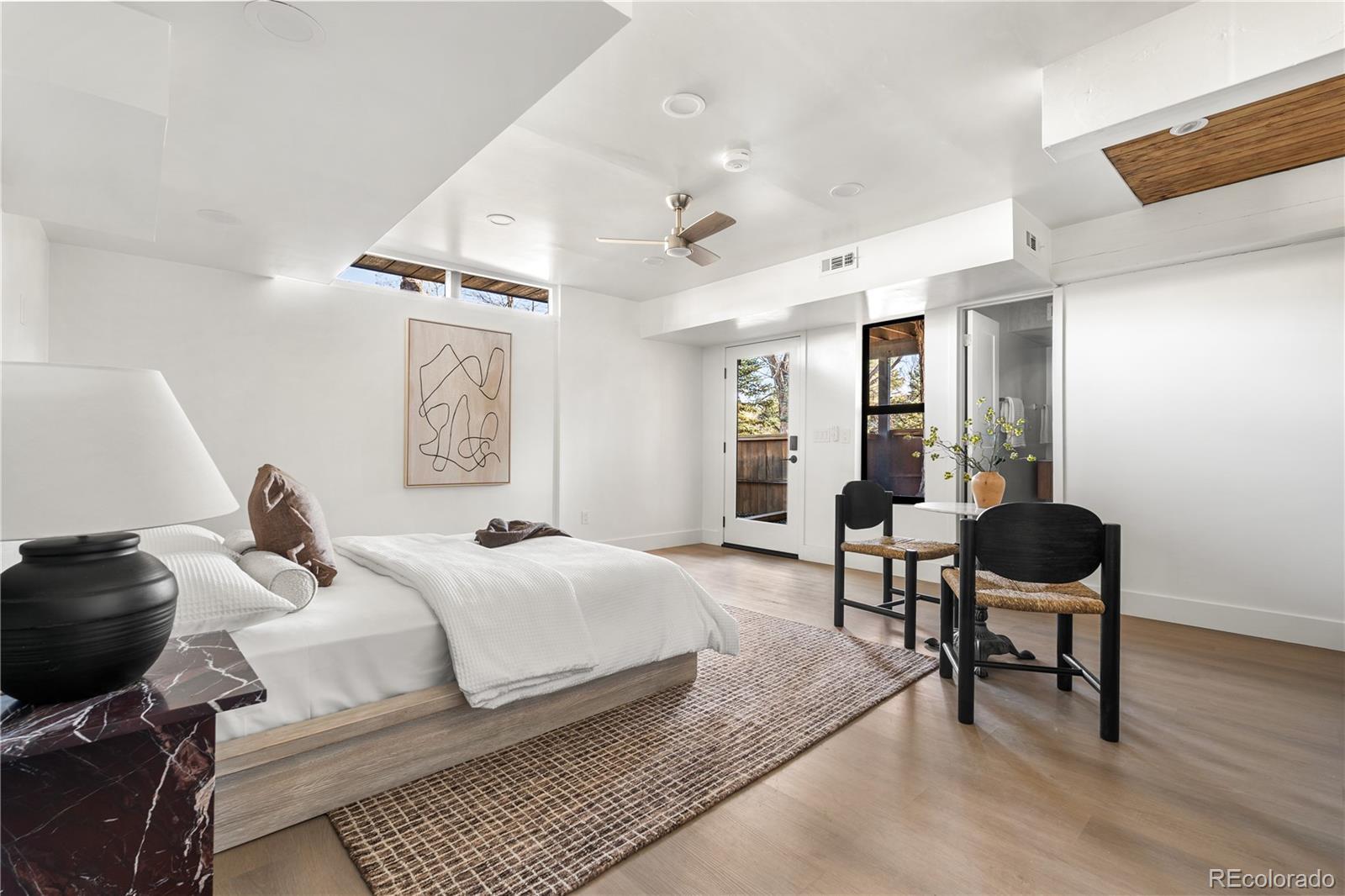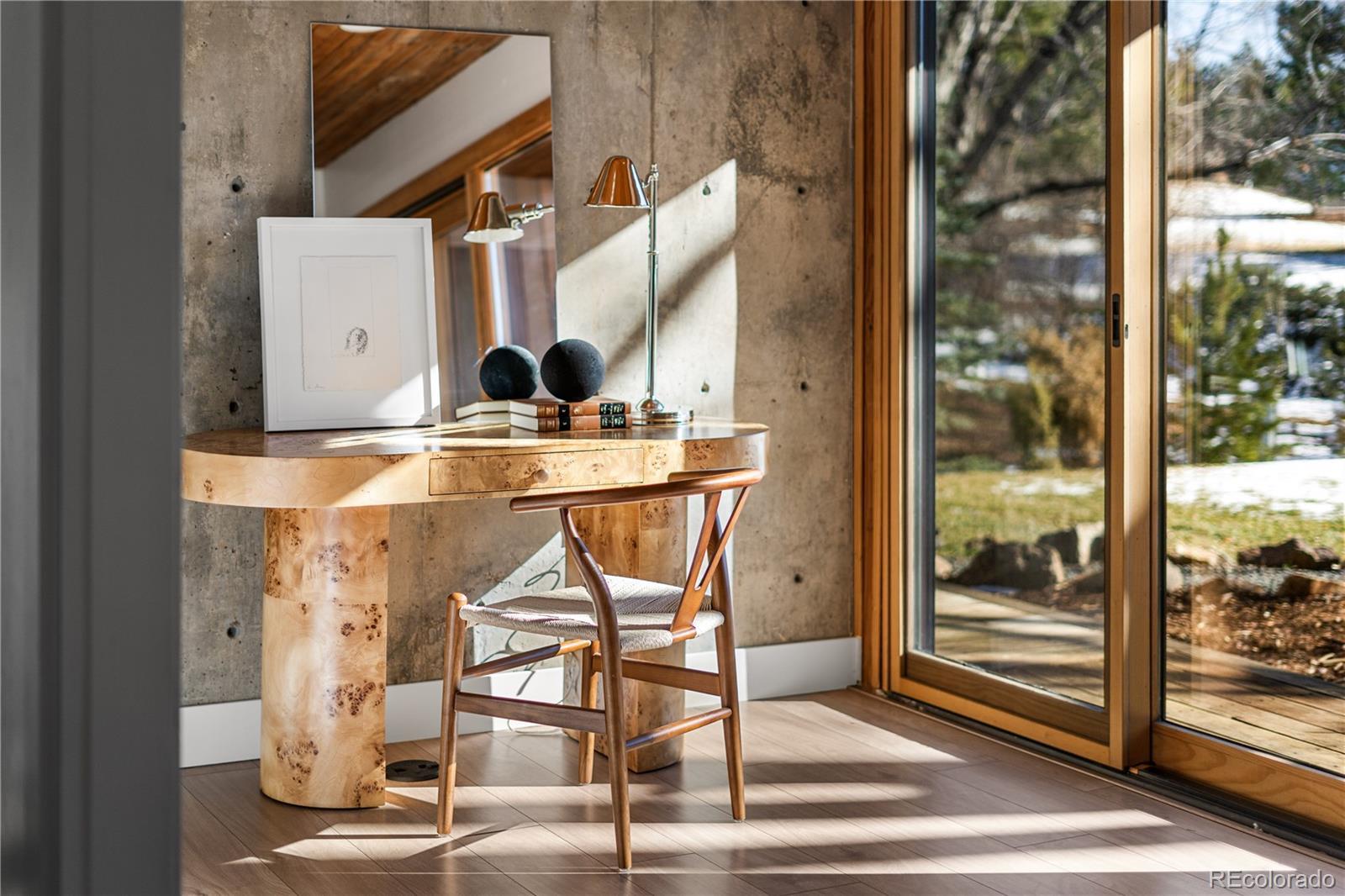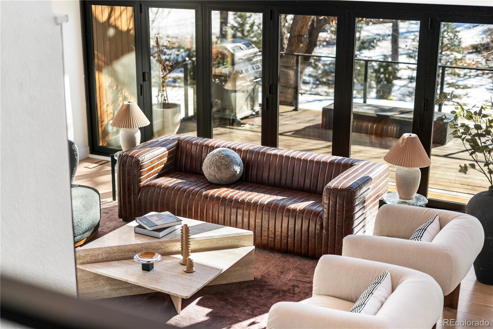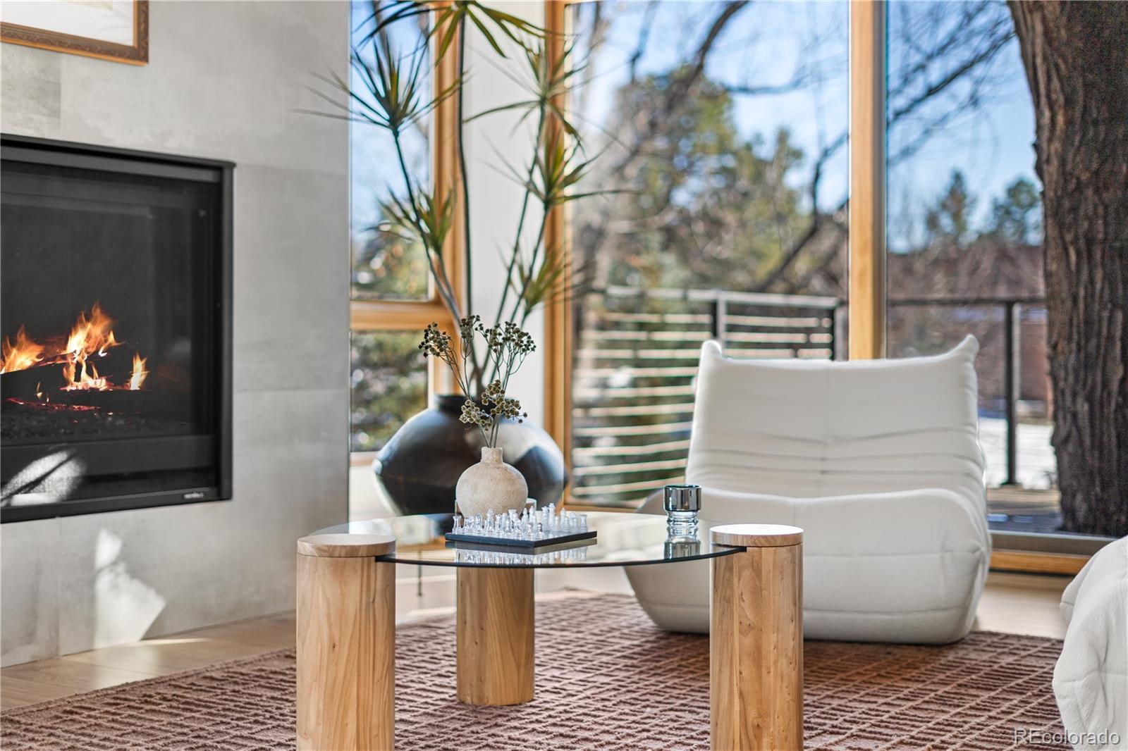 Step into the Orchard Hills Treehouse, a one-of-a-kind modern architectural house in Greenwood Village designed for people who want their home to feel as good as it looks. Set on a private half acre with mature trees in Orchard Hills, a thoughtfully planned community by renowned architect Eugene Sternberg. This is a home where light, space, & nature work together in a way that feels quiet, grounded, & intentionally designed for how you actually live. A front waterfall feature welcomes you home & carries the subtle sound of moving water throughout the property, creating a sense of calm from the moment you arrive. A custom designer kitchen with Monogram appliances anchors the home, opening seamlessly to the dining & living areas. Vaulted ceilings, expansive windows, & a gas fireplace create a warm, open main living space, while accordion glass doors dissolve the line between indoors & out, leading to the deck & surrounding greenery. Every room is connected to light & landscape in a way that feels calm & effortless. The primary suite & two additional bedrooms are all on the same level, offering true main-floor living. The walkout lower level adds a fourth bedroom, a 3/4 bath, additional living space, & flexible recreation areas, creating room to spread out & adapt as life evolves. A private-entry in-law suite provides ideal space for multigenerational living, a live-in au pair, or extended guest stays. Originally designed as a modern custom residence & taken down to the studs for a comprehensive 2023 remodel, the home reflects intentional design, quality craftsmanship, & thoughtful flow in every space. An additional $40,000 in landscaping upgrades were completed in 2024. Orchard Hills is shaped by greenbelts, walking paths, & limited through-traffic, creating a sense of calm & privacy. Located in the Cherry Creek School District, this is a home that feels intentional & livable, modern without being cold, & private without feeling removed.