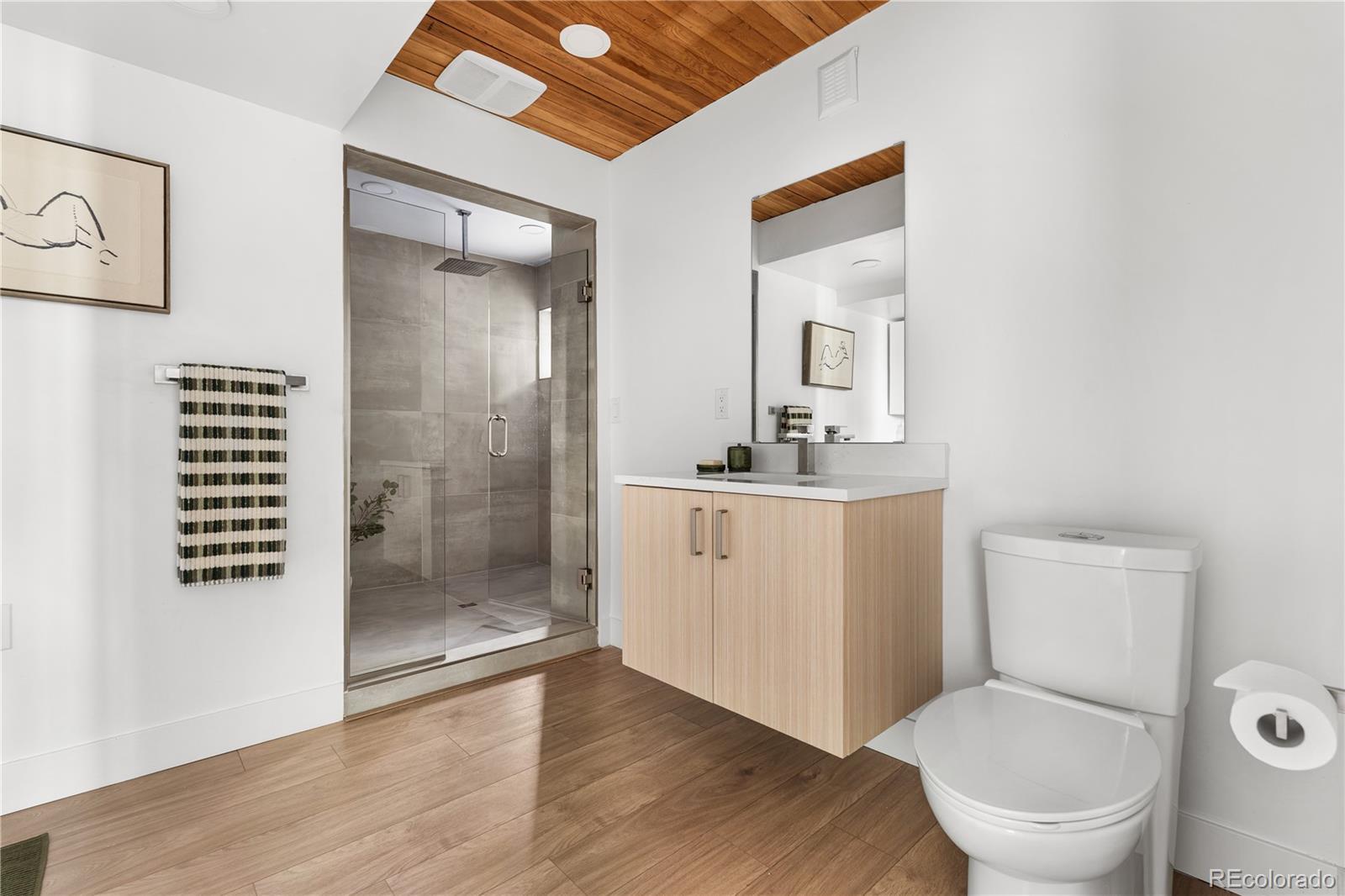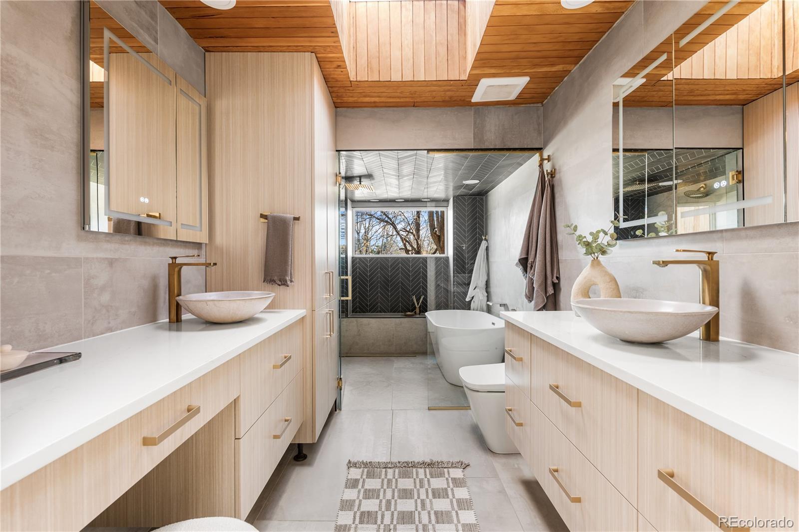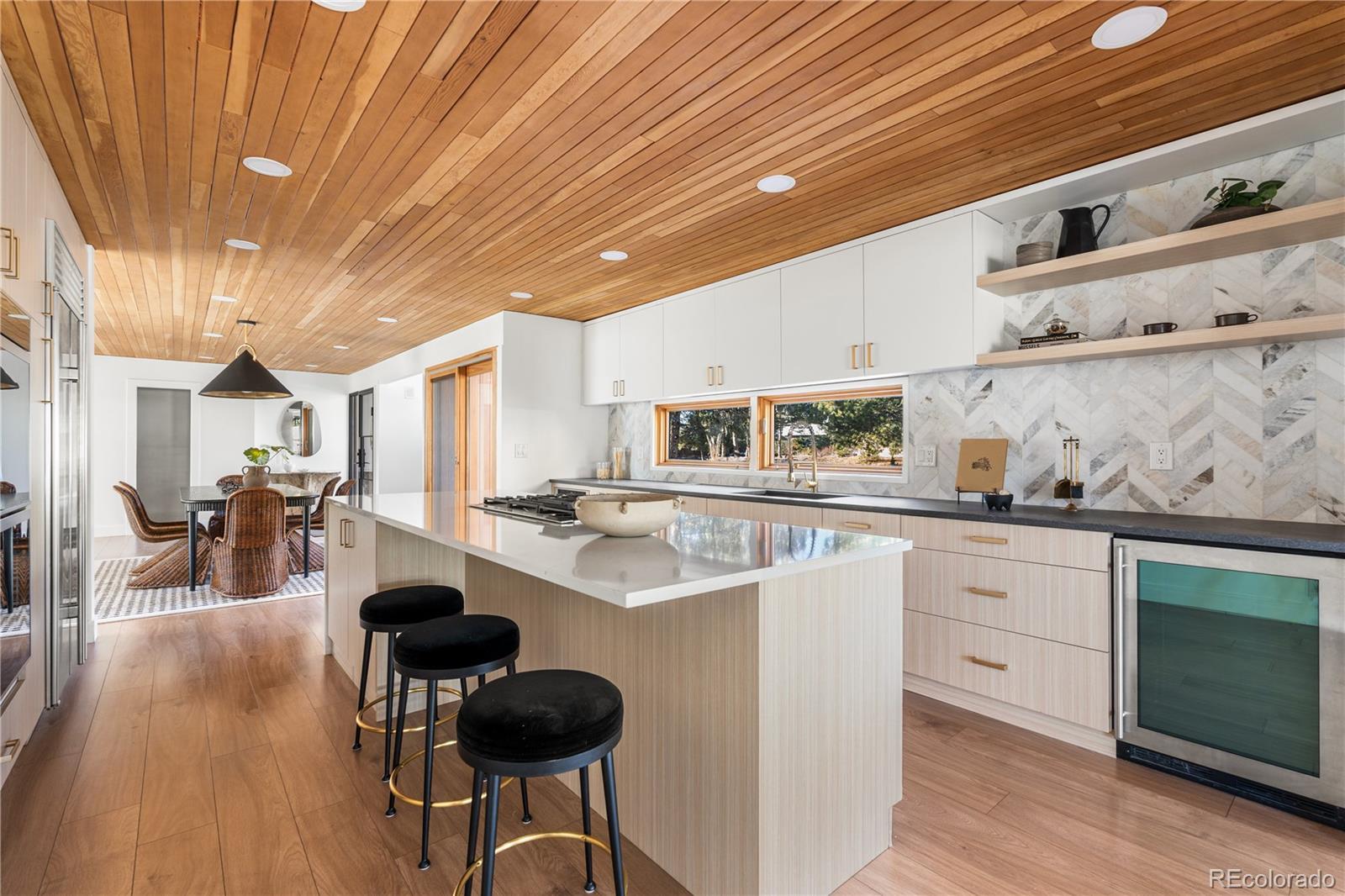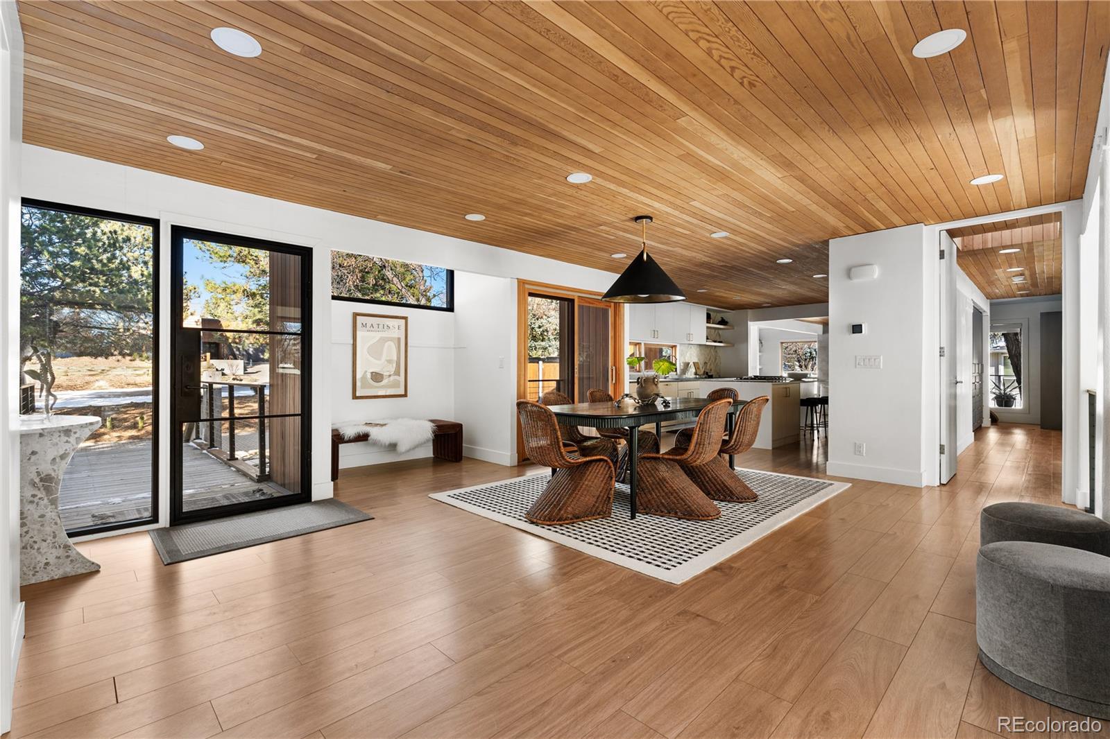 Step into the Orchard Hills Treehouse, a one-of-a-kind modern architectural house in Greenwood Village designed for people who want their home to feel as good as it looks. Set on a private half acre with mature trees in Orchard Hills, a thoughtfully planned community by renowned architect Eugene Sternberg. This is a home where light, space, & nature work together in a way that feels quiet, grounded, & intentionally designed for how you actually live. A front waterfall feature welcomes you home & carries the subtle sound of moving water throughout the property, creating a sense of calm from the moment you arrive. A custom designer kitchen with Monogram appliances anchors the home, opening seamlessly to the dining & living areas. Vaulted ceilings, expansive windows, & a gas fireplace create a warm, open main living space, while accordion glass doors dissolve the line between indoors & out, leading to the deck & surrounding greenery. Every room is connected to light & landscape in a way that feels calm & effortless. The primary suite & two additional bedrooms are all on the same level, offering true main-floor living. The walkout lower level adds a fourth bedroom, a 3/4 bath, additional living space, & flexible recreation areas, creating room to spread out & adapt as life evolves. A private-entry in-law suite provides ideal space for multigenerational living, a live-in au pair, or extended guest stays. Originally designed as a modern custom residence & taken down to the studs for a comprehensive 2023 remodel, the home reflects intentional design, quality craftsmanship, & thoughtful flow in every space. An additional $40,000 in landscaping upgrades were completed in 2024. Orchard Hills is shaped by greenbelts, walking paths, & limited through-traffic, creating a sense of calm & privacy. Located in the Cherry Creek School District, this is a home that feels intentional & livable, modern without being cold, & private without feeling removed.