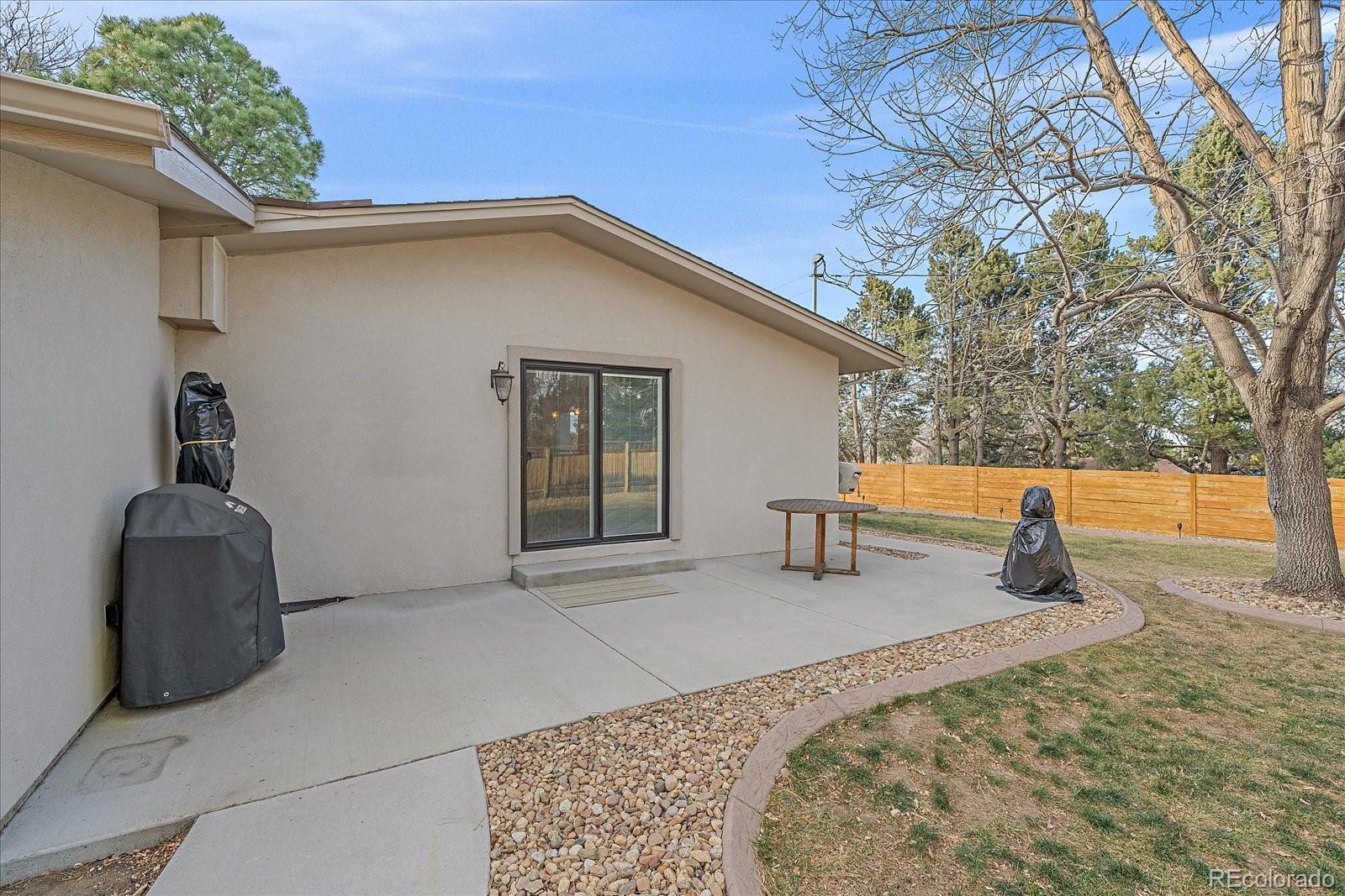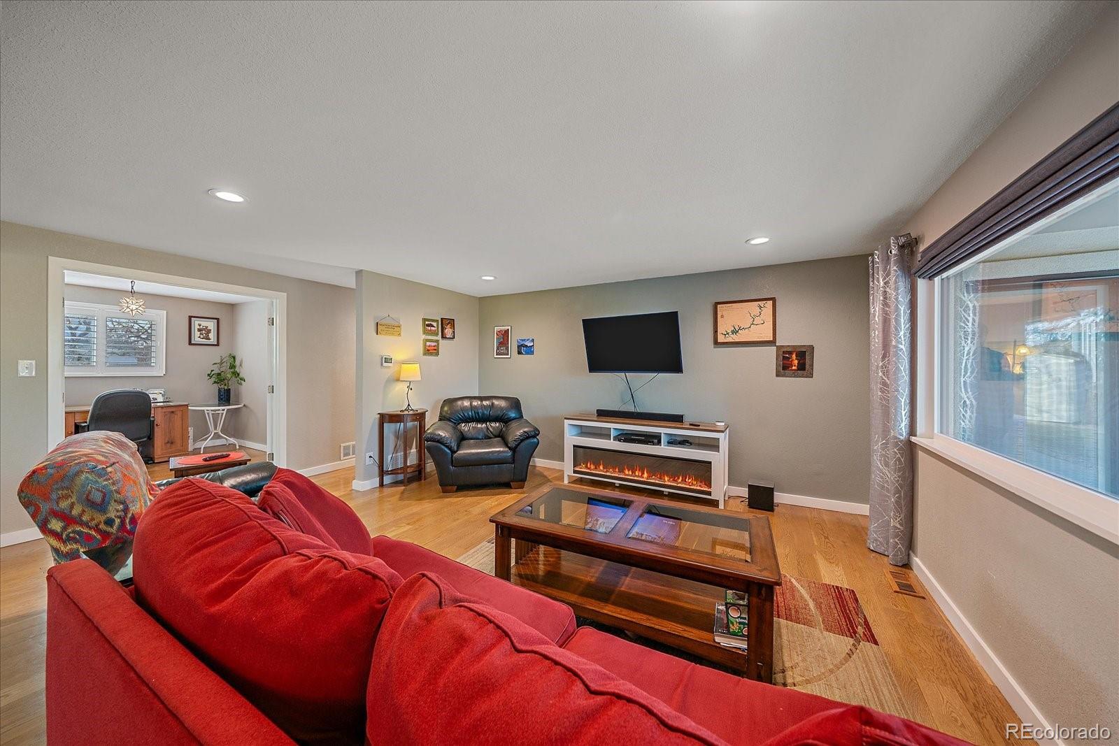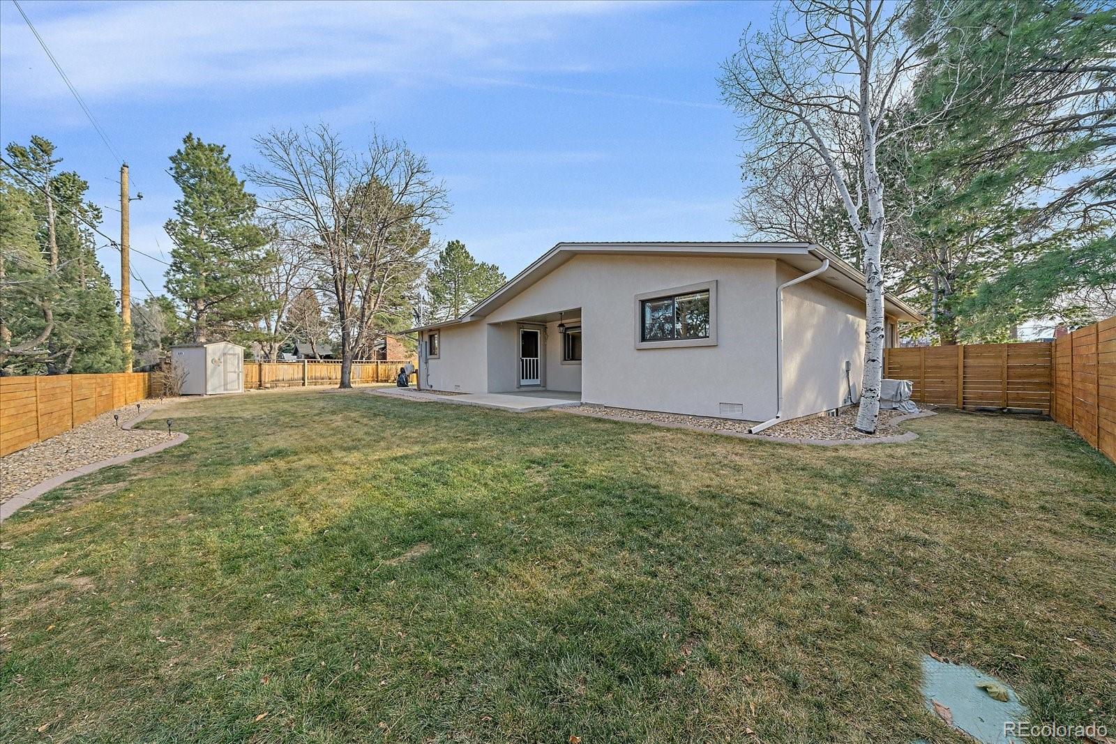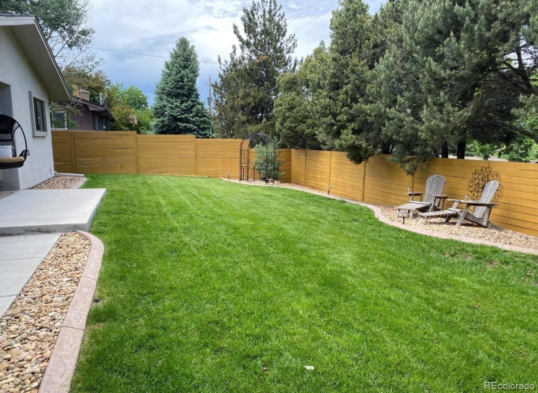 Welcome home to this beautiful 3 bedroom, 2 bath south facing home located in the desirable Huntington Heights neighborhood. The beauty of this home grabs you as soon as you enter the front door. A wide open floorplan is just how you and your family like it! This home was lovingly updated fully in 2016 with high end designer finishes. These upgrades include: a marble tile floor in the foyer, a waterfall granite kitchen island with pendant lighting, recessed ceiling lights, under cabinet lighting, spacious cabinetry, stainless steel GE Kitchen appliances including a gas stove, wide plank white oak hardwood flooring and Carrara Marble used in Primary Bathroom. At the same time, efficient heating and cooling were installed, along with solid wood doors, new windows, window blinds and a new roof with high impact shingles. One of the bedrooms has been set up as a home office with French doors. The home has outstanding curb appeal with especially attractive fencing, a stucco exterior and also has plenty of room to park your vehicles with a two car garage and an additional area for a large vehicle on the driveway. One could even see adding a gate and parking an RV in the yard. The backyard is a wonderful oasis for entertaining family and friends with a groomed lawn, an open patio area and a private patio nook off the primary bedroom to enjoy your morning coffee. The home offers an unfinished basement for storage or a future finish. The location is excellent, as this home is located on the elevated portion of Arvada and has close proximity to Indian Tree Golf Course, a 6 minute drive to Olde Town Arvada (with light rail access) and a 1/2 mile walk to the popular Majestic View Park. Enjoy this home in a mature neighborhood without HOA fees. Set up a showing today!