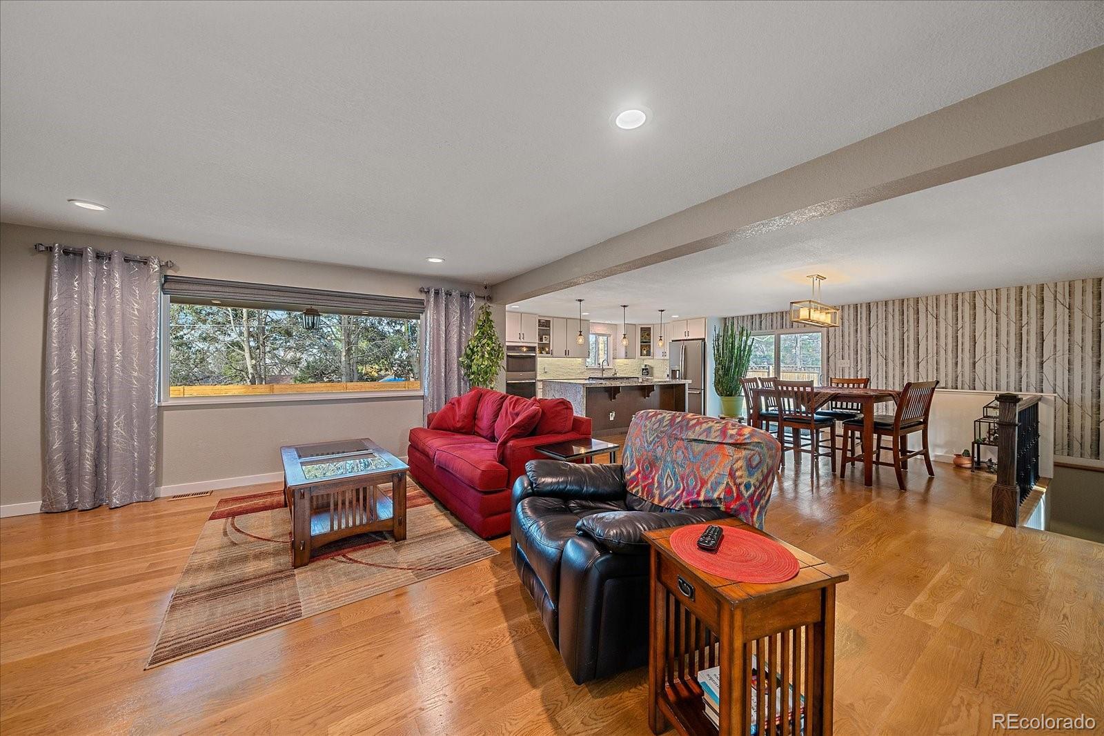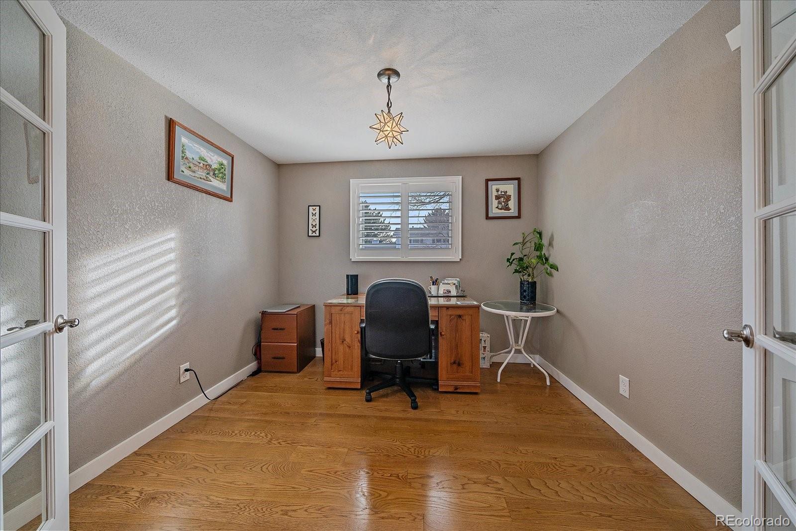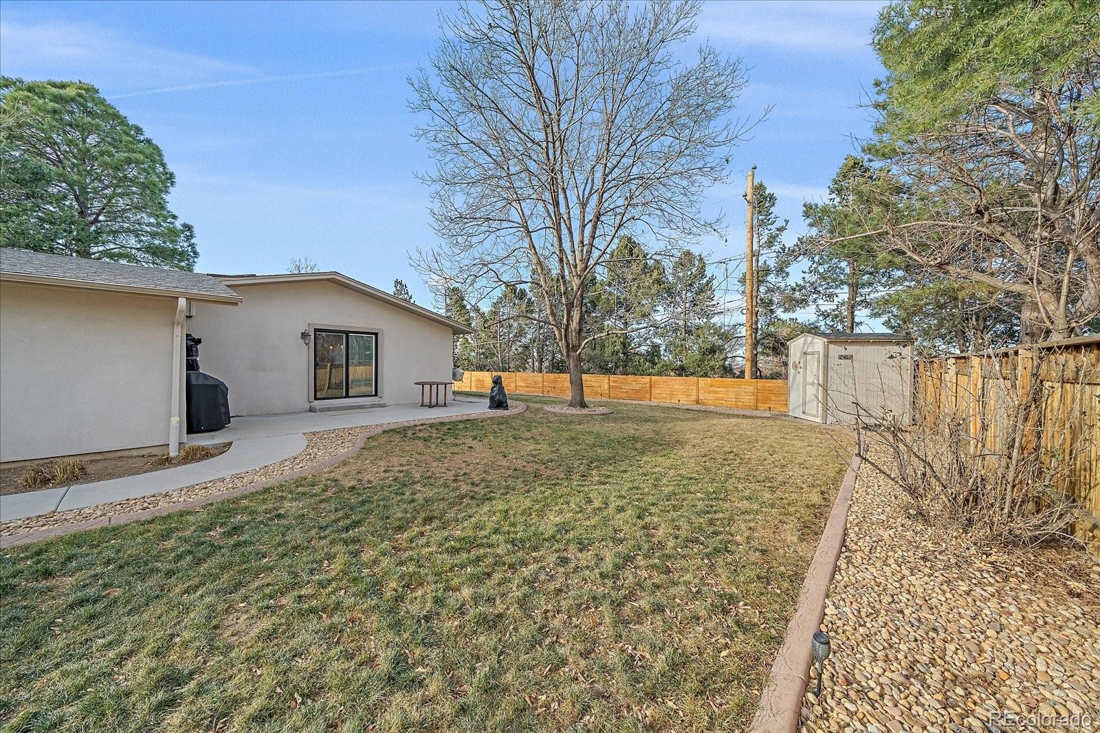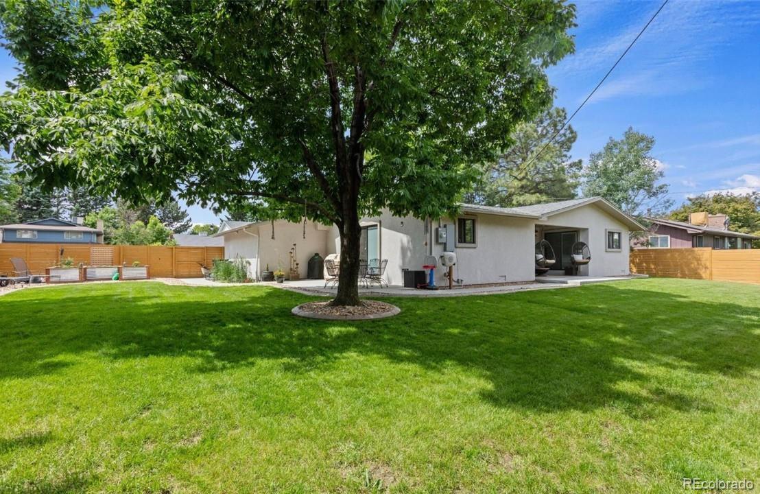Welcome home to this beautiful 3 bedroom, 2 bath south facing home located in the desirable Huntington Heights neighborhood. The beauty of this home grabs you as soon as you enter the front door. A wide open floorplan is just how you and your family like it! This home was lovingly updated fully in 2016 with high end designer finishes. These upgrades include: a marble tile floor in the foyer, a waterfall granite kitchen island with pendant lighting, recessed ceiling lights, under cabinet lighting, spacious cabinetry, stainless steel GE Kitchen appliances including a gas stove, wide plank white oak hardwood flooring and Carrara Marble used in Primary Bathroom. At the same time, efficient heating and cooling were installed, along with solid wood doors, new windows, window blinds and a new roof with high impact shingles. One of the bedrooms has been set up as a home office with French doors. The home has outstanding curb appeal with especially attractive fencing, a stucco exterior and also has plenty of room to park your vehicles with a two car garage and an additional area for a large vehicle on the driveway. One could even see adding a gate and parking an RV in the yard. The backyard is a wonderful oasis for entertaining family and friends with a groomed lawn, an open patio area and a private patio nook off the primary bedroom to enjoy your morning coffee. The home offers an unfinished basement for storage or a future finish. The location is excellent, as this home is located on the elevated portion of Arvada and has close proximity to Indian Tree Golf Course, a 6 minute drive to Olde Town Arvada (with light rail access) and a 1/2 mile walk to the popular Majestic View Park. Enjoy this home in a mature neighborhood without HOA fees. Set up a showing today!