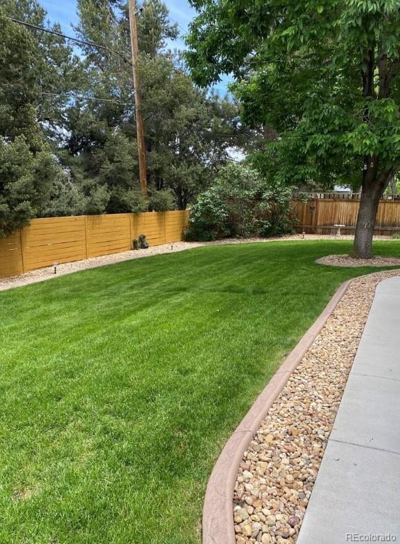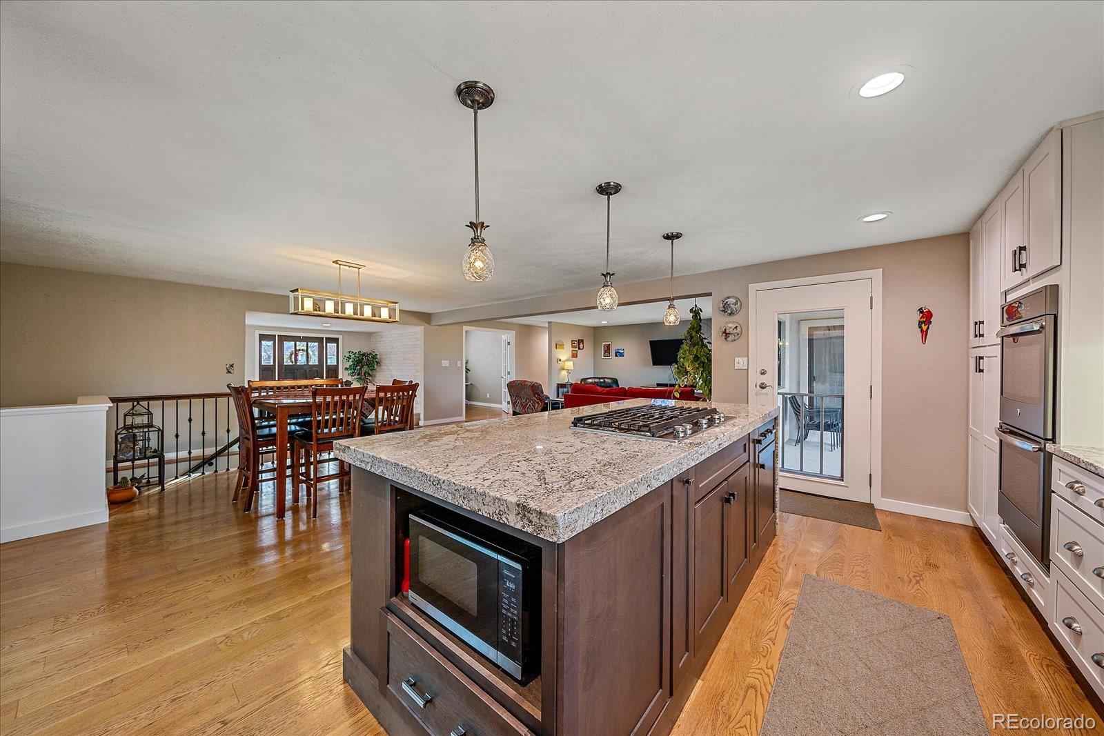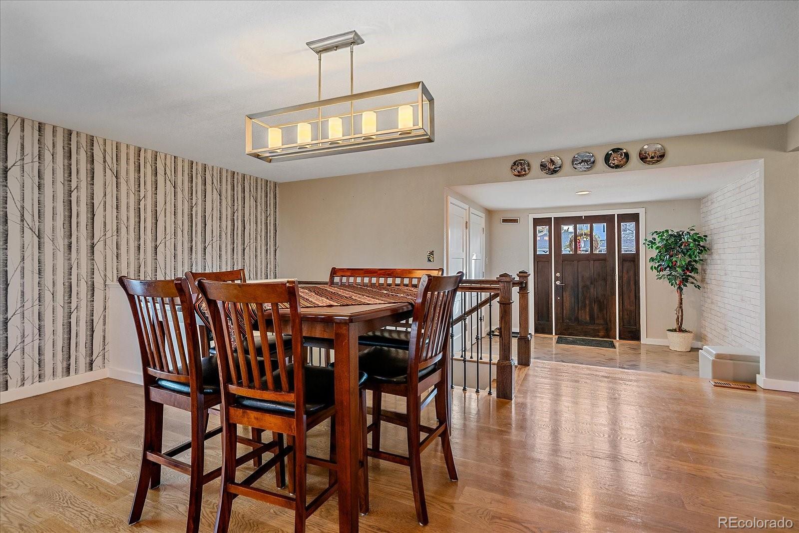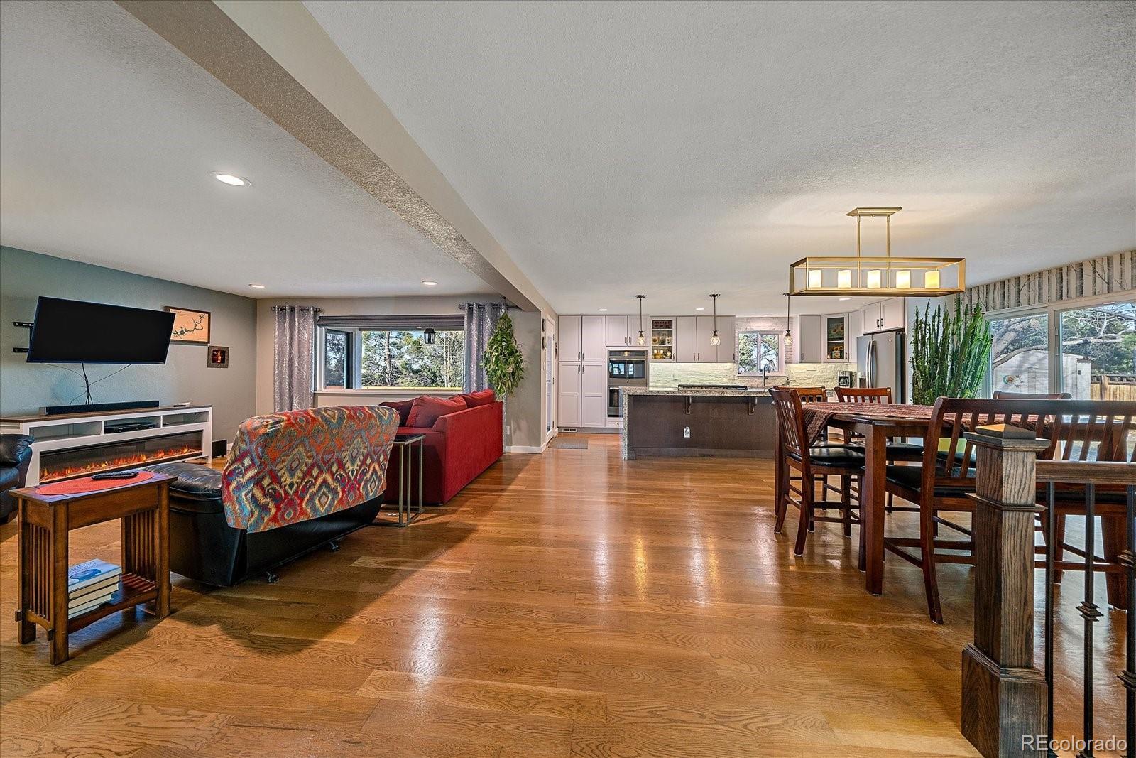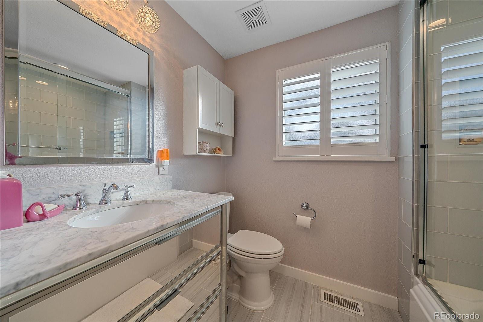 Welcome home to this beautiful 3 bedroom, 2 bath south facing home located in the desirable Huntington Heights neighborhood. The beauty of this home grabs you as soon as you enter the front door. A wide open floorplan is just how you and your family like it! This home was lovingly updated fully in 2016 with high end designer finishes. These upgrades include: a marble tile floor in the foyer, a waterfall granite kitchen island with pendant lighting, recessed ceiling lights, under cabinet lighting, spacious cabinetry, stainless steel GE Kitchen appliances including a gas stove, wide plank white oak hardwood flooring and Carrara Marble used in Primary Bathroom. At the same time, efficient heating and cooling were installed, along with solid wood doors, new windows, window blinds and a new roof with high impact shingles. One of the bedrooms has been set up as a home office with French doors. The home has outstanding curb appeal with especially attractive fencing, a stucco exterior and also has plenty of room to park your vehicles with a two car garage and an additional area for a large vehicle on the driveway. One could even see adding a gate and parking an RV in the yard. The backyard is a wonderful oasis for entertaining family and friends with a groomed lawn, an open patio area and a private patio nook off the primary bedroom to enjoy your morning coffee. The home offers an unfinished basement for storage or a future finish. The location is excellent, as this home is located on the elevated portion of Arvada and has close proximity to Indian Tree Golf Course, a 6 minute drive to Olde Town Arvada (with light rail access) and a 1/2 mile walk to the popular Majestic View Park. Enjoy this home in a mature neighborhood without HOA fees. Set up a showing today!