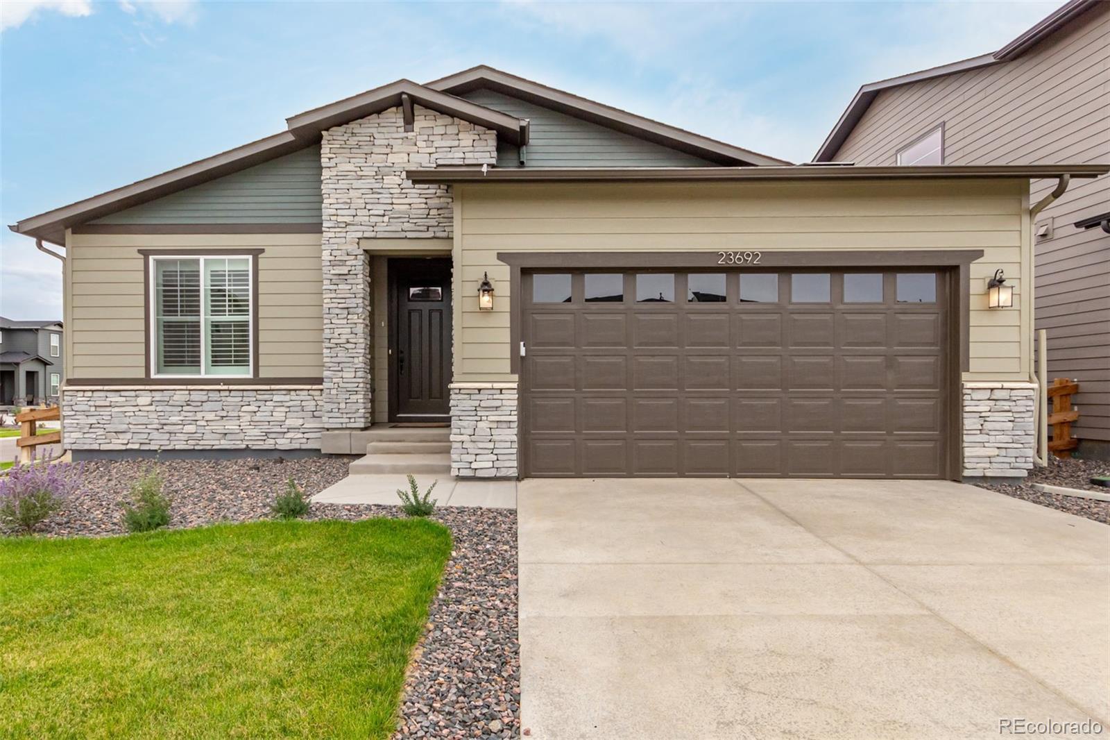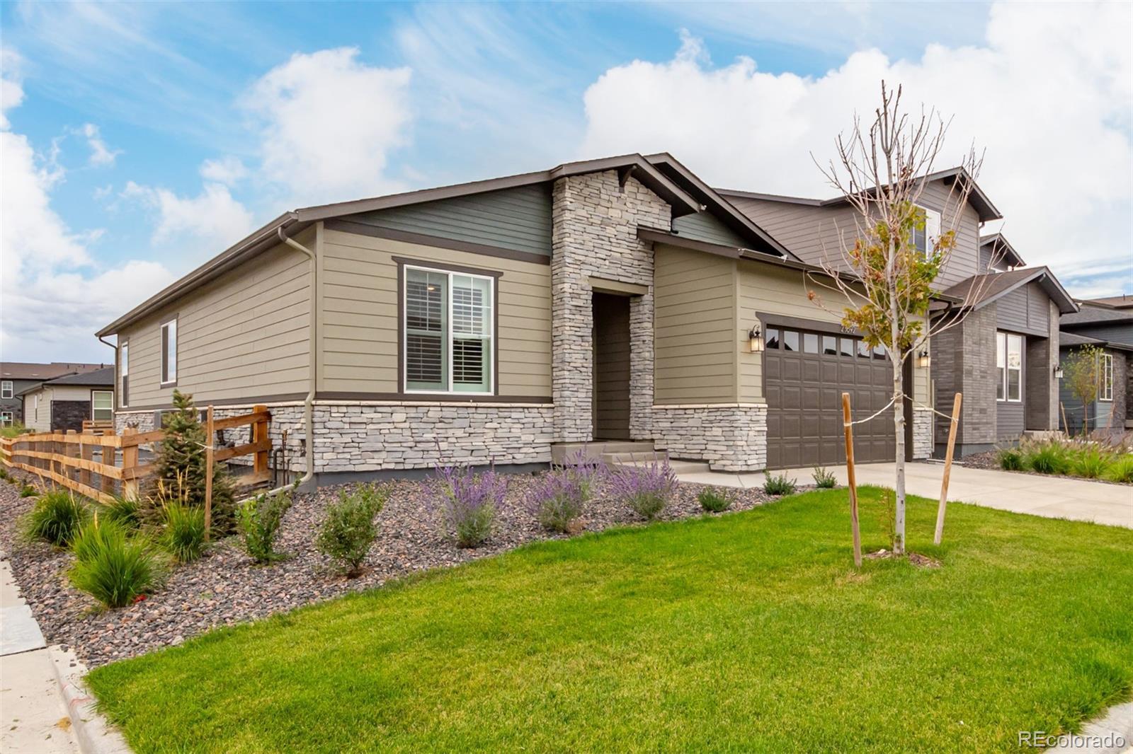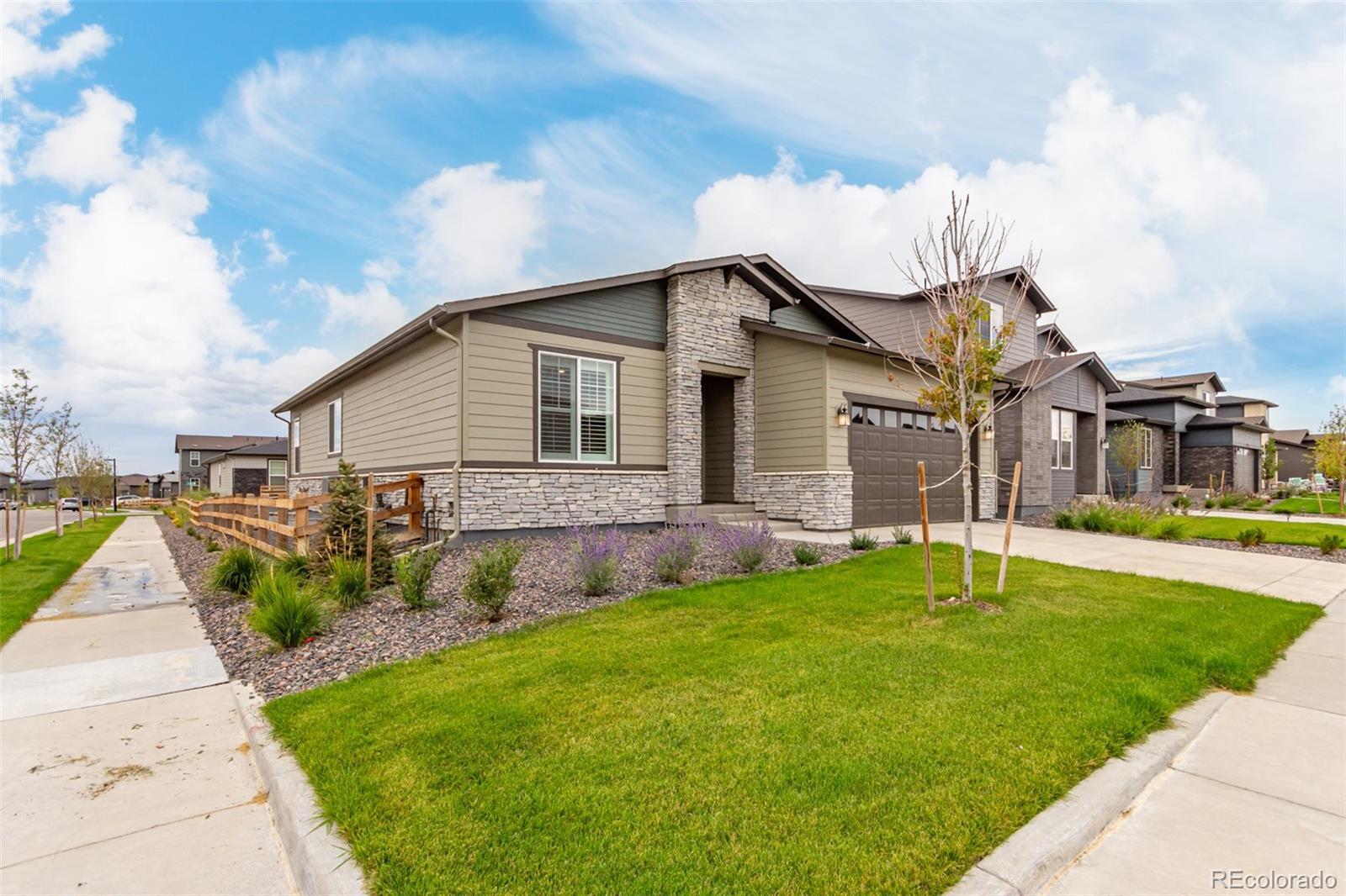 AMAZING OPPORTUNITY! Priced below acquisition cost and this does not even take into account the add-ons post closing! This 3-bedroom, Manzanita plan from Pulte, is lightly lived in and you’ll be safe from the additional expenses after closing of new landscaping, fencing and plantain shutters. This beautiful ranch home is perfectly situated on a desirable corner lot with great curb appeal, featuring a 2-car garage, open floor plan, and timeless stone accents. Step inside to discover durable luxury vinyl flooring, a neutral color palette, and large sliding doors leading to a cozy backyard with a custom-designed paver patio perfect for hosting BBQ parties. The immaculate kitchen showcases stainless steel appliances, pantry, recessed lighting, a large island with a breakfast bar, ample white cabinetry with crown molding, subway tile backsplash, and sleek quartz countertops. The primary bedroom offers a tranquil retreat with plush carpeting, an ensuite bathroom with dual sinks, and a walk-in closet. A den near the entrance is ideal for a home office, game room, or cozy retreat. When comparing this property with the new construction in the area, be sure to factor in the fact sellers have spent almost $40,000 on landscaping, fencing, and shutters post-closing. The spacious unfinished full basement can easily be transformed into a family room, recreation area, or home gym. Adding to the allure, this home is located in a beautiful, master-planned community in the suburbs of Aurora, offering 21 miles of scenic walking trails, a linear art park, and the promise of future retail shopping centers, restaurants, and recreational facilities. The community has plans for indoor and outdoor pools, as well as an ice skating rink. The Aurora Highlands is an exciting place to live, with everything centrally located for easy access to fun and leisure. This is the home you have been looking for, come see it today!