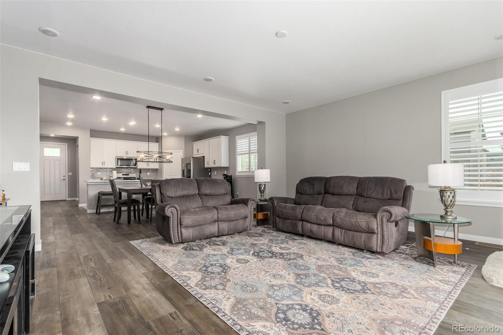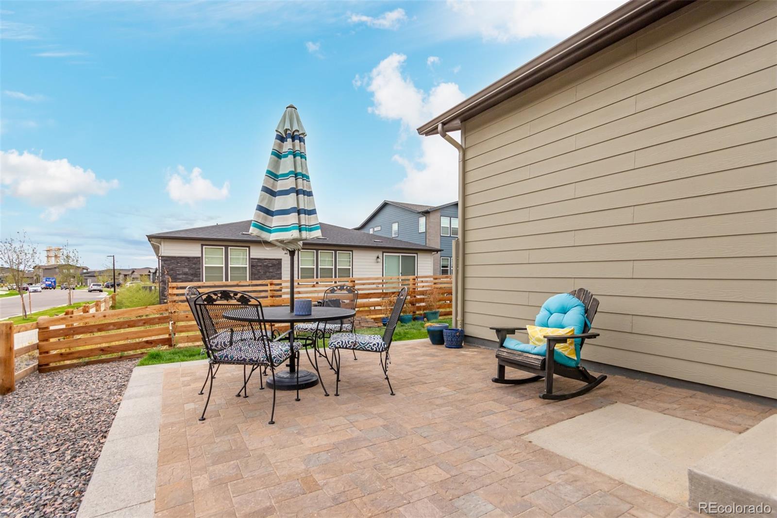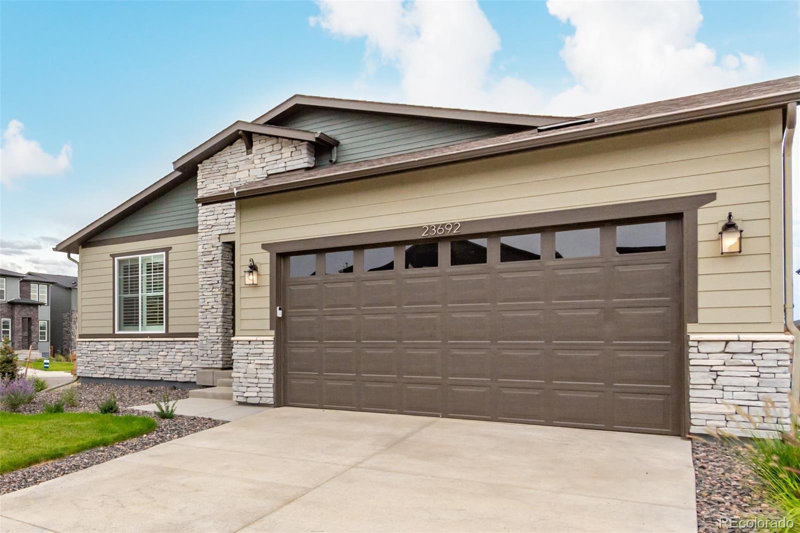 AMAZING OPPORTUNITY! Priced below acquisition cost and this does not even take into account the add-ons post closing! This 3-bedroom, Manzanita plan from Pulte, is lightly lived in and you’ll be safe from the additional expenses after closing of new landscaping, fencing and plantain shutters. This beautiful ranch home is perfectly situated on a desirable corner lot with great curb appeal, featuring a 2-car garage, open floor plan, and timeless stone accents. Step inside to discover durable luxury vinyl flooring, a neutral color palette, and large sliding doors leading to a cozy backyard with a custom-designed paver patio perfect for hosting BBQ parties. The immaculate kitchen showcases stainless steel appliances, pantry, recessed lighting, a large island with a breakfast bar, ample white cabinetry with crown molding, subway tile backsplash, and sleek quartz countertops. The primary bedroom offers a tranquil retreat with plush carpeting, an ensuite bathroom with dual sinks, and a walk-in closet. A den near the entrance is ideal for a home office, game room, or cozy retreat. When comparing this property with the new construction in the area, be sure to factor in the fact sellers have spent almost $40,000 on landscaping, fencing, and shutters post-closing. The spacious unfinished full basement can easily be transformed into a family room, recreation area, or home gym. Adding to the allure, this home is located in a beautiful, master-planned community in the suburbs of Aurora, offering 21 miles of scenic walking trails, a linear art park, and the promise of future retail shopping centers, restaurants, and recreational facilities. The community has plans for indoor and outdoor pools, as well as an ice skating rink. The Aurora Highlands is an exciting place to live, with everything centrally located for easy access to fun and leisure. This is the home you have been looking for, come see it today!