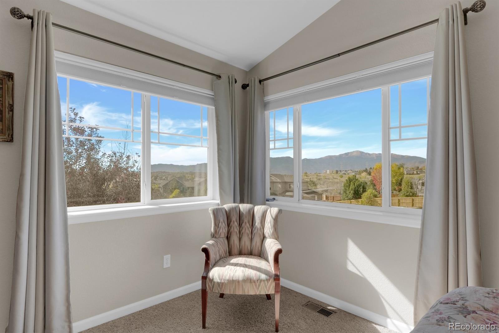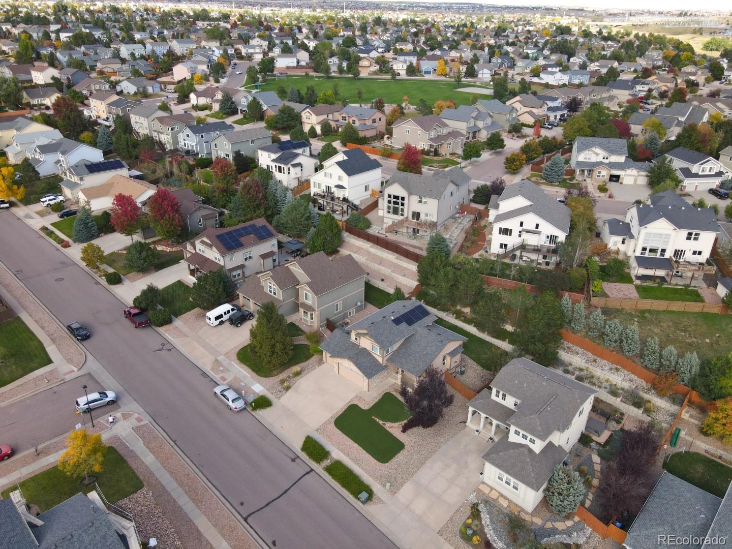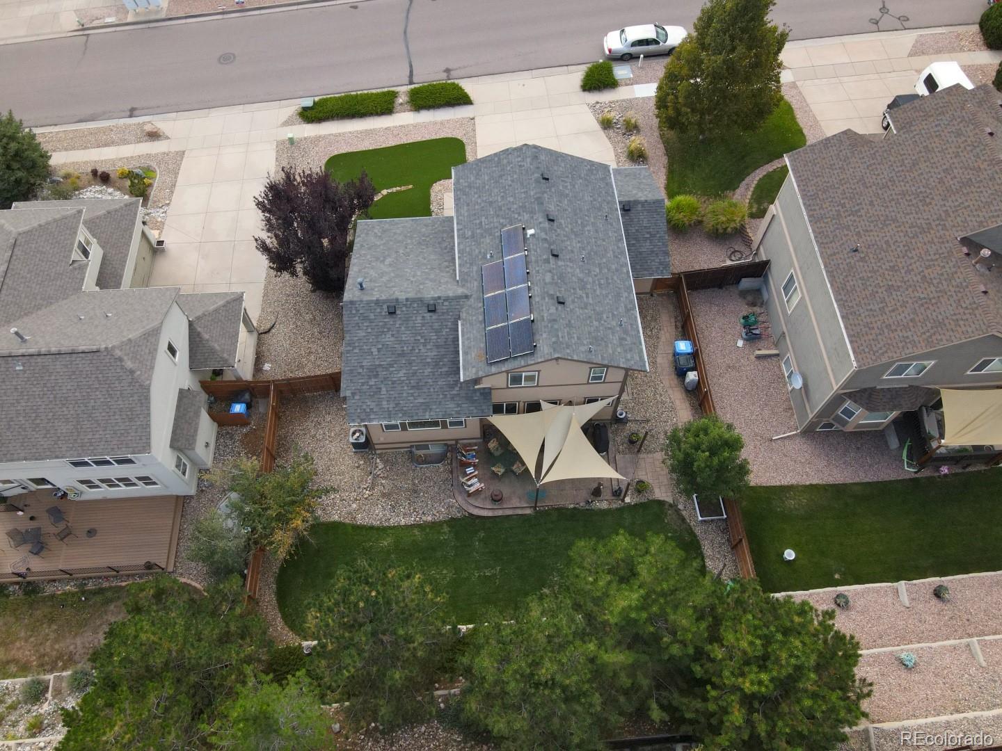 Beautiful Two-Story Home with Finished Basement and Stunning Pikes Peak Views! This spacious home offers over 2,700 sq. ft. of finished living space on a lot exceeding 8,000 sq. ft. Enjoy the inviting covered front porch and a main-level office featuring vaulted ceilings, shelves, and gorgeous Pikes Peak views. The living room boasts real hardwood floors, soaring vaulted ceilings, a cozy gas fireplace, and large windows overlooking the backyard. The kitchen and dining area continue the hardwood flooring and include 36-inch upper cabinets, solid-surface Corian countertops, a custom tile backsplash, an island, pantry, and upgraded appliances. The dining area opens to the backyard patio, perfect for entertaining. The main level also includes a laundry room with an LG stacked washer and dryer. Upstairs, you’ll find two secondary bedrooms connected by a Jack-and-Jill full bath, with one bedroom featuring a large walk-in closet. The primary suite offers vaulted ceilings, unobstructed Pikes Peak views, abundant natural light, and an attached 5-piece bath with tile floors, dual vanities, and a large walk-in closet with window and built-in shelving. The fully finished basement provides additional living space with vinyl plank wood flooring, a family/media room with recessed lighting, screen, and surround sound speakers, plus a bedroom with two walk-in closets and a full bath featuring a custom medicine cabinet. The backyard is fully fenced and showcases a custom stamped-concrete patio with lighting, lush grass, raised garden beds, and a walkway that wraps to the front. The front yard features turf landscaping, a spacious driveway, and a three-car garage. A/C. ALL NEW 2025 Exterior Paint!! 2022 Water Heater. 2021 Class 4 Roof. 2025 Refrigerator. 2019 PAID OFF Solar Panels!!