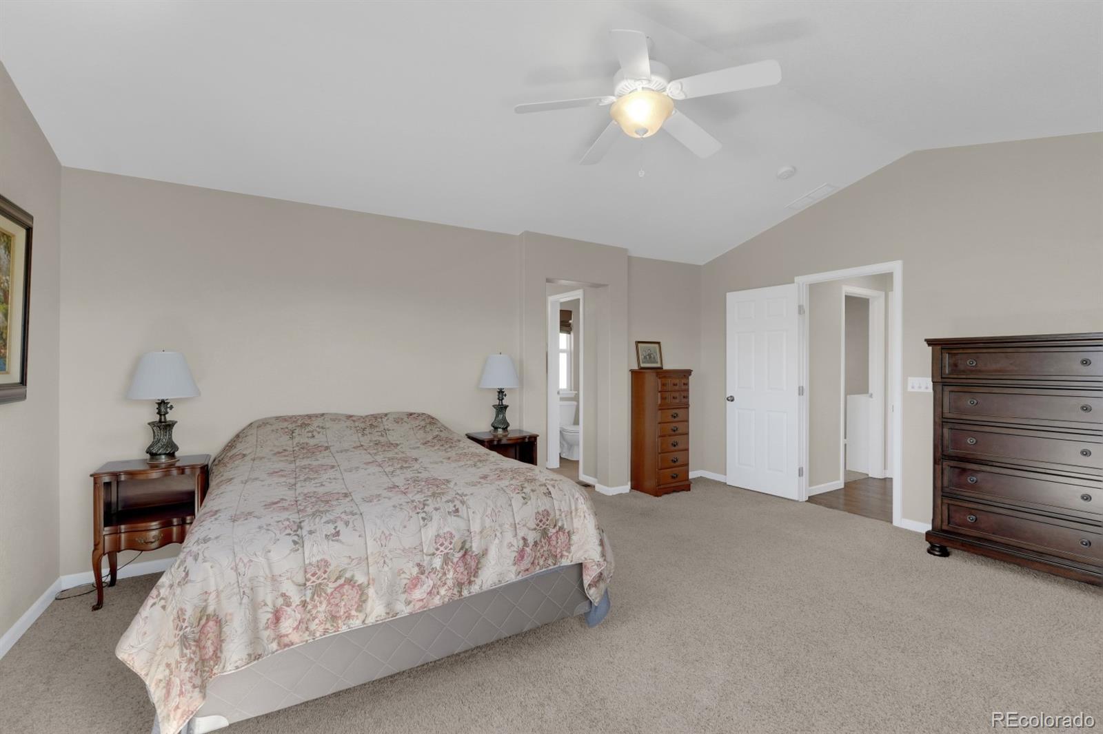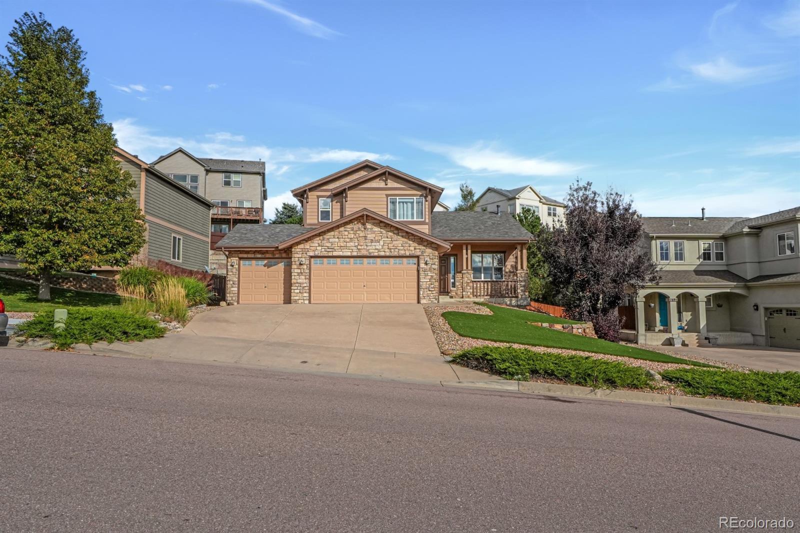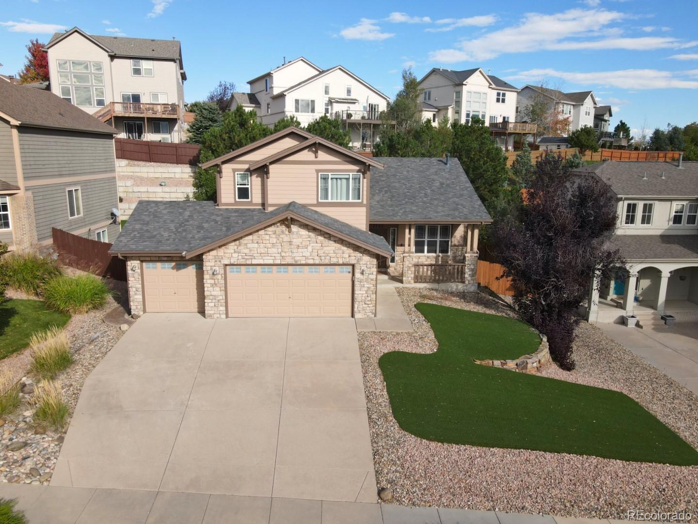 Beautiful Two-Story Home with Finished Basement and Stunning Pikes Peak Views! This spacious home offers over 2,700 sq. ft. of finished living space on a lot exceeding 8,000 sq. ft. Enjoy the inviting covered front porch and a main-level office featuring vaulted ceilings, shelves, and gorgeous Pikes Peak views. The living room boasts real hardwood floors, soaring vaulted ceilings, a cozy gas fireplace, and large windows overlooking the backyard. The kitchen and dining area continue the hardwood flooring and include 36-inch upper cabinets, solid-surface Corian countertops, a custom tile backsplash, an island, pantry, and upgraded appliances. The dining area opens to the backyard patio, perfect for entertaining. The main level also includes a laundry room with an LG stacked washer and dryer. Upstairs, you’ll find two secondary bedrooms connected by a Jack-and-Jill full bath, with one bedroom featuring a large walk-in closet. The primary suite offers vaulted ceilings, unobstructed Pikes Peak views, abundant natural light, and an attached 5-piece bath with tile floors, dual vanities, and a large walk-in closet with window and built-in shelving. The fully finished basement provides additional living space with vinyl plank wood flooring, a family/media room with recessed lighting, screen, and surround sound speakers, plus a bedroom with two walk-in closets and a full bath featuring a custom medicine cabinet. The backyard is fully fenced and showcases a custom stamped-concrete patio with lighting, lush grass, raised garden beds, and a walkway that wraps to the front. The front yard features turf landscaping, a spacious driveway, and a three-car garage. A/C. ALL NEW 2025 Exterior Paint!! 2022 Water Heater. 2021 Class 4 Roof. 2025 Refrigerator. 2019 PAID OFF Solar Panels!!