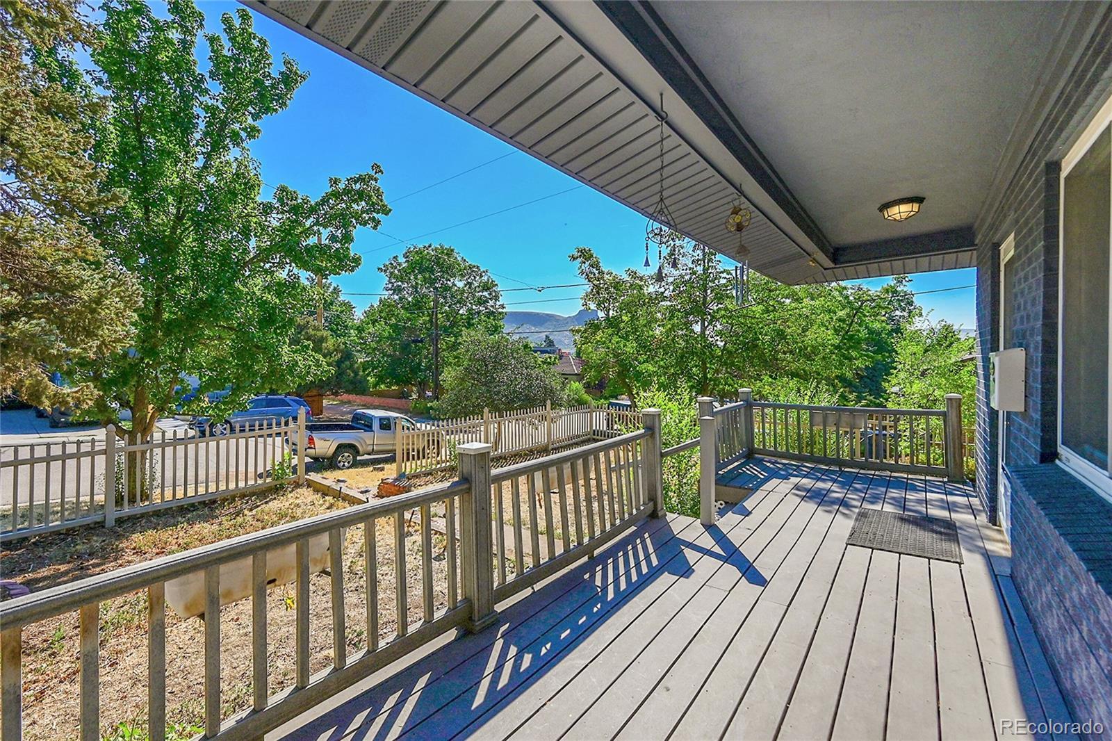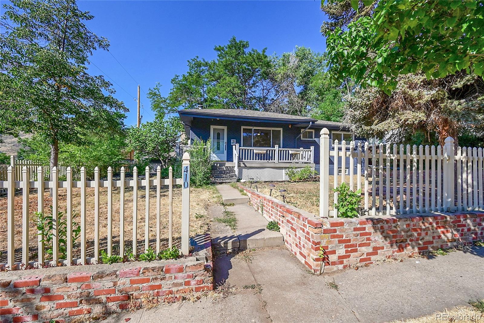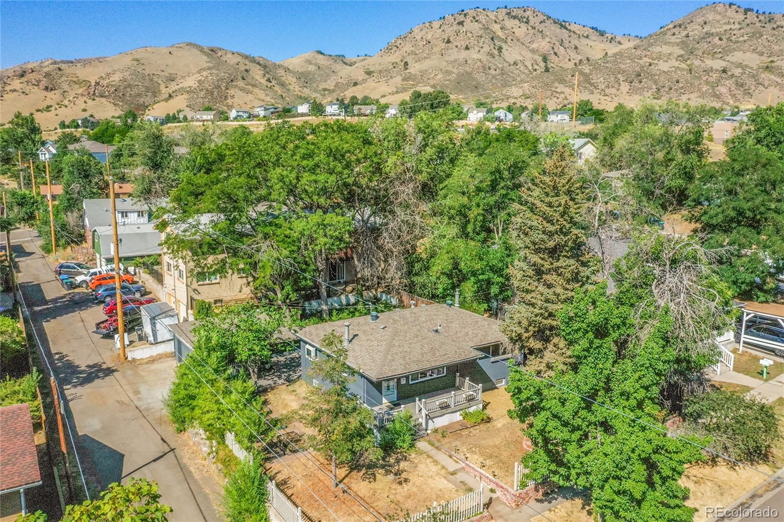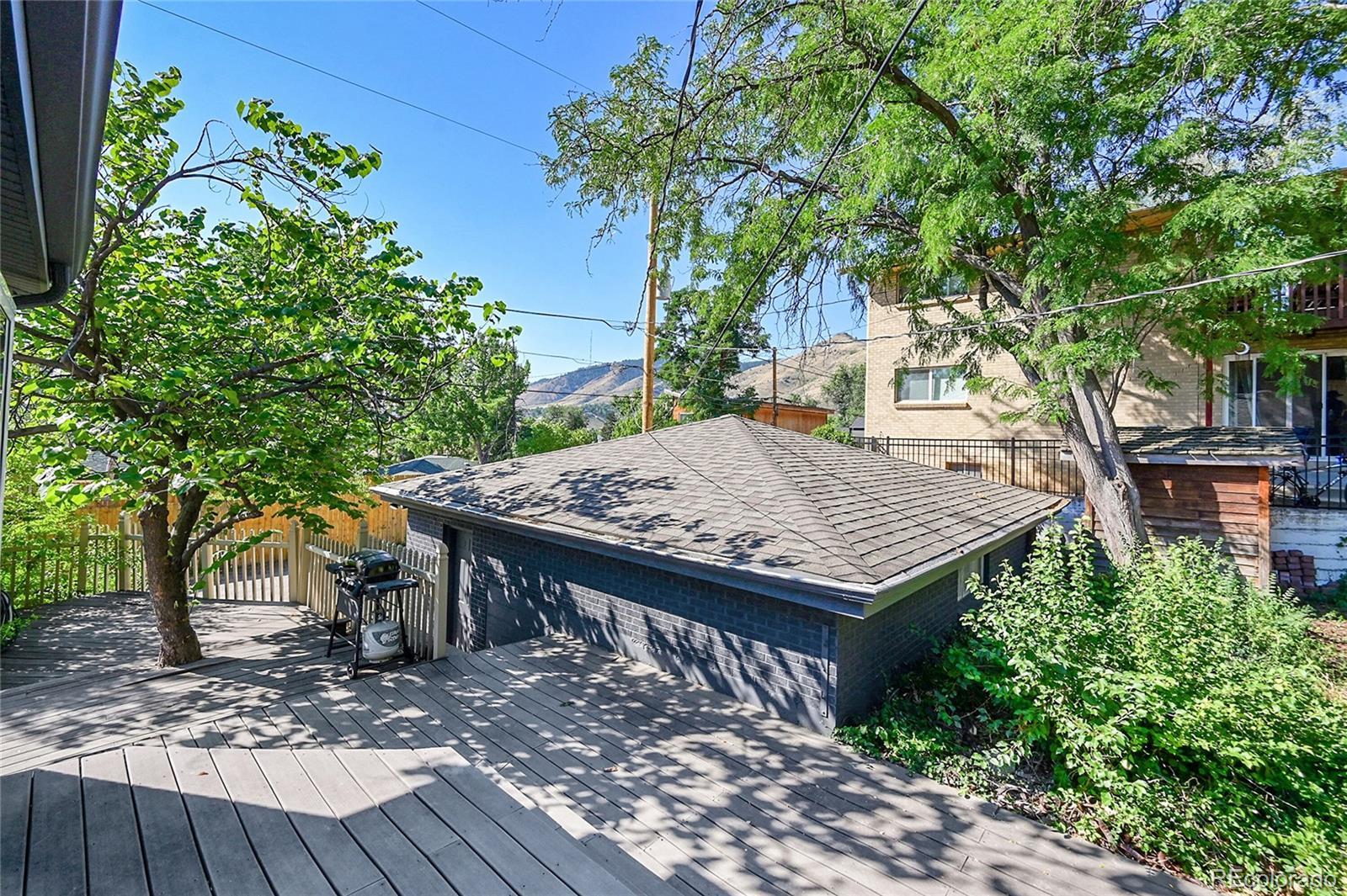 Welcome to this charming midcentury brick ranch, perfectly positioned on a spacious 7,000 sq ft corner lot in a desirable Golden neighborhood. Surrounded by mature trees that offer privacy and shade, the east-facing home with 2 trex type decks features thoughtfully landscaped garden beds on the south side and a backyard shed for additional storage. A generous two-car garage provides ample parking and workspace.Step inside from the welcoming front deck into an open and inviting floorplan. The main level boasts beautifully maintained hardwood floors, replaced windows that bring in abundant natural light, and a cozy wood-burning stove. This level includes three comfortable bedrooms with new blinds and a tastefully remodeled three-quarter bath. The updated kitchen is a true highlight, featuring warm hickory cabinetry, quartz countertops, unique brick-look tile flooring, bright greenhouse windows, and stainless steel appliances. The adjoining dining area and living room offer great space for gathering and entertaining.The fully finished lower level has been refreshed with brand new carpet and offers excellent versatility. It includes a large family room with a gas stove, an additional bedroom with an egress window, another remodeled three-quarter bath, and a spacious laundry room complete with a utility sink.Enjoy the convenience of being within walking distance to downtown Golden, with its vibrant shops, restaurants, and community amenities. With easy access to the mountains, Clear Creek Canyon, trails, parks, downtown Denver, Boulder, and beyond, this home offers the perfect blend of comfort, style, and location. Open house on 11/23 is canceled.