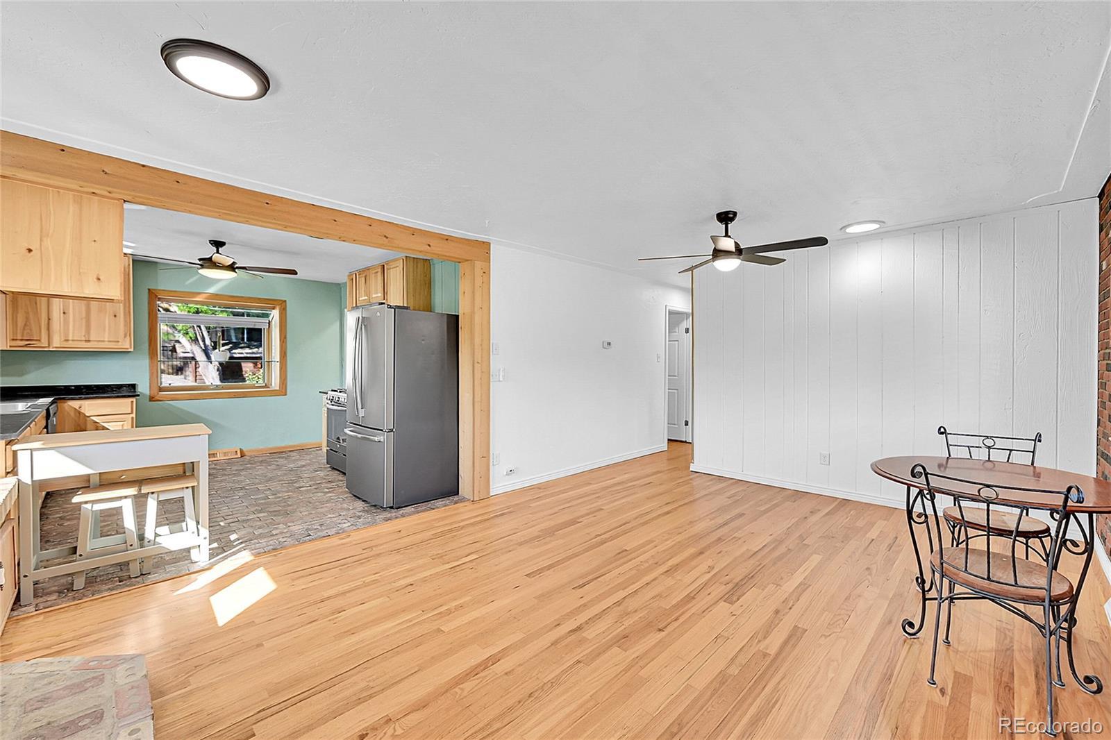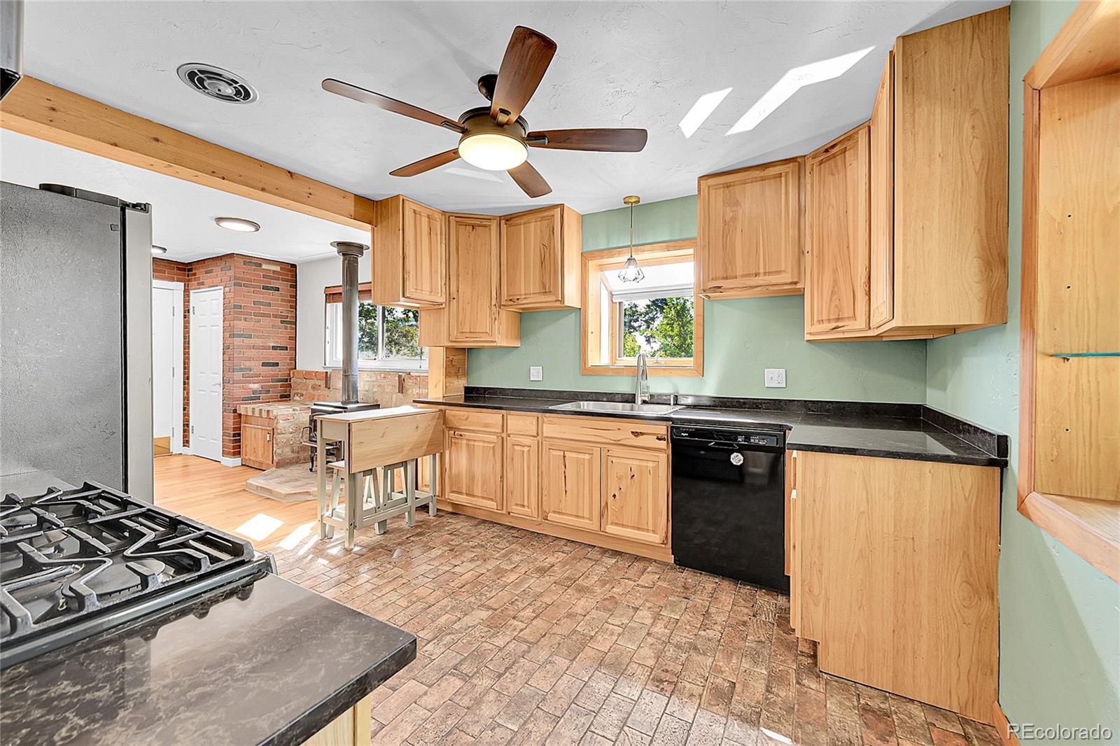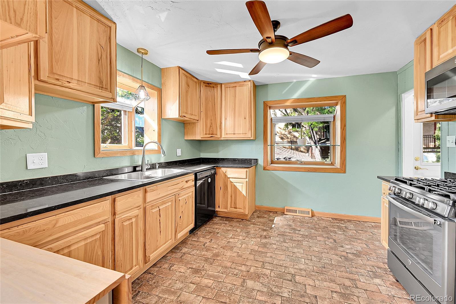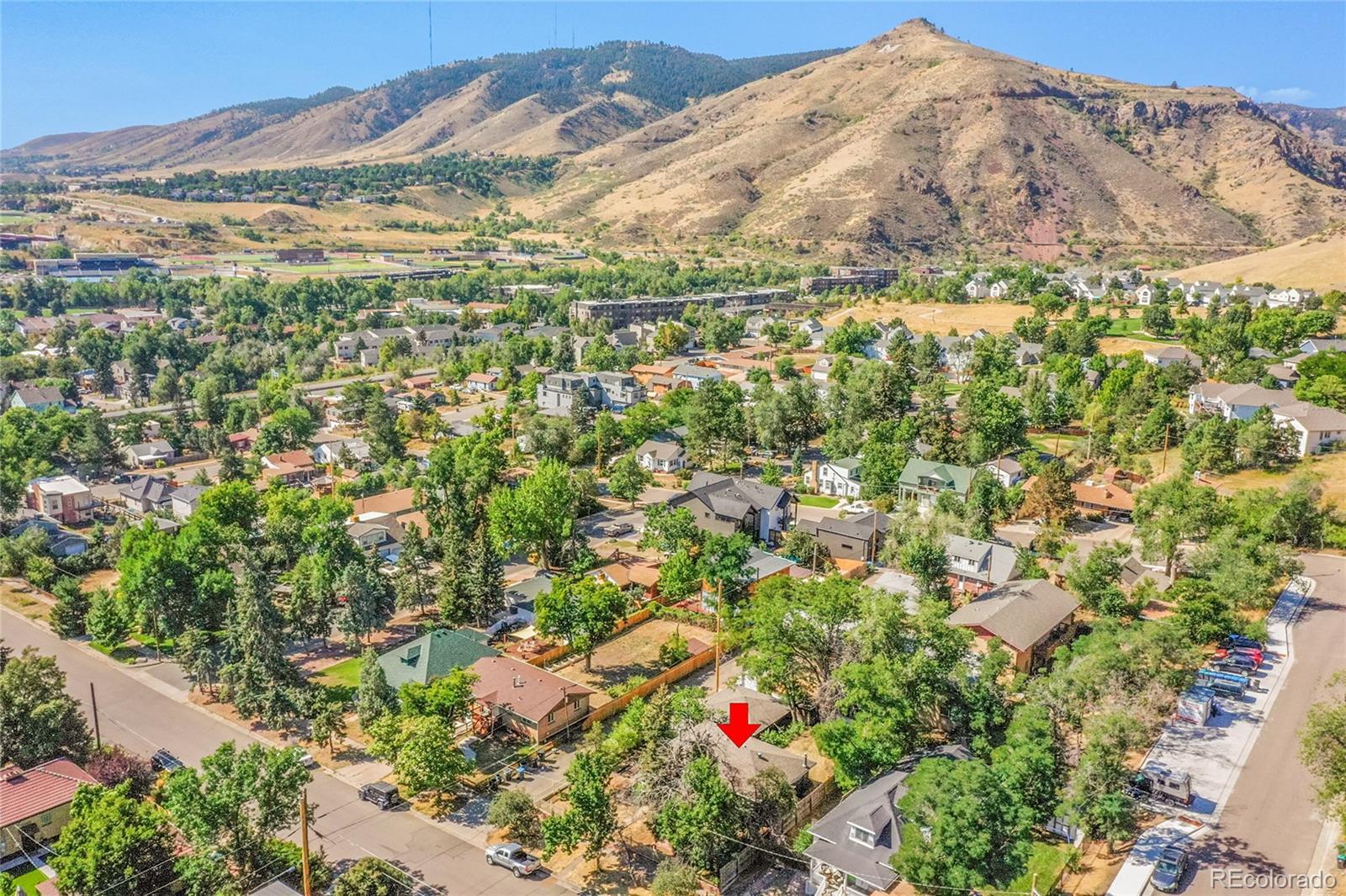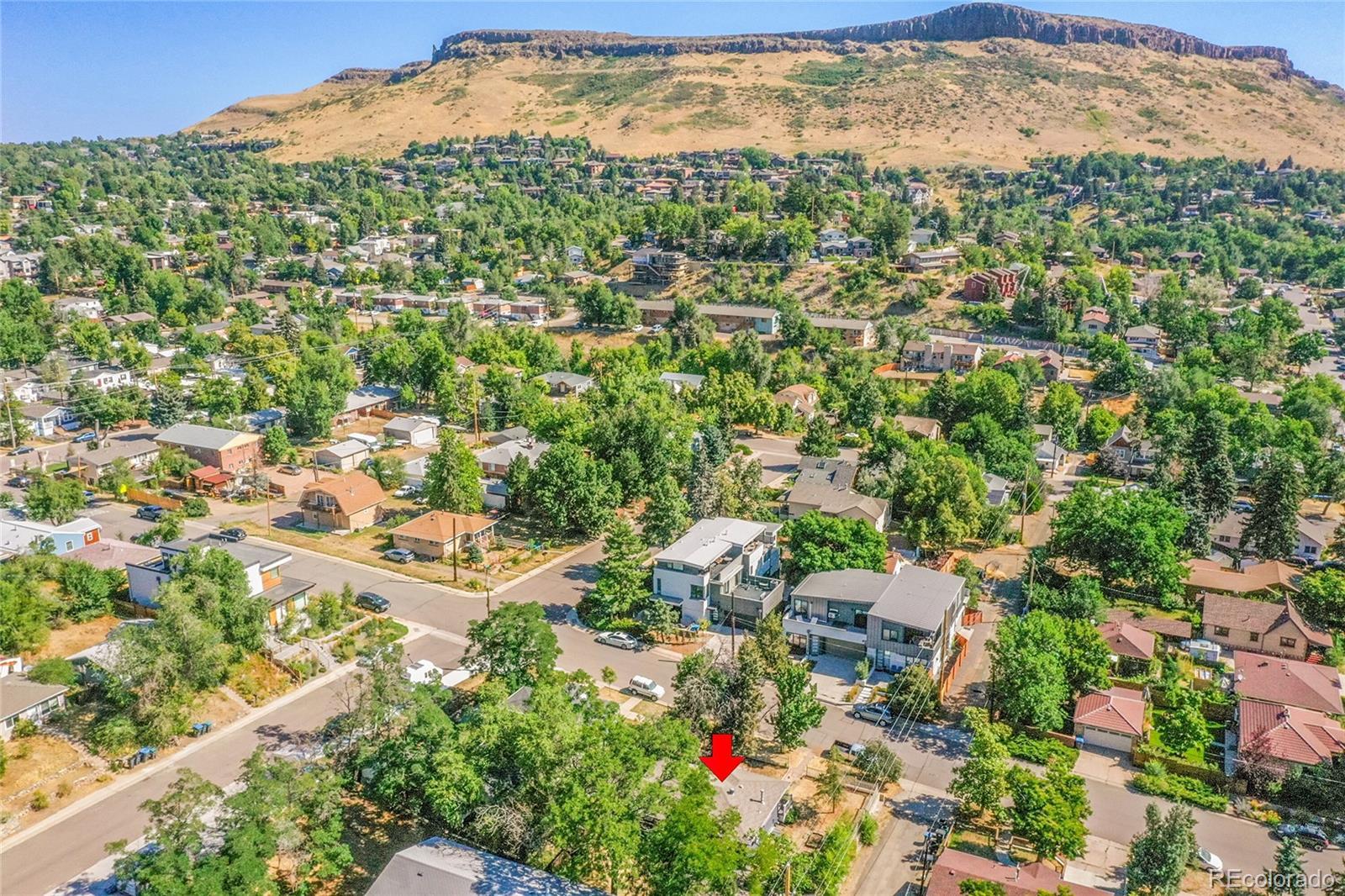 Welcome to this charming midcentury brick ranch, perfectly positioned on a spacious 7,000 sq ft corner lot in a desirable Golden neighborhood. Surrounded by mature trees that offer privacy and shade, the east-facing home with 2 trex type decks features thoughtfully landscaped garden beds on the south side and a backyard shed for additional storage. A generous two-car garage provides ample parking and workspace.Step inside from the welcoming front deck into an open and inviting floorplan. The main level boasts beautifully maintained hardwood floors, replaced windows that bring in abundant natural light, and a cozy wood-burning stove. This level includes three comfortable bedrooms with new blinds and a tastefully remodeled three-quarter bath. The updated kitchen is a true highlight, featuring warm hickory cabinetry, quartz countertops, unique brick-look tile flooring, bright greenhouse windows, and stainless steel appliances. The adjoining dining area and living room offer great space for gathering and entertaining.The fully finished lower level has been refreshed with brand new carpet and offers excellent versatility. It includes a large family room with a gas stove, an additional bedroom with an egress window, another remodeled three-quarter bath, and a spacious laundry room complete with a utility sink.Enjoy the convenience of being within walking distance to downtown Golden, with its vibrant shops, restaurants, and community amenities. With easy access to the mountains, Clear Creek Canyon, trails, parks, downtown Denver, Boulder, and beyond, this home offers the perfect blend of comfort, style, and location. Open house on 11/23 is canceled.