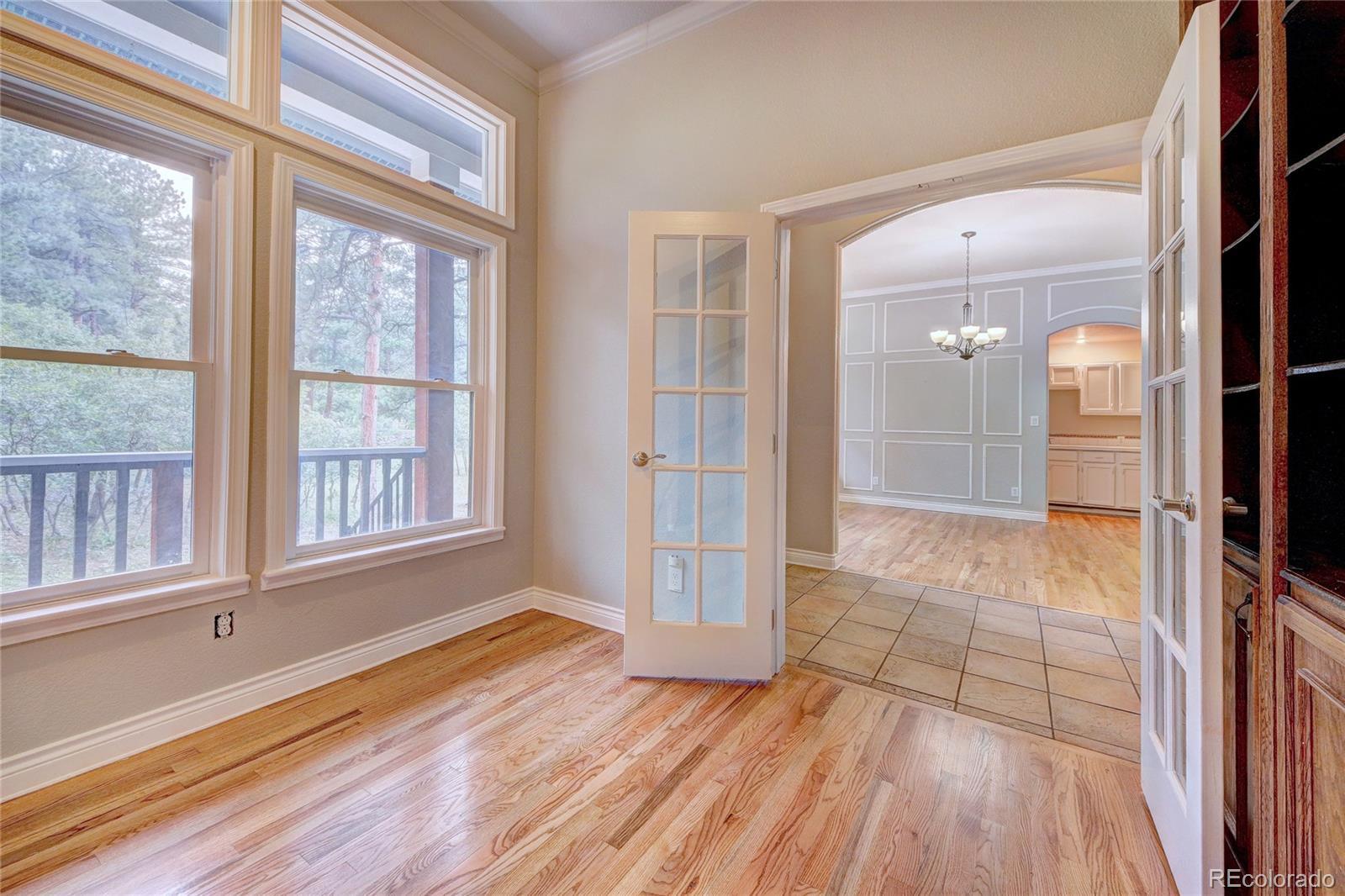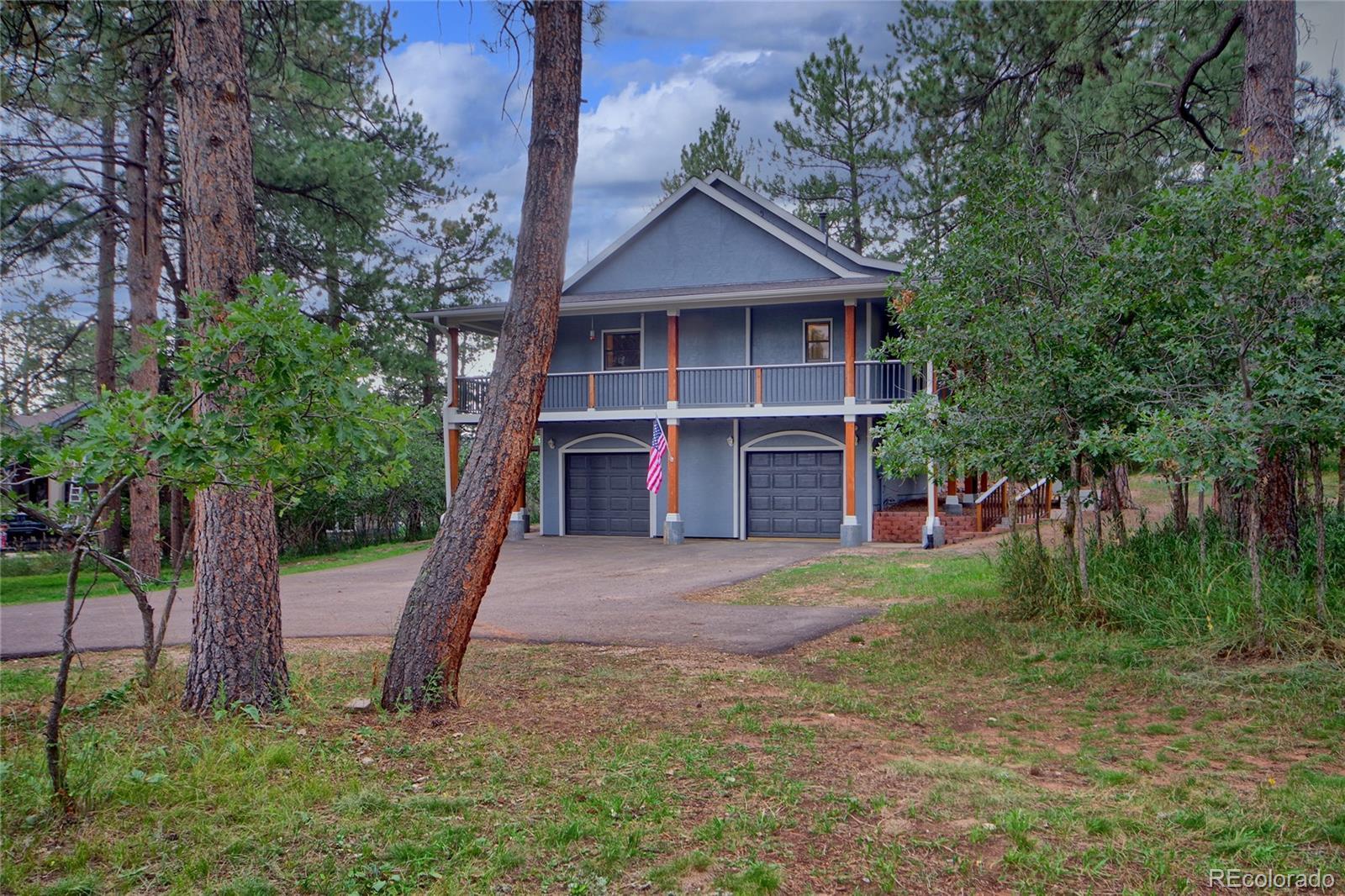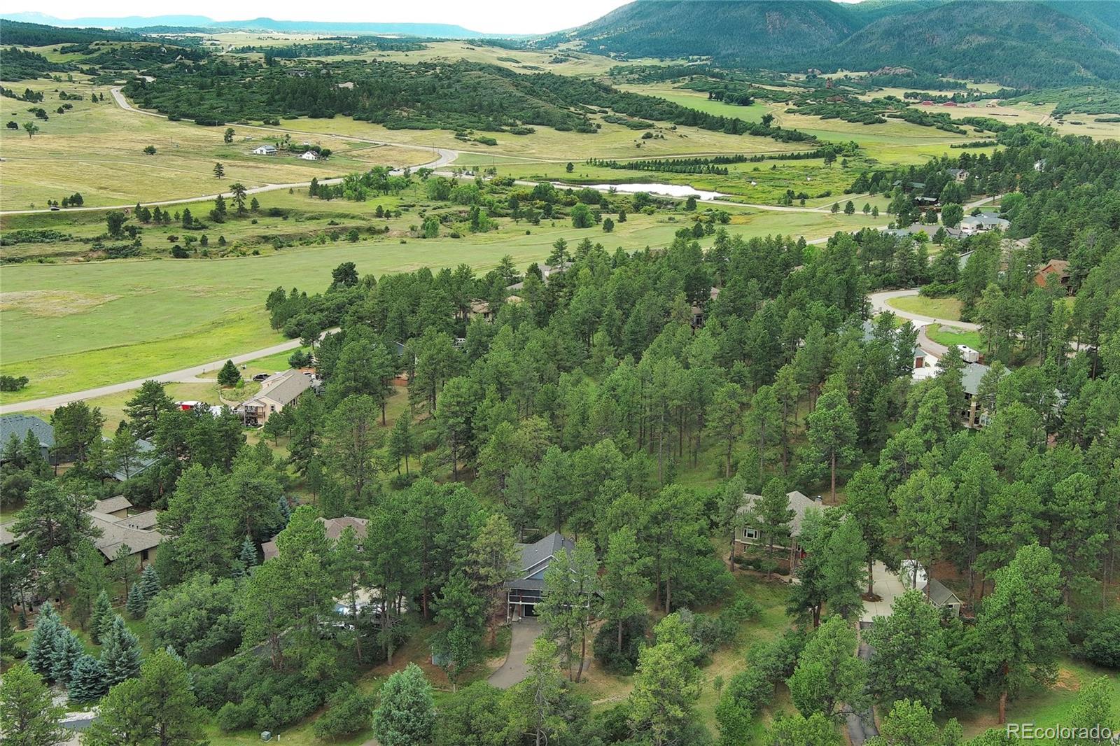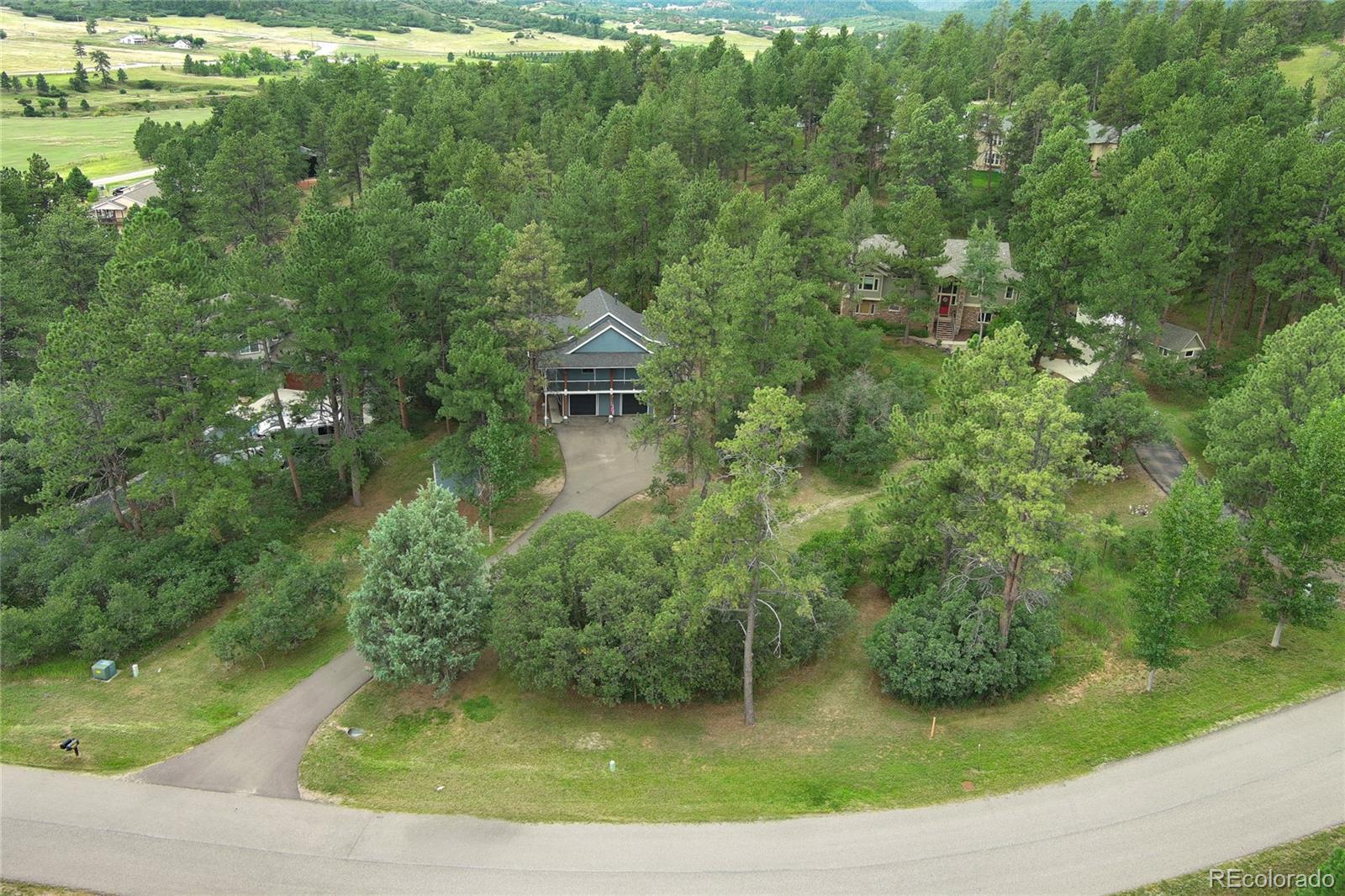 Imagine a story-book custom home nestled in pine trees and scrub oak on almost 1 acre in prestigious Perry Park! The beautiful flat lot adds lots of privacy with varying types of trees. Home backs to open space! Approaching the home you notice fresh paint, wood windows and composite decking. Steps leading to a grand entrance. You walk up to a wrap-around deck (3 sides of the house). Once inside you are invited to a warm entrance with hardwood flooring, an office with french doors, a formal dining room and a living room with gas fireplace. The 9' ceilings and natural lighting make a statement! The updated kitchen has a gas stove, stainless steel appliances, door to the deck and breakfast area, a pantry, butler's pantry and convenient half-bath! Then down the hall is the master bedroom, hardwood floors with a huge walk-in closet. Adjacent is a custom bath with walk-in shower, with deep soaking tub, double vanity and another door to the deck! Downstairs are two ample bedrooms, a family room with outside access, a full bath and utility room. The boiler provides efficient gas in floor radiant heat, heating including the garage! Plenty of room for RVs, golf-carts, toys, etc. with no HOA! Put this on the TOP of your list!