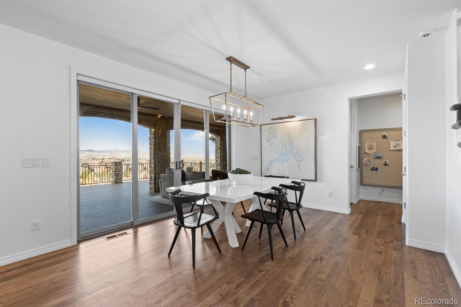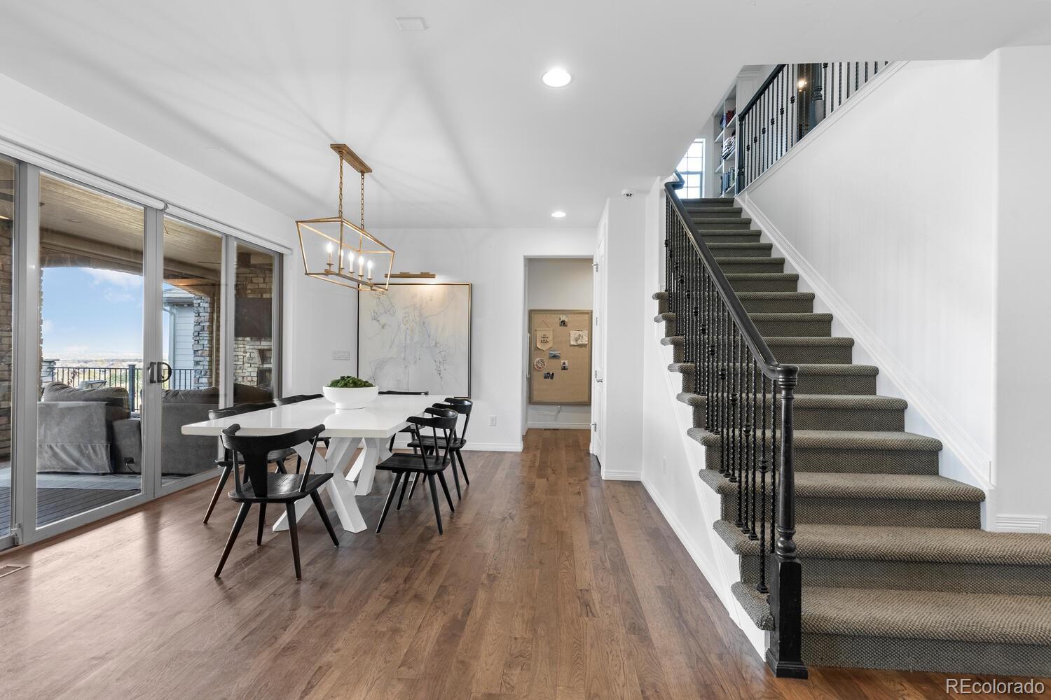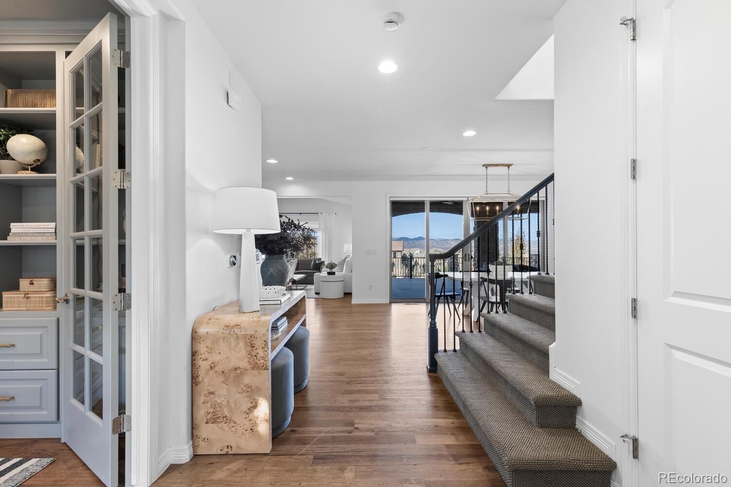 Views, Views, Views! This stunning home in the gated community of BACKCOUNTRY showcases breathtaking mountain views and interior upgraded designer finishes throughout. The gourmet kitchen features a spacious center island—perfect for entertaining—and flows seamlessly into the great room, highlighted by a floor-to-ceiling stone fireplace. The main level also includes a private office with custom built-ins, a dining room with deck access, and a large versatile laundry room complete with a built-in desk ideal for studying, crafts, or a home workstation. Upstairs, the expansive primary suite with custom millwork offers a luxurious retreat with dual closets and a vanity area in the primary bath. The upper level also includes a loft, two bedrooms with a shared Jack-and-Jill bath, and a fourth bedroom with its own en-suite bath. The lower level is designed for fun and functionality, featuring a great room with a kids’ climbing wall, a family room with built-ins that make a perfect theater space, an additional office with a barn door, and a powder bath. Step outside to the extended deck and soak in the incredible sunsets by the outdoor fireplace—a perfect spot to unwind and enjoy the view. Great location backing and fronting to OPEN SPACE! Embrace the Backcountry lifestyle with resort-style pools, a fitness facility, trails, parks, ponds, and so much more.