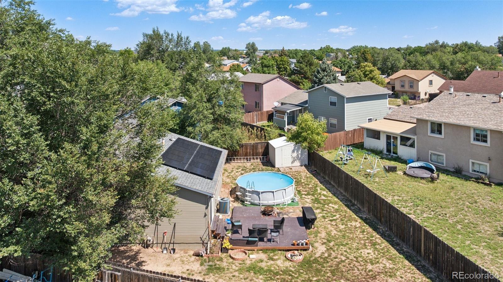 Welcome to this charming ranch-style home in the established Heritage neighborhood, perfectly located near parks, schools, and shopping. This move-in ready property offers 4 bedrooms, 2 bathrooms, and over 1,700 finished square feet of living space. Step inside to find a bright and open living room with large windows that fill the space with natural light. The main level features two bedrooms, a full bathroom, and a cozy dining area off the kitchen. The kitchen is equipped with solid surface countertops and all major appliances, making meal prep a breeze.You’ll also find a bonus room with a sliding glass door leading to the backyard, adding flexibility for hobbies, workouts, or an extra entertainment space. Downstairs, the finished basement provides even more living space with an additional two bedrooms, full bath, laundry area, and a spacious family room—perfect for guests, a home office, or movie nights. Step outside and enjoy Colorado evenings in your fenced backyard featuring a composite deck, an above-ground pool, and plenty of space for summer barbecues and outdoor fun. This home also comes equipped with paid-off solar panels, helping keep utility costs low year-round. Additional highlights include central air conditioning, ceiling fans, vinyl windows, and a 2-car attached garage. Located in Harrison School District 2, this home is within walking distance to Centennial Elementary, Panorama Middle, and Sierra High School, making it a convenient choice for families. With easy access to Academy Blvd and nearby shopping centers, this home balances comfort and convenience. This Bowman Court gem has it all—schedule your private showing today!