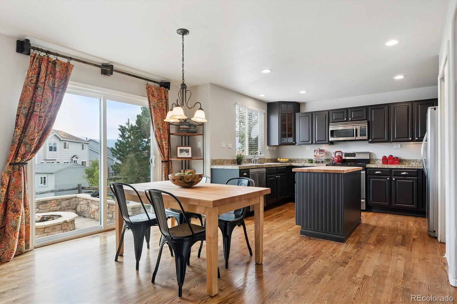Welcome to this beautifully maintained, move-in ready home on a spacious corner lot in the heart of Jackson Creek. Owned and lovingly cared for by its original owner, this five-bedroom, four-bath home offers the space, layout, and comfort today’s buyers are looking for—paired with thoughtful updates throughout, including a brand-new roof for peace of mind.Step inside to soaring vaulted ceilings, abundant natural light, and oak hardwood floors in pristine condition. The open main level is designed for everyday living and easy entertaining, with the kitchen, family room, and dining areas flowing seamlessly together. The kitchen features freshly painted cabinetry, granite tile countertops, a butcher block island, stainless steel appliances, and plenty of storage. Upstairs, you’ll find four spacious bedrooms—an ideal setup for families—along with a conveniently located laundry closet. The primary suite feels like a true retreat, offering vaulted ceilings, mountain views, a walk-in closet, and a five-piece bath. The finished basement expands your living space with a fifth bedroom, full bathroom, and a cozy media room—perfect for movie nights, guests, or a private home office—plus additional unfinished storage space. Outside, enjoy quiet Colorado evenings on the backyard patio with a built-in firepit, surrounded by mature landscaping and room to relax or play. An oversized attached two-car garage adds everyday convenience. Located in the desirable Jackson Creek neighborhood, this home is close to top-rated Lewis-Palmer schools, parks, trails, and all that Monument has to offer—with quick access to I-25 for easy commuting north or south. This is a rare opportunity to own a well-cared-for, turn-key home in one of Monument’s most established communities.