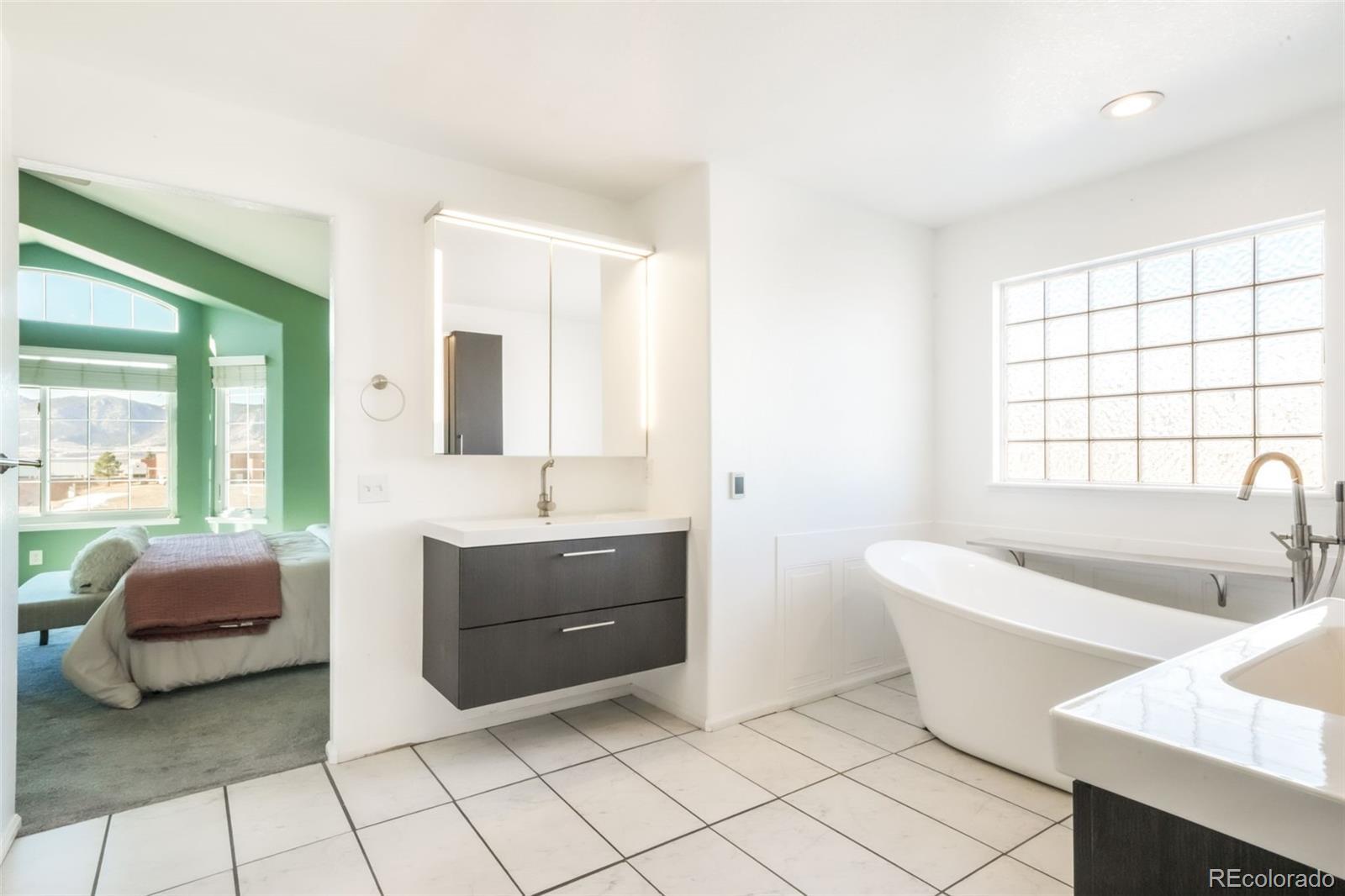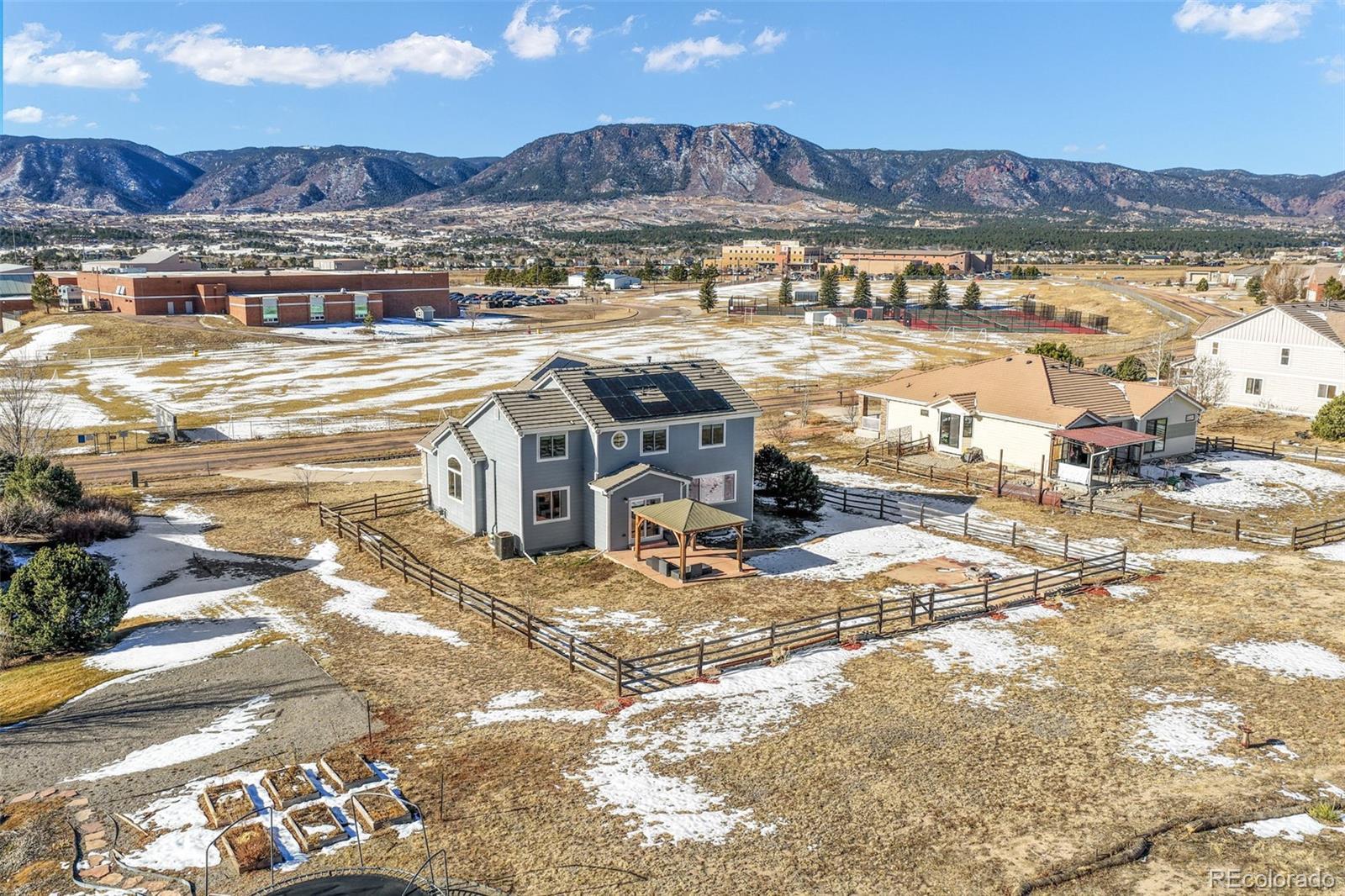 Beautifully updated and exceptionally well cared for two-story home in desirable Woodmoor Greens in Monument, set on a rare .63-acre lot backing to open space with sweeping Pikes Peak views. From the moment you arrive, the curb appeal stands out with a curved driveway offering extra parking and a spacious three-car garage. An added bonus are the paid-off solar panels, providing long-term energy savings and efficiency. Inside, the home features high ceilings and luxury vinyl plank flooring throughout the main level. The entry welcomes you with a dedicated office to the right and an elegant open staircase leading upstairs. A formal living room flows seamlessly into the formal dining room, perfect for gatherings. The kitchen offers abundant cabinet and counter space, a beautiful tile backsplash, double ovens, a large island, and an attached eat-in area with direct access to the expansive backyard. The kitchen opens to the family room, featuring a stone-surround fireplace with a wood mantle. The main level also includes a full bathroom with a tub/shower combination and a convenient laundry room. Upstairs, the spacious primary suite features an updated bathroom with dual vanities, updated cabinetry, a freestanding tub, large walk-in tile shower, radiant floor heat, and a custom closet system. Three additional bedrooms complete the upper level, two of which share a Jack-and-Jill bathroom. Large windows throughout provide abundant natural light. The unfinished basement offers rough-in plumbing for a future bathroom and endless potential. Additional features include central air conditioning and a large fenced backyard with pergola, ideal for enjoying Colorado’s outdoor lifestyle and incredible views. With easy access to I-25 and located near beautiful downtown Monument, within walking distance of Lewis-Palmer High School, the location truly doesn’t get much better than this.