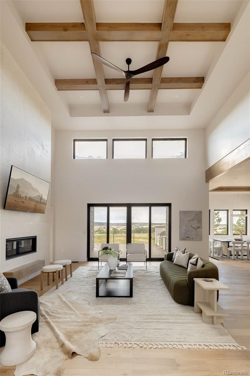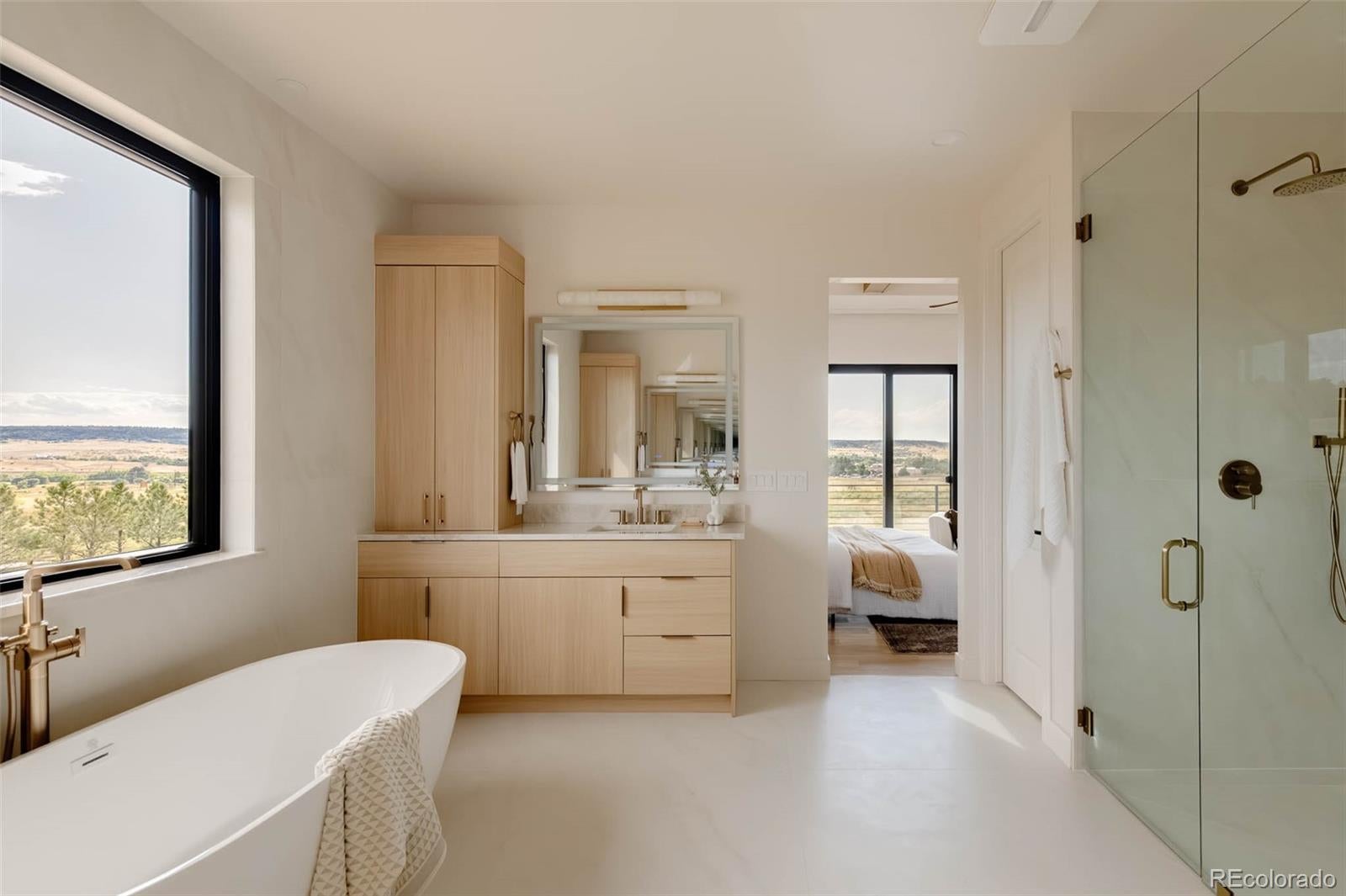 Perched on 2 pristine acres with panoramic views from every room, this brand-new ranch offers 5 bedrooms, 6 bathrooms, and a 3-car garage across 4,945 SQFT. The grand entryway with built-in shelving opens into an airy, open-concept main floor that flows from living to dining to kitchen. The dining room showcases coffered ceilings and designer lighting, while the gourmet kitchen features Taj Mahal quartzite counters carried up the backsplash, oak cabinetry, champagne bronze fixtures, and a custom hood vent. Chef-grade appliances include a gas range, Viking refrigerator, and a glass-encased wine rack, creating the ultimate entertainer’s space. Designer lighting enhances every detail, complemented by European white oak floors and graceful arches for timeless elegance. The powder bath is a showpiece with a wood-slat tiled wall, floating vanity, and exotic counters. The great room impresses with soaring two-story ceilings, wood beam accents, and a dramatic fireplace with built-ins and lighting. Sliders open to a covered patio with a built-in grill, perfect for gatherings. The primary suite is a private retreat with wood-beam details, a balcony with sweeping views, heated flooring, and a spa-inspired bath offering double vanities, a walk-in shower, European soaking tub, and dual custom walk-in closets. The main level also includes a private study, laundry with built-ins, and two additional bedrooms with en-suites. The finished walkout basement adds a wet bar, second living area, gym, 2 bedrooms, 2 bathrooms, and a second laundry room—ideal for entertaining or multi-generational living. Stone and wood accents highlight the exterior, paired with professional landscaping for ultimate curb appeal. Access the gate from Highway 83, NOT Highway 86. The gate is open from 6am–8pm, no code is required.