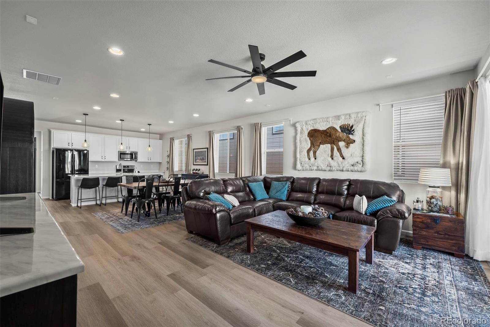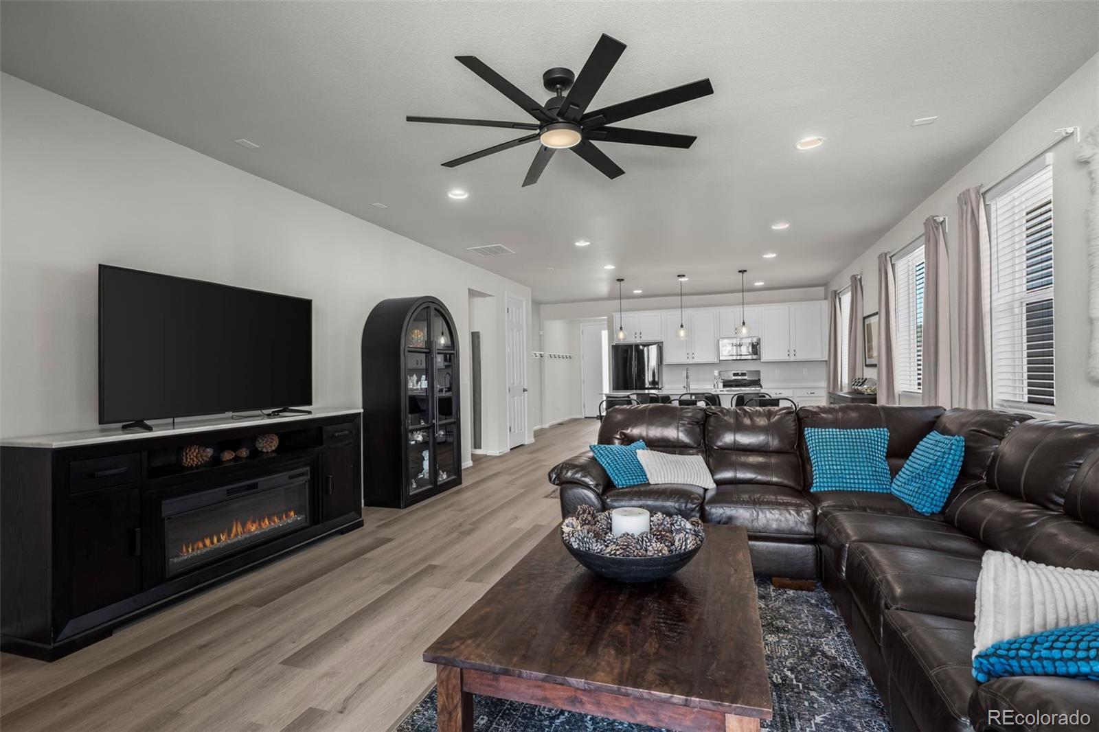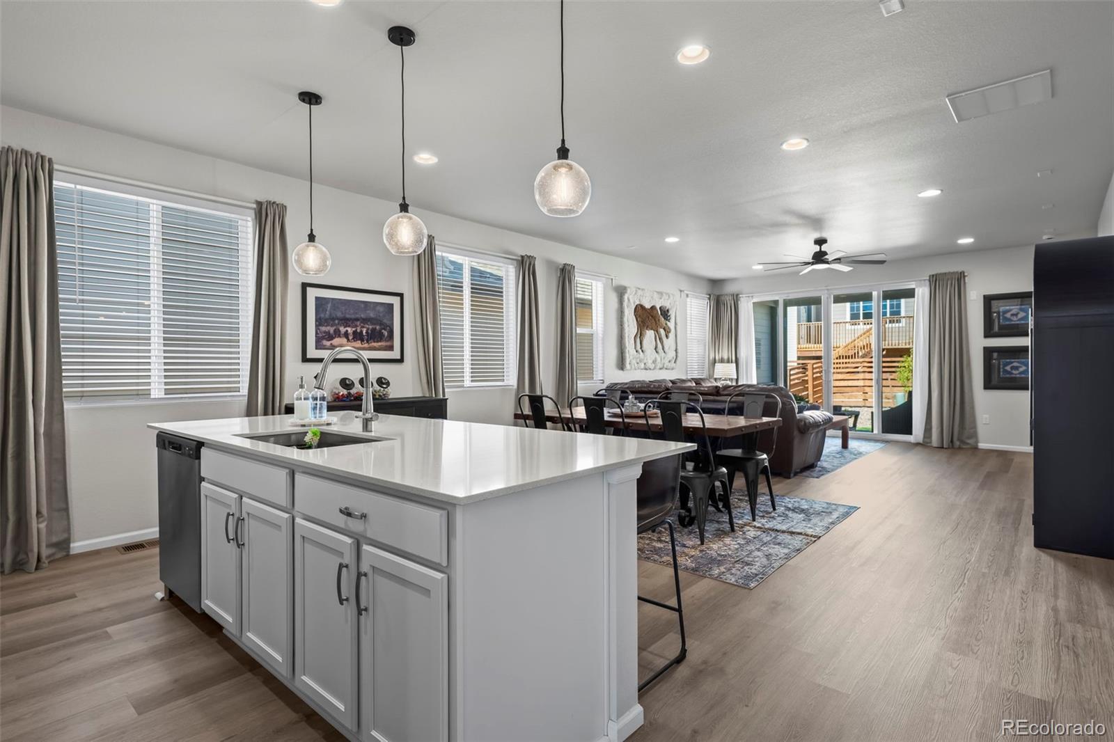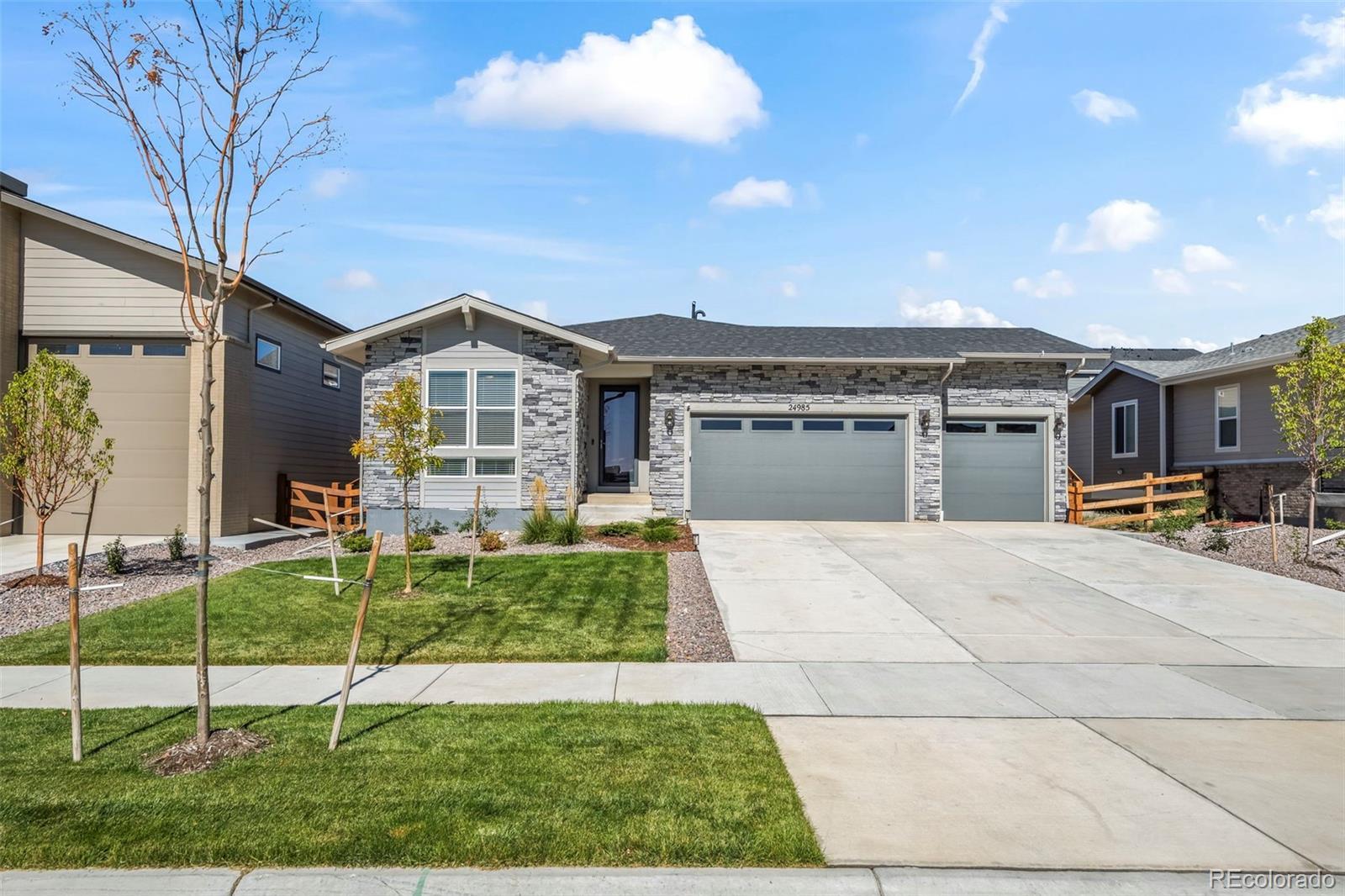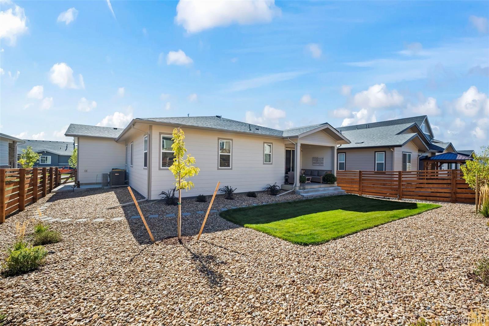Beautiful and open ranch-style home has designer finishes throughout and already professionally landscaped and fenced! The Aurora Highlands community features lots of parks, trails, school, green space and is very accessible to E470 and I-70. The floor plan features an entry with luxury vinyl plank flooring that leads to a study and laundry room. The kitchen has a quartz island with pendant lights, stainless steel appliances, a pantry, and flows into the dining room and great room. The adjacent bright great room welcomes you to relax and gives access to the covered patio. Two additional secondary bedrooms and a shared bath make perfect accommodations for family and guests. The primary suite showcases a private bath and a spacious walk-in closet. Step outside to the fully fenced and landscaped backyard, featuring a covered patio and grassy area—ideal for entertaining.