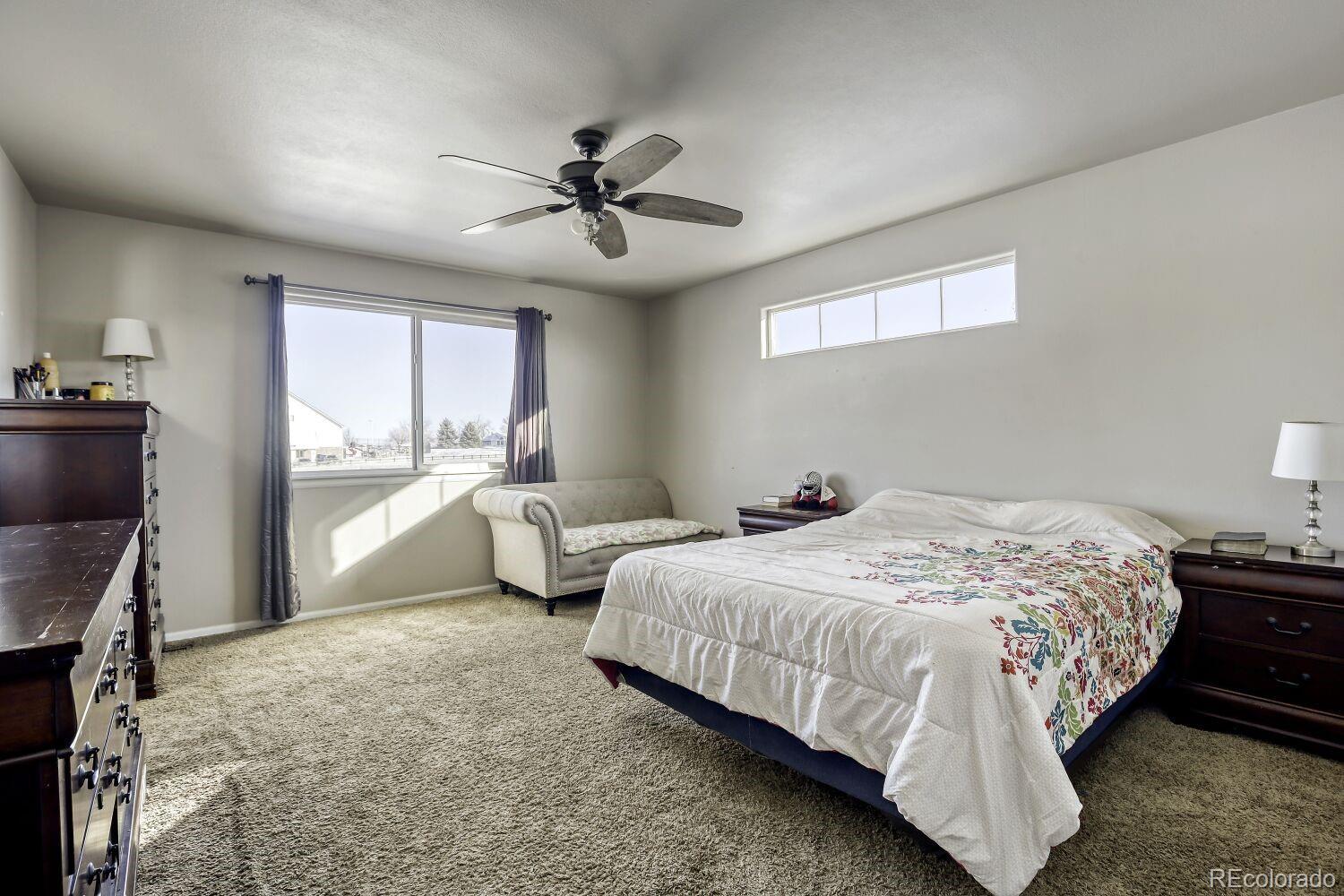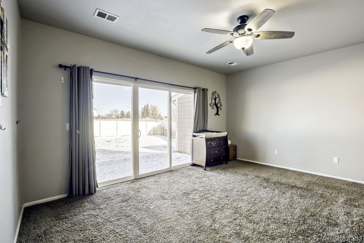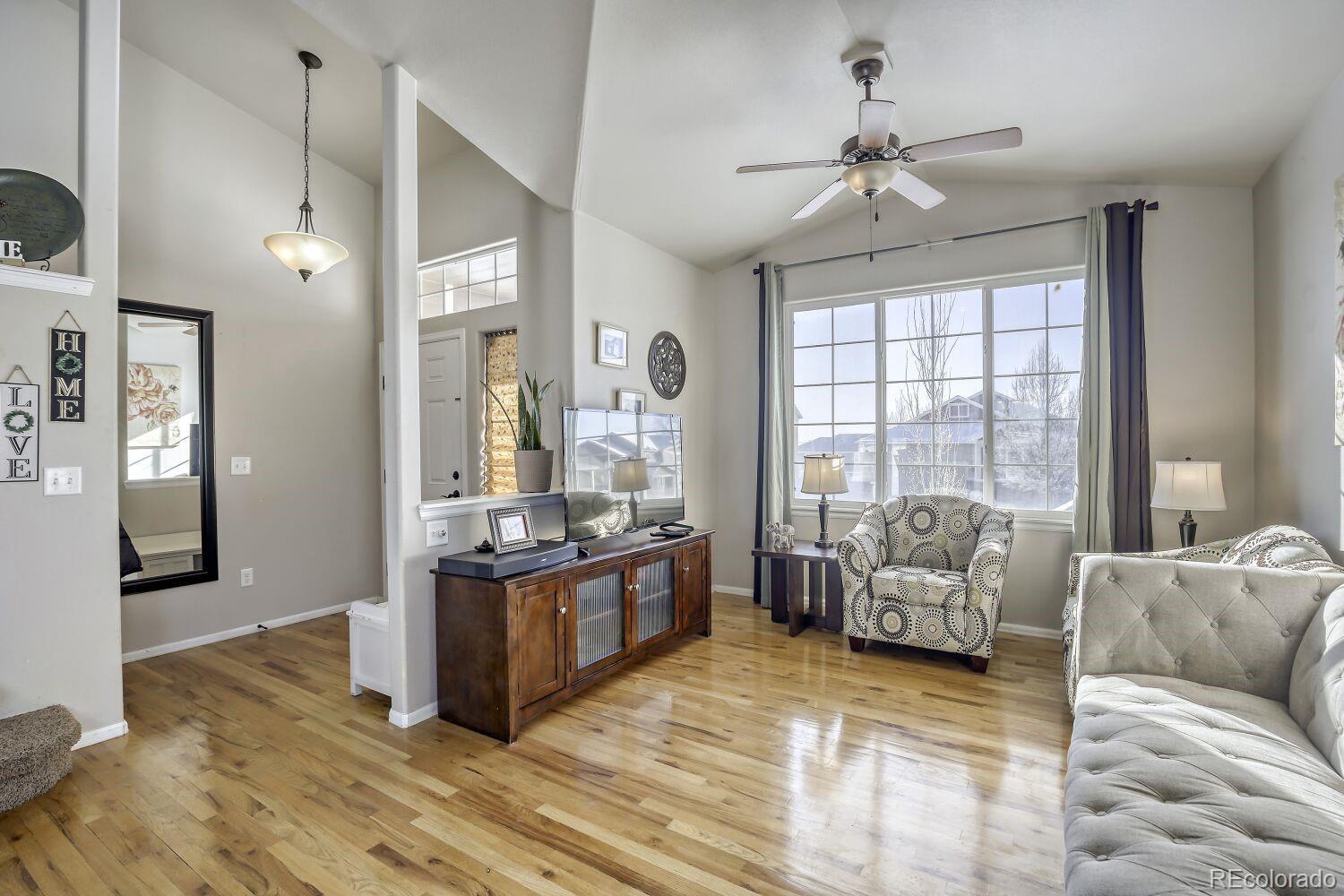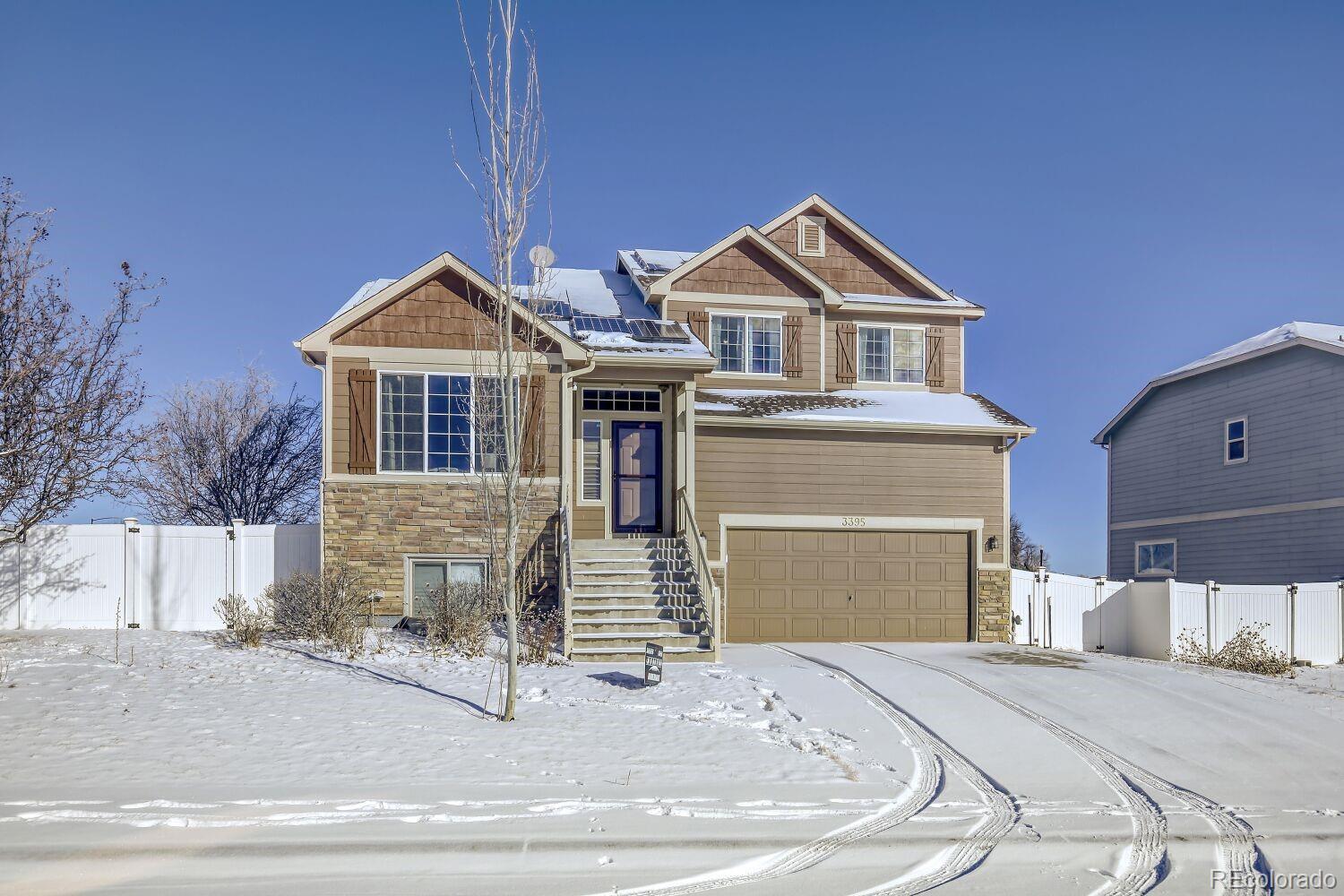 Welcome to this three-bedroom, three-bathroom home located in Clearview! This property is situated on a spacious corner lot, and features solar panels owned by the property, no metro taxes, and a low homeowners' association fee. Upon entering, you will notice the inviting living environment that is move-in ready. Enjoy the stunning mountain views, the open concept floor plan, vaulted ceilings, hardwood floors, and ample amounts of natural light. The large kitchen includes plenty of cabinetry for any storage needs you may have, spacious countertops, a breakfast bar, and a dining area. There are several living spaces, including a sunken family room that's perfect for a media setup. Enjoy the easy access to anywhere, great for hosting gatherings with friends and family. Head upstairs, where you will find the owner's suite. This space features plush carpet flooring, a ceiling fan, plenty of space for many different furniture layouts, a spa-like five-piece master bath, a walk-in closet, and a deep six-foot soaking tub. Two additional bedrooms and a bathroom complete the upper level and offer plenty of space. Outside, you will be greeted by a fully fenced, beautiful backyard, ideal for kids and pets. There is even a three-car tandem garage with plenty of space for your vehicles and gear. Enjoy the prime location offering easy access to just about anywhere, including I-25. Plenty of shopping, dining, and entertainment options are also nearby and include Bella Ridge Golf Club, Buc-ee's, The Promenade Shops at Centerra, Woods Market, and more! Don't miss this great opportunity!