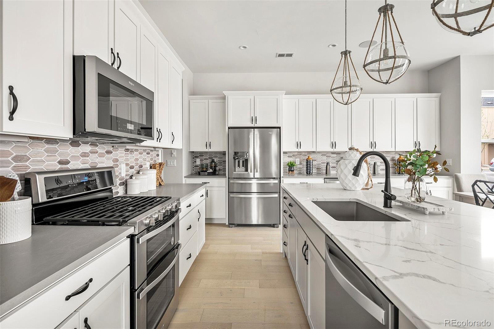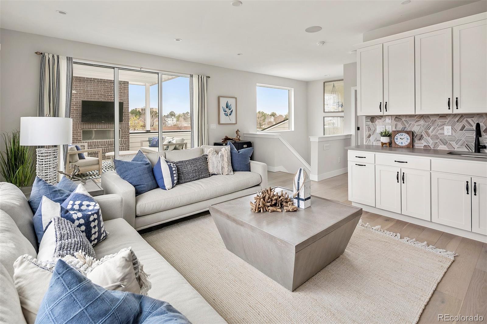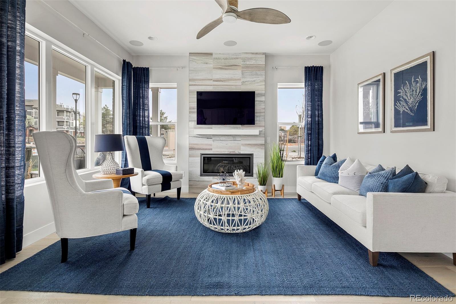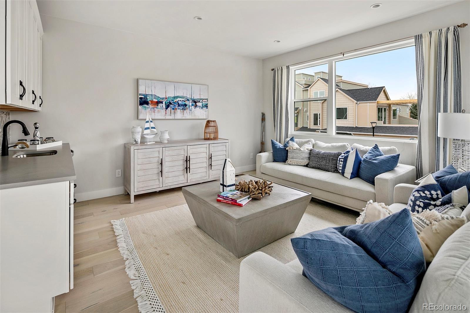 Model home available! Imagine waking up in your sun-filled corner-unit townhome in the serene, gated Prelude at TAVA Waters community. The main floor welcomes you with a wrap-around front porch, perfect for morning coffee or evening relaxation. Step inside and be greeted by an expansive great room, where natural light pours through the large picture window, casting a warm glow over the living area. Cozy up by the gas fireplace or entertain guests in this open, inviting space. The chef’s kitchen is ready for culinary adventures, with a double oven and gas range, stainless steel refrigerator and beverage refrigerator, and plenty of cabinet space. Just off the kitchen, the dining room, surrounded by windows, is perfect for family dinners or hosting friends. The main floor also features a powder bath and a coat closet near the entry. Your private retreat awaits in the main-floor primary suite—roomy enough for a king-sized bed and extra furniture. The suite offers a walk-in closet plus an additional closet for all your needs. Enjoy a luxurious 4-piece bath, complete with a bench in the shower, double sinks, and an enclosed water closet. The laundry room, mud space, and 2-car garage complete this level. Upstairs, a bright loft with a wet bar offers endless possibilities—a cozy TV room, productive office, or kids’ play area. Step outside to your expansive deck with an outdoor fireplace and TV hookups. Another half bath and linen closet are nearby. The second primary suite offers a sanctuary with a walk-in closet and en-suite bath featuring double sinks, a bathtub/shower, and a private water closet. Perfect for a multigenerational situation. Prelude is truly an oasis in the city—surrounded by nature, including a private lake, walking paths, and mature trees. The resort-style amenity center boasts an outdoor pool with lake views, hot tub, and a state-of-the-art gym. You’ll feel a world away while being just minutes from Lowry, Cherry Creek, downtown Denver, and more.
