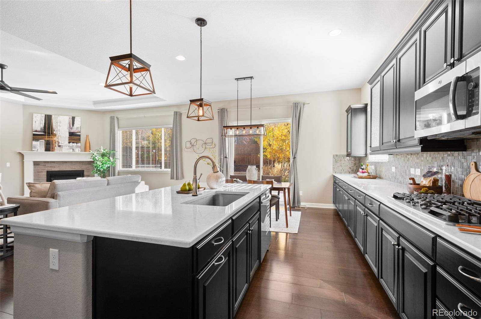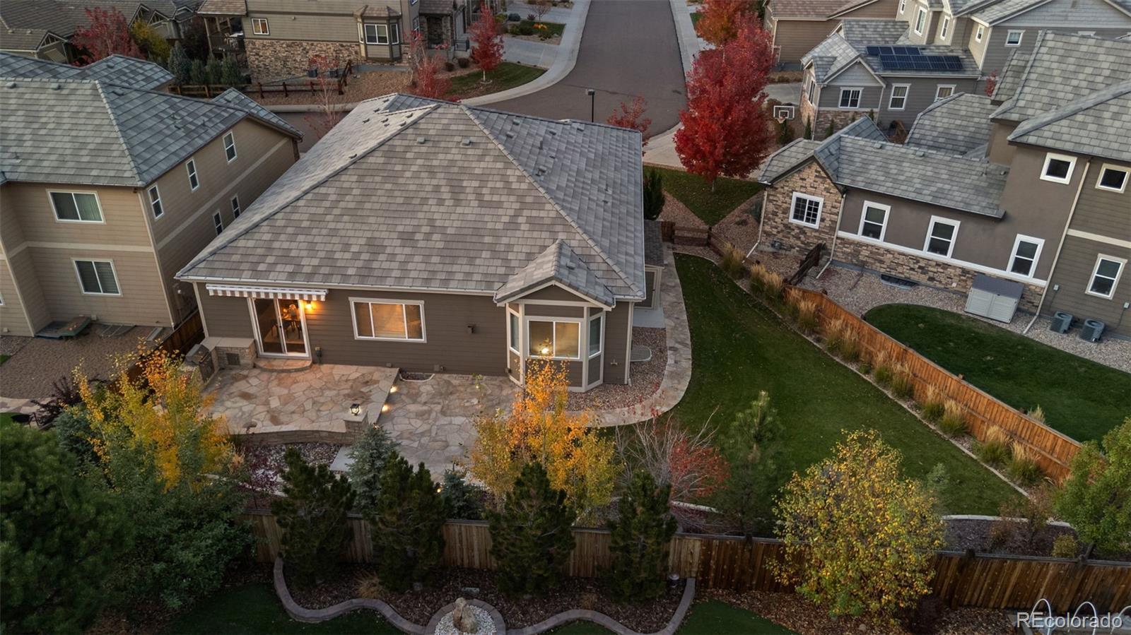 Nestled in the desirable Meridian Village community, this beautifully appointed ranch-style home offers 4 bedrooms, 3 baths, and over 4,000 square feet of finished living space. Crafted with attention to detail, you’ll find elevated features throughout—10’ ceilings, 8’ doors, hardwood flooring, crown molding, and expansive windows that invite the outdoors in. The main level is designed for both daily living and entertaining, anchored by a spacious living room with a gas fireplace and open flow into the well-appointed kitchen—complete with quartz countertops, stainless steel appliances, double ovens, espresso cabinetry, a walk-in pantry, and a convenient office nook. The primary suite is a true retreat, highlighted by a bay window overlooking the serene backyard, a luxurious 5-piece bath, and a fully built-out walk-in closet. A dedicated home office with custom built-ins, two additional main-level bedrooms, and a finished basement with 9’ ceilings, recreation space, kitchenette, guest suite, and secondary laundry —ideal for entertaining, guests or multi-generational living. Step outside to a backyard designed to impress—from the flagstone patio to the outdoor kitchen, this professionally designed backyard oasis is perfect for evenings under the stars or a peaceful morning coffee. The 3-car split garage with 13’ ceilings provides exceptional storage and lift potential. Located just minutes from Parker’s Main Street, Park Meadows Mall, the Denver Tech Center, and major commuter routes, this home blends luxury, convenience, and Colorado lifestyle in one perfect package. Beyond the home, Meridian Village offers scenic walking trails, a resort-style pool, playgrounds, and a welcoming neighborhood atmosphere. Residents enjoy the best of Parker living—boutique shopping, dining, and community events—along with easy access to the mountains, downtown Denver, and Denver International Airport.