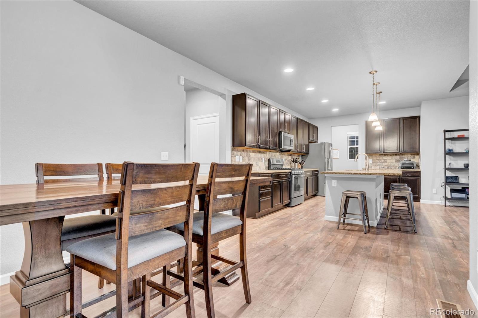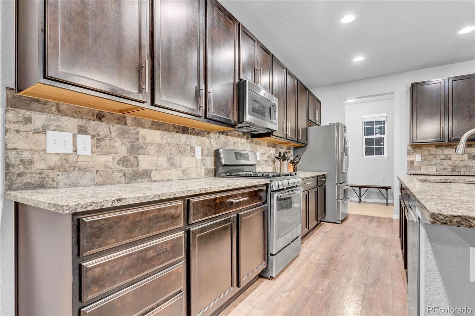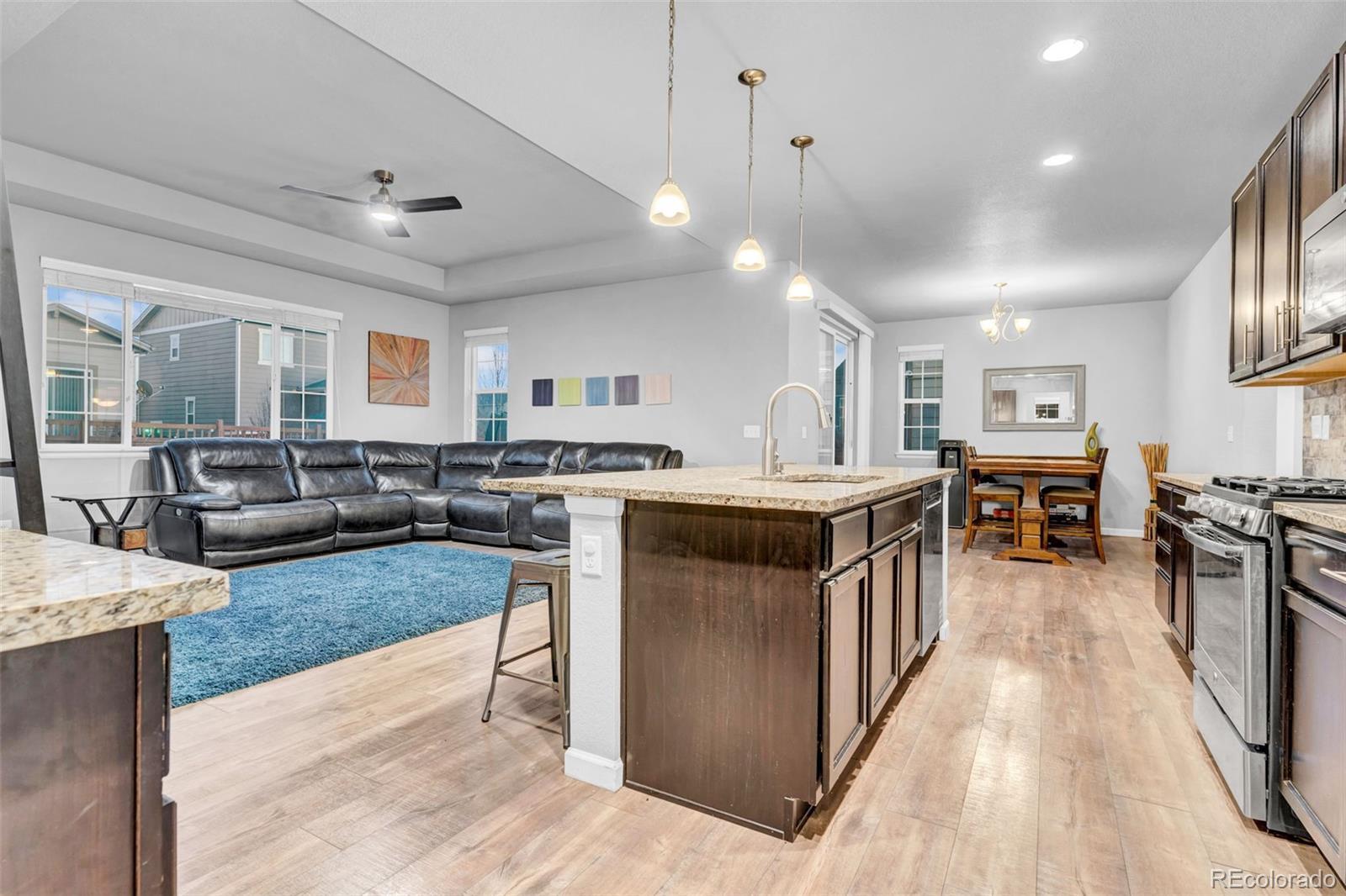 Welcome to this beautifully appointed residence in the highly sought-after Highpoint neighborhood, ideally located across from the Gaylord Rockies Resort and just minutes from Denver International Airport and the A-Line train, offering effortless access to downtown Denver and surrounding areas. This open and bright home has been exceptionally well maintained and showcases upgrades throughout with a thoughtfully designed layout that blends sophistication and comfort. The gourmet kitchen serves as the heart of the home, featuring upgraded finishes, generous counter space, and an inviting flow that is perfect for both everyday living and entertaining. All appliances are included, providing true move-in-ready convenience. The main level offers a private first-floor study, ideal for a home office, library, or flexible workspace. Natural light fills the home, enhancing the elegant details and quality craftsmanship found throughout. The finished basement adds valuable additional living space, ideal for a media room, fitness area, or guest retreat. Outdoors, the oversized backyard offers ample room to relax, entertain, or create your own private oasis. Located near restaurants, shopping, parks, schools, walking trails, and community amenities, this home delivers an exceptional combination of luxury, lifestyle, and convenience. A truly outstanding opportunity in one of Aurora’s most desirable communities — this home is a must see. Solar panels convey with the home; buyers to assume the existing lease. This home is thoughtfully priced to sell in today's market.
