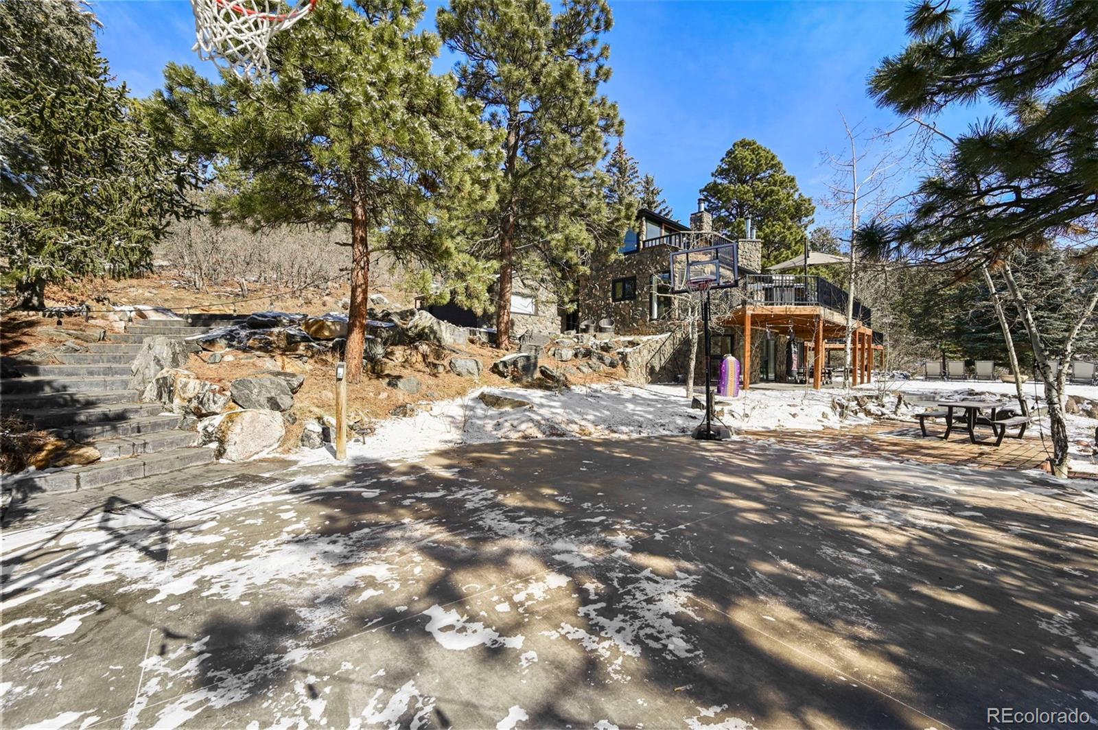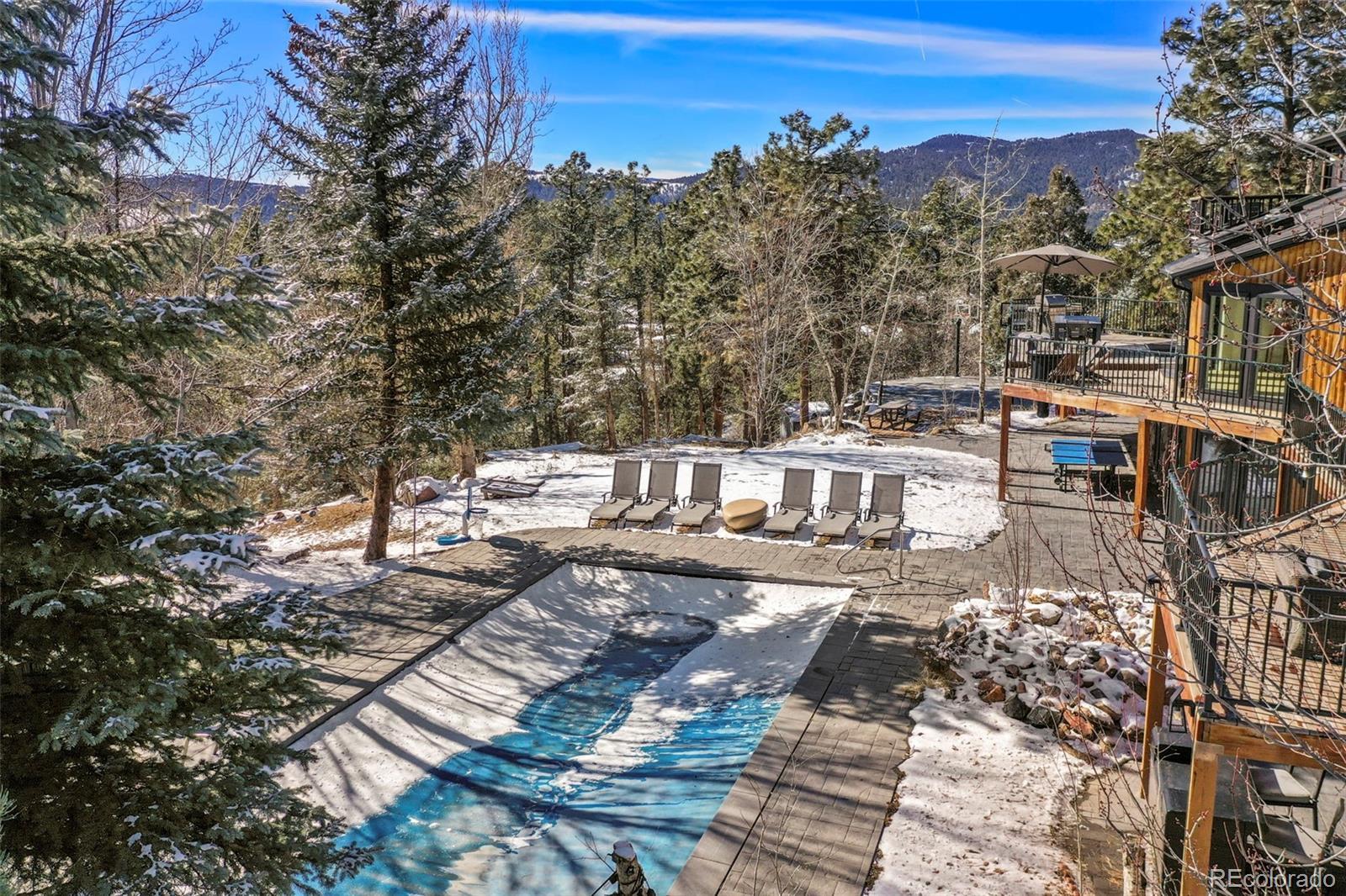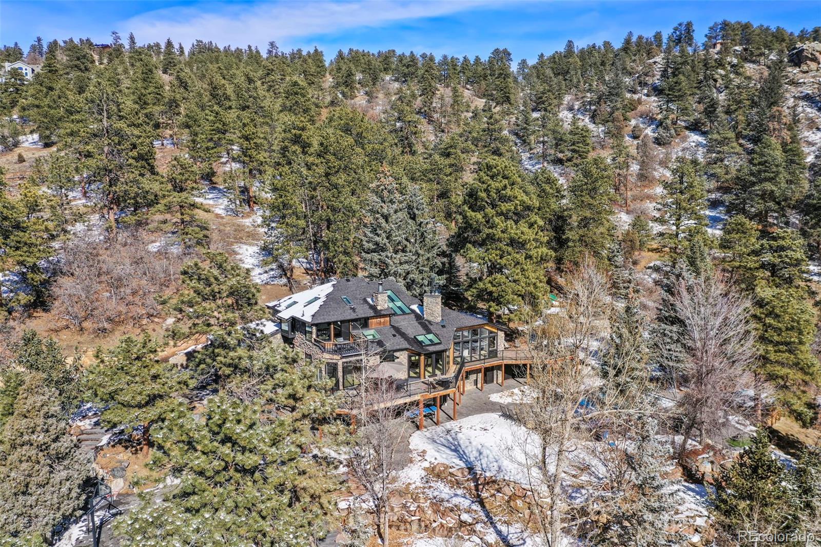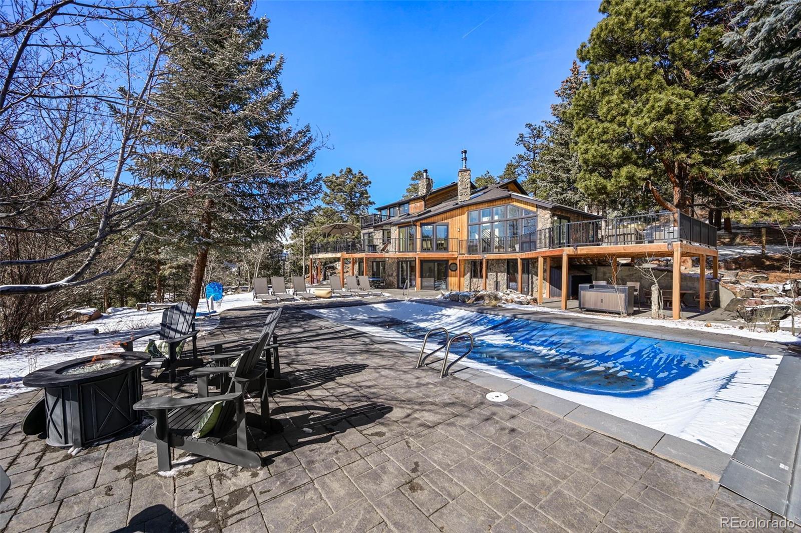 Nestled amidst the serene landscapes of Indian Hills, Colorado, this luxurious 5-bedroom, 4-bathroom estate offers an unparalleled blend of elegance and natural beauty. Spanning 4,322 square feet, this mountain contemporary home is situated on a sprawling 10-acre lot, providing both privacy and breathtaking mountain views. This home has been updated with new flooring, new Anderson windows, new skylights, new roof, new gutters, new pool cover & equipment, new tigerwood decking, and extensive new exterior concrete. Spacious Living Areas: The open floor plan boasts vaulted ceilings, a gourmet kitchen with granite countertops, and multiple fireplaces, including in the family room, great room, and master bedroom. Outdoor Oasis: Enjoy the expansive wrap-around deck, perfect for entertaining or soaking in the tranquil surroundings. The property also features an outdoor pool and private spa/hot tub for ultimate relaxation. There is even a sports court for you to practice your hoops. Modern Amenities: Equipped with central air conditioning, forced air heating powered by propane - ensuring comfort and peace of mind year-round. The kitchen has been updated with commercial appliances and two dishwashers. Prime Location: This estate offers easy access to nearby amenities while providing a secluded retreat. The property is bordered by Mount Falcon Park, enhancing its exclusivity and natural charm. Priced to sell, this exceptional property embodies luxury mountain living. Don't miss the opportunity to own this exquisite retreat in Indian Hills, Colorado. Here is where you can find a video of this stunning home: https://www.youtube.com/watch?v=RXYucIOxpSY