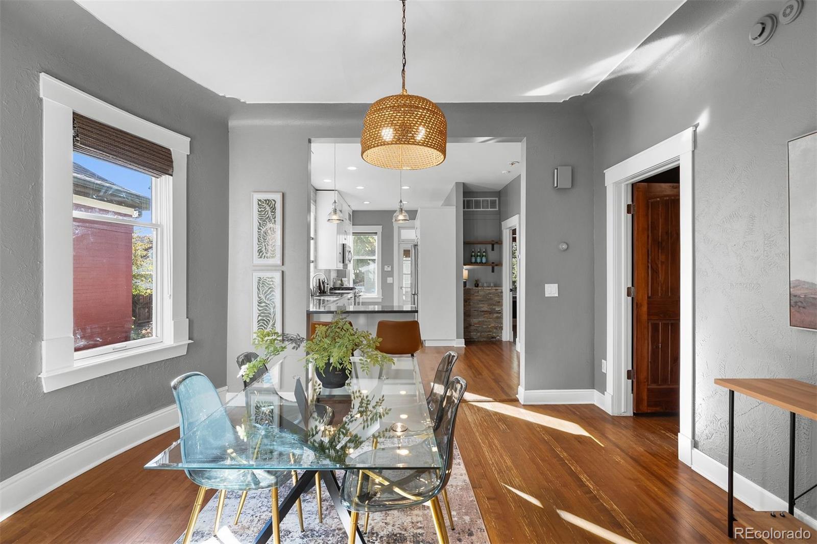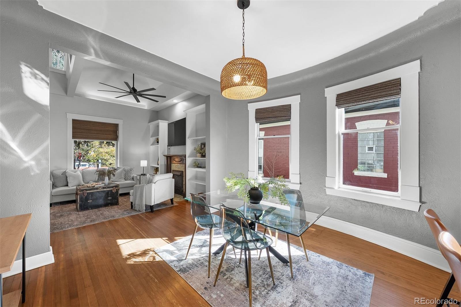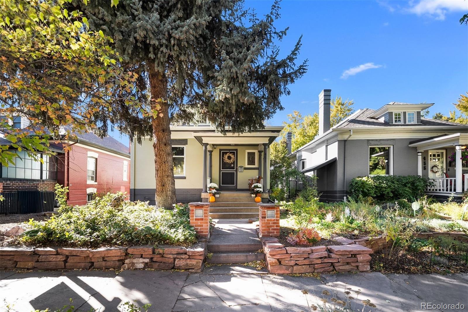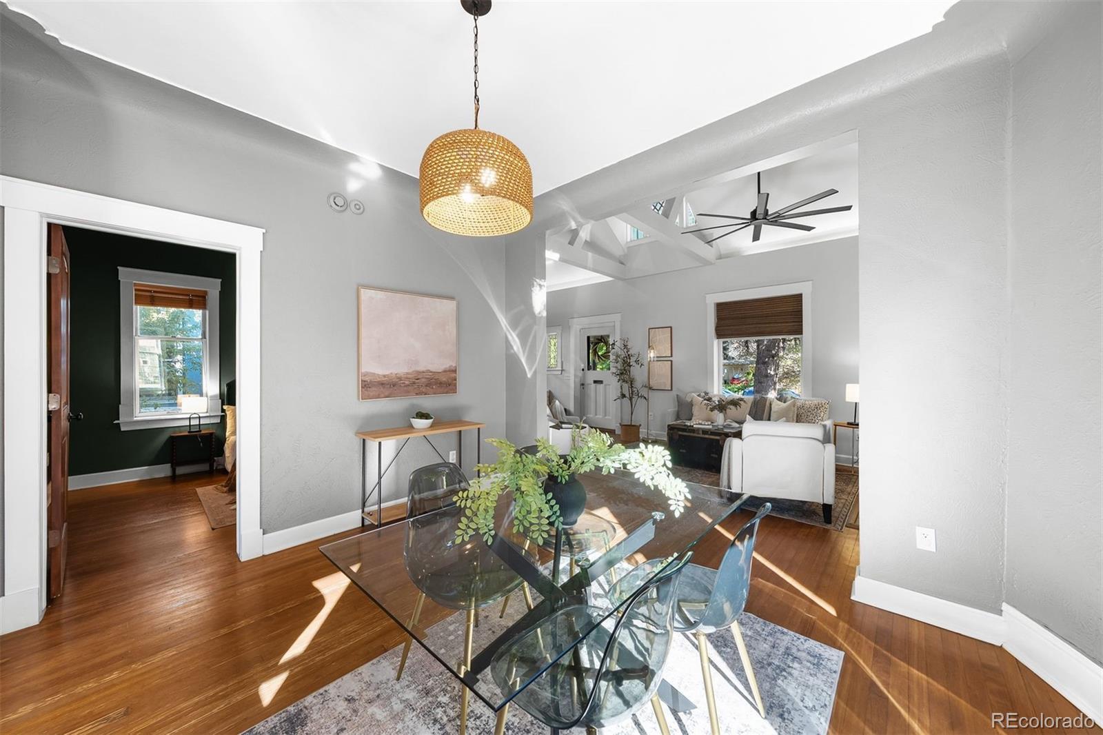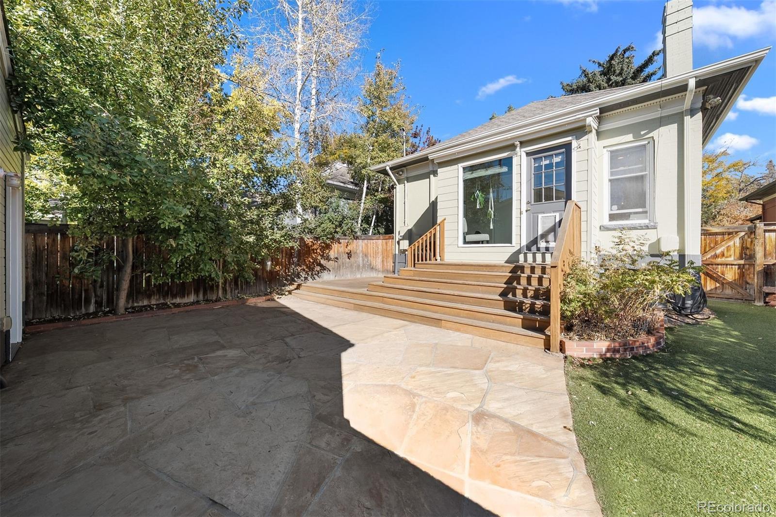 Charming home in the heart of Alamo Placita! Vaulted ceilings welcome you into a light-filled home filled with character. Upon entry, you will find the living room which boasts dramatic vaulted ceilings with exposed structural beams, creating an airy and expansive feel.Custom built-in shelving flanks the elegant fireplace, offering a perfect showcase for decor and media. Rich hardwood floors and warm tones complete this sophisticated gathering space. The dining area is full of natural light boasted from two large windows. The well-appointed kitchen is a modern culinary space that is both stylish and highly functional. The kitchen boasts classic white Shaker-style cabinetry, offering ample storage, and beautifully complemented by expansive dark granite countertops. A distinctive stacked shiplap/stone accent wall surrounding the sink adds a rustic, custom touch. Prepare meals with ease using the stainless steel appliance suite, including a built-in microwave and gas range. There are hardwood floors throughout the main level. On the main level, there are two spacious bedrooms + a full bathroom that has been recently remodeled this year. The finished basement offers two additional bedrooms plus flexible space ideal for a family room, home office, or extra storage. Enjoy fresh exterior paint and a low-maintenance backyard with a flagstone patio, wooden deck, and turf area—perfect for relaxing or entertaining. The West exposure gives it several more more months of evening sun. There is an oversized two-car garage + one additional parking space. It is in a great location, within walking distance to grocery stores (Safeway, Trader Joes), parks (Alamo Placita + Governor's Park), shops, bars/breweries (Don's, Out of the Barrell Taproom) and dining (Angelo's, Fontana, Milo's, and more) and coffee (Pablo's).