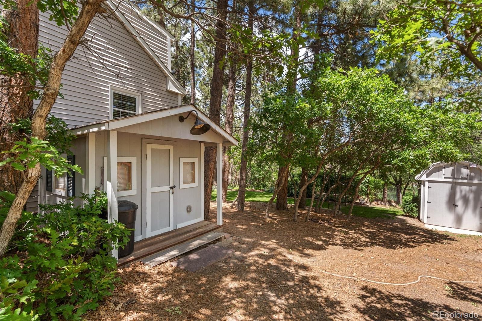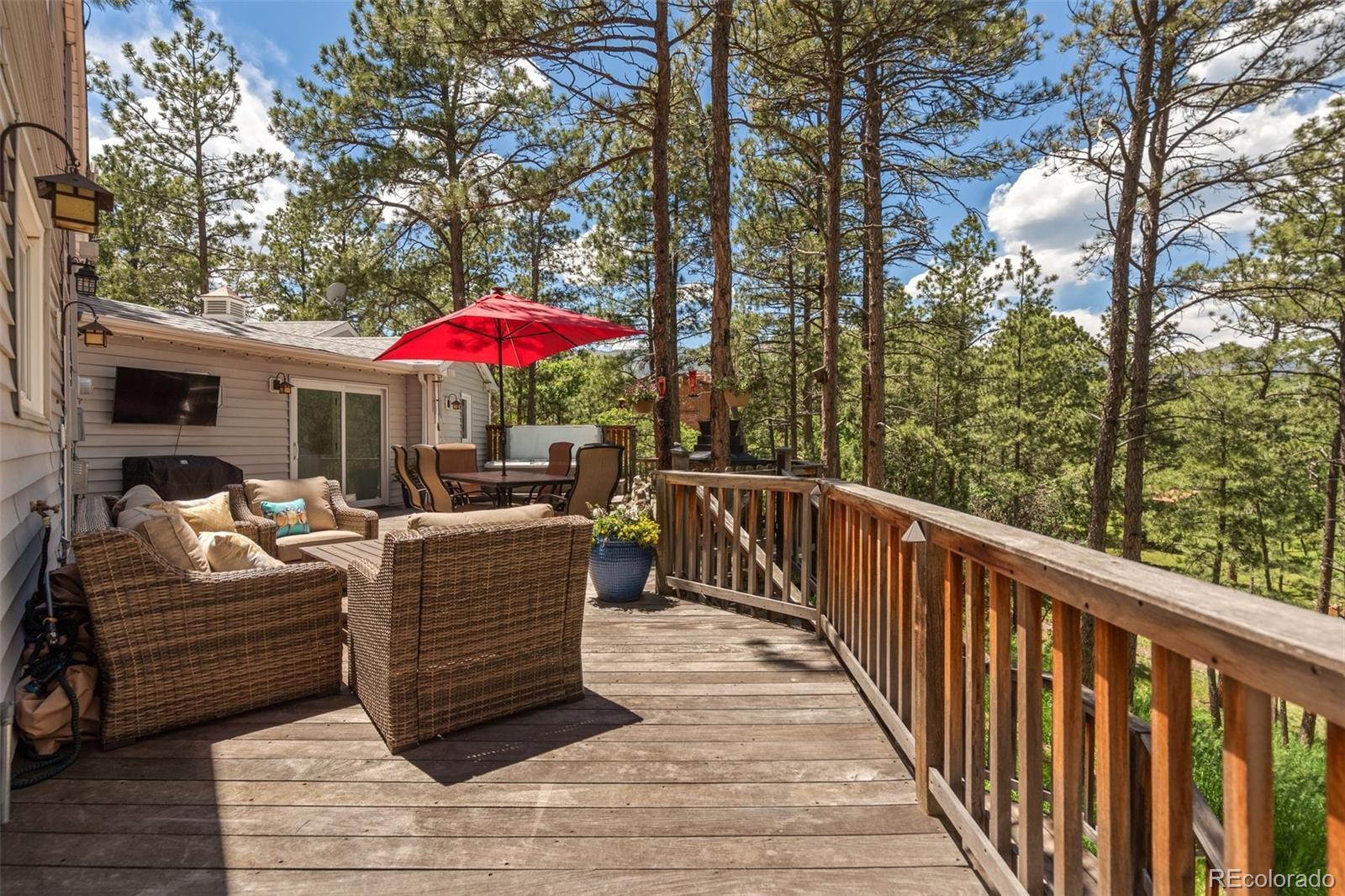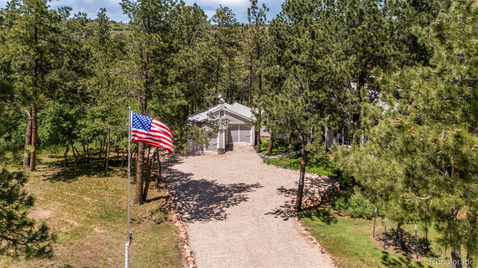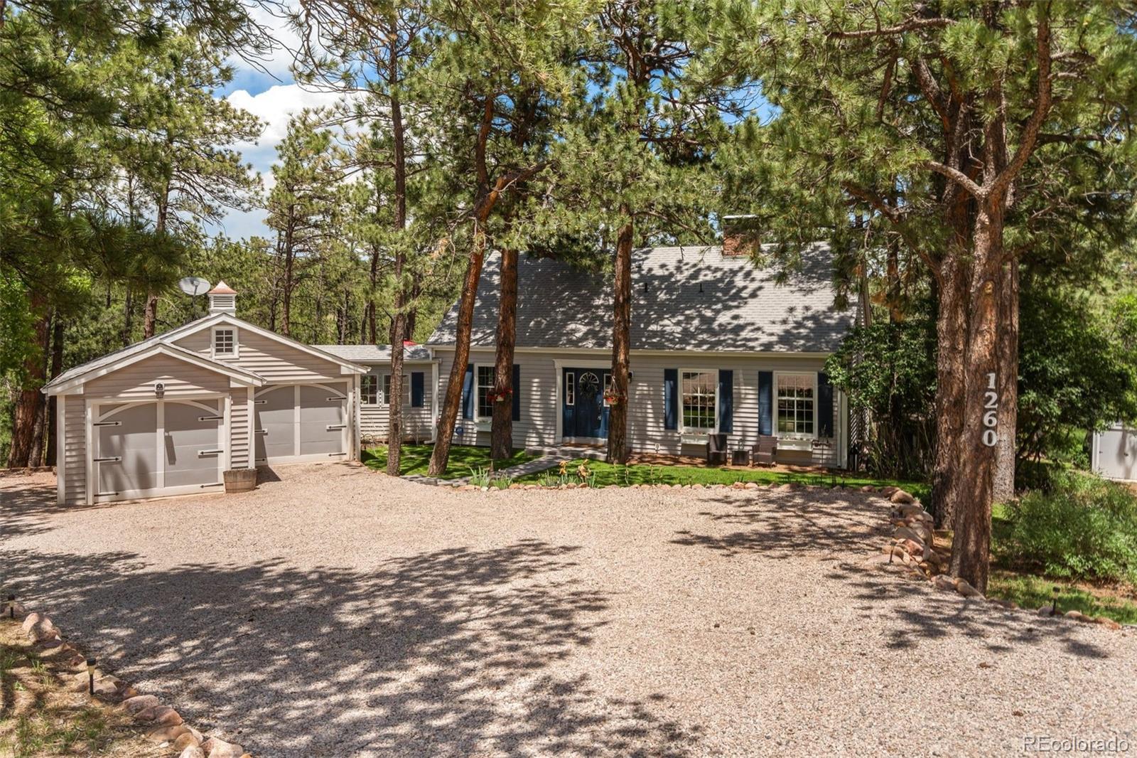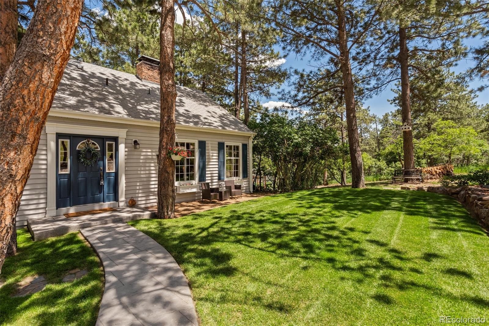 This gorgeous New England cottage-style home is not only beautiful but built on a gorgeous lot and close to I-25 and Woodmen, making access to any part of the city a breeze. This property is super unique being so close to the city and yet a peaceful world away and zoned for horses and no HOA! Woodmen Valley also has dirt roads that are perfect for horseback riding, mountain biking and peaceful walks in the country. This home is on the west side of town and offers easy access to hiking trails and quick access to Highway 24 if you want to get away to the mountains. The home itself is warm and cozy! The kitchen has an eat-in banquette dining table that gives you the impression of eating in a tree house as it is flanked by windows overlooking the sloping meadow and surrounded by majestic pines. The kitchen is directly adjacent to a more formal dining room and both have access to the very large and beautiful Brazilian hardwood deck, complete with luxurious hot tub. This makes an amazing place to entertain family and friends or just relax and enjoy the views of the mountains and the nature that surrounds the whole property. The living room on the main level boasts a wood burning fireplace that is bordered by custom built-in bookcases and topped with a wood mantel and custom wood beams on the ceiling complete the space. There is a bedroom and remodeled full bathroom on the main level and three bedrooms upstairs share a remodeled full bathroom. The walkout basement is the perfect space to gather in front of the second wood burning fireplace. Another bonus room in the basement can become the perfect craft room or office space with more built in bookcases and cabinets. The basement also offers a laundry room and an additional storage space. While outside, enjoy manicured lawns in front and back and easy access to two storage sheds for any tools and toys. This home is the epitome of Colorado country living while maintaining convenient access to the city.