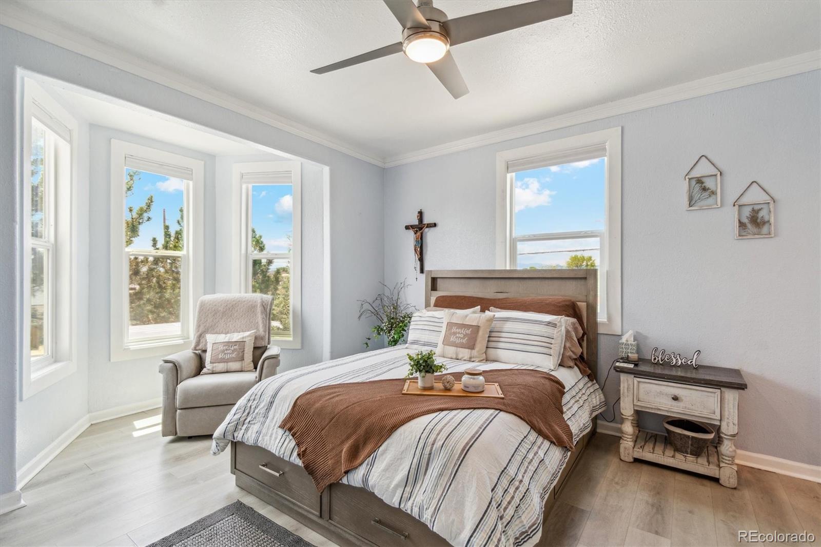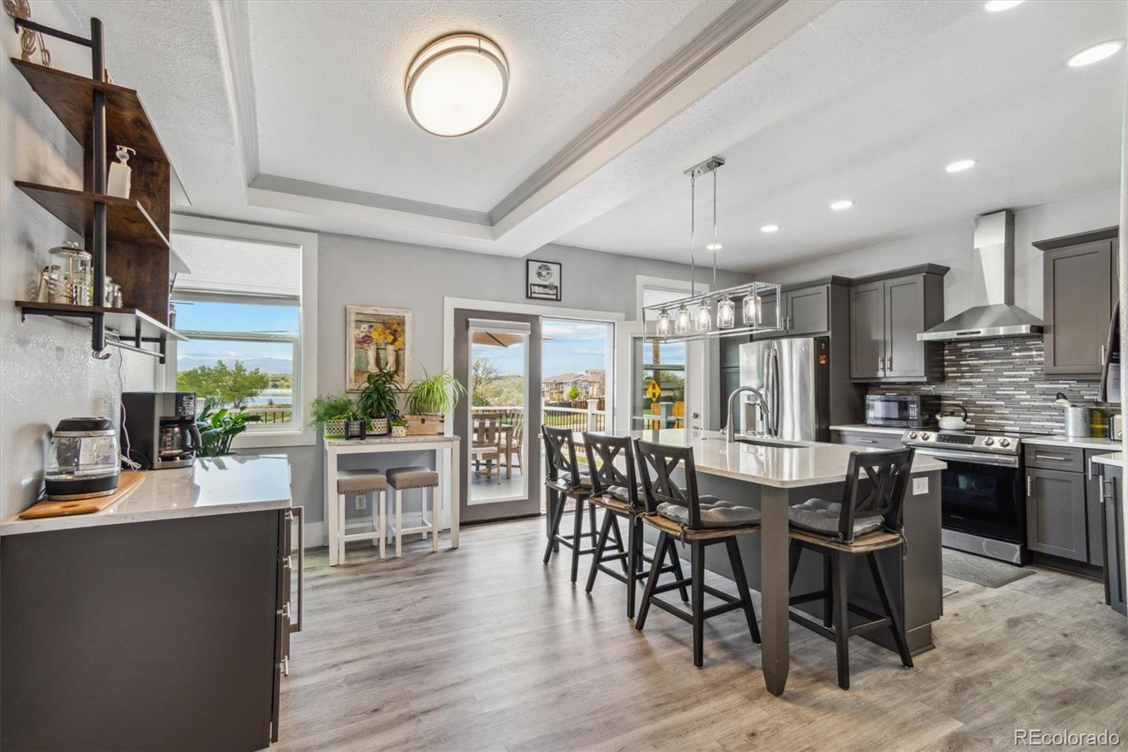 Welcome this beautiful and unique single-family ranch home situated on a corner lot with captivating mountain and lake views and the best part is NO HOA's. The main floor is an open floor plan with custom ceiling finishes in living area, natural lighting, a spacious kitchen with a large quartz island and countertops, tile backsplash and SS appliances, separate dining area, family room, spacious office with it's own entrance from outside and a partial bathroom, the primary bedroom includes a full bathroom, two additional bedrooms (carpeted), and main bathroom. There is vinyl flooring throughout the main level. The oversized main level deck off of the kitchen with trex decking is perfect for entertaining guests, front porch also has new trex decking. Downstairs includes a large primary bedroom with spacious walk-in closet, full bathroom, large family room and laundry area. Professionally landscaped with front and backyard sprinklers, the back yard is perfect for enjoying your morning coffee and the enclosed yard is great for pets with all around privacy fencing and covered patio with new concrete, a shed for storage. This home has been fully remodeled with finishes including flooring, lighting, blinds, hardware fixtures, new windows, brand new garage door, new cement in driveway and garage that is fully finished, new custom roll gate for privacy. The driveway area can fit up to six cars with additional RV parking with hook-up. This home is close to everything including highways, walking trails, schools, restaurants, dog park, community garden. Minutes to downtown, light rail plus much more!