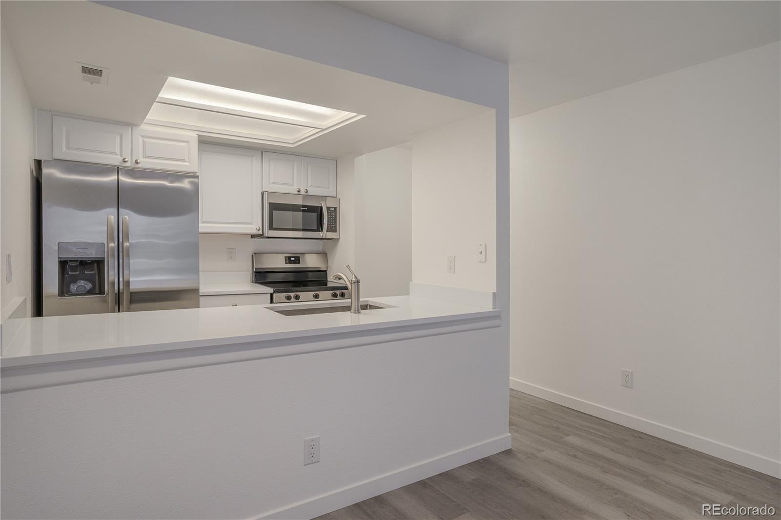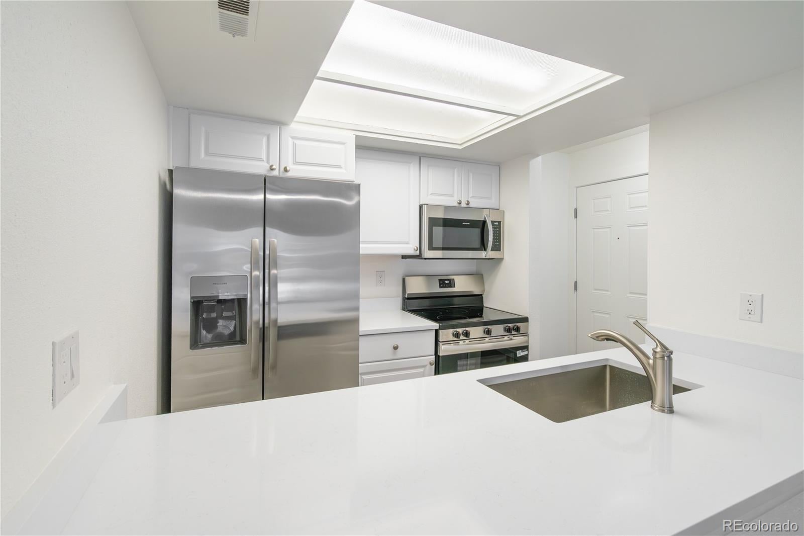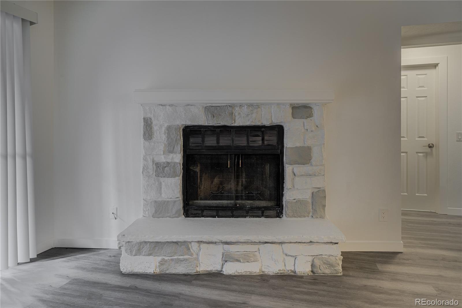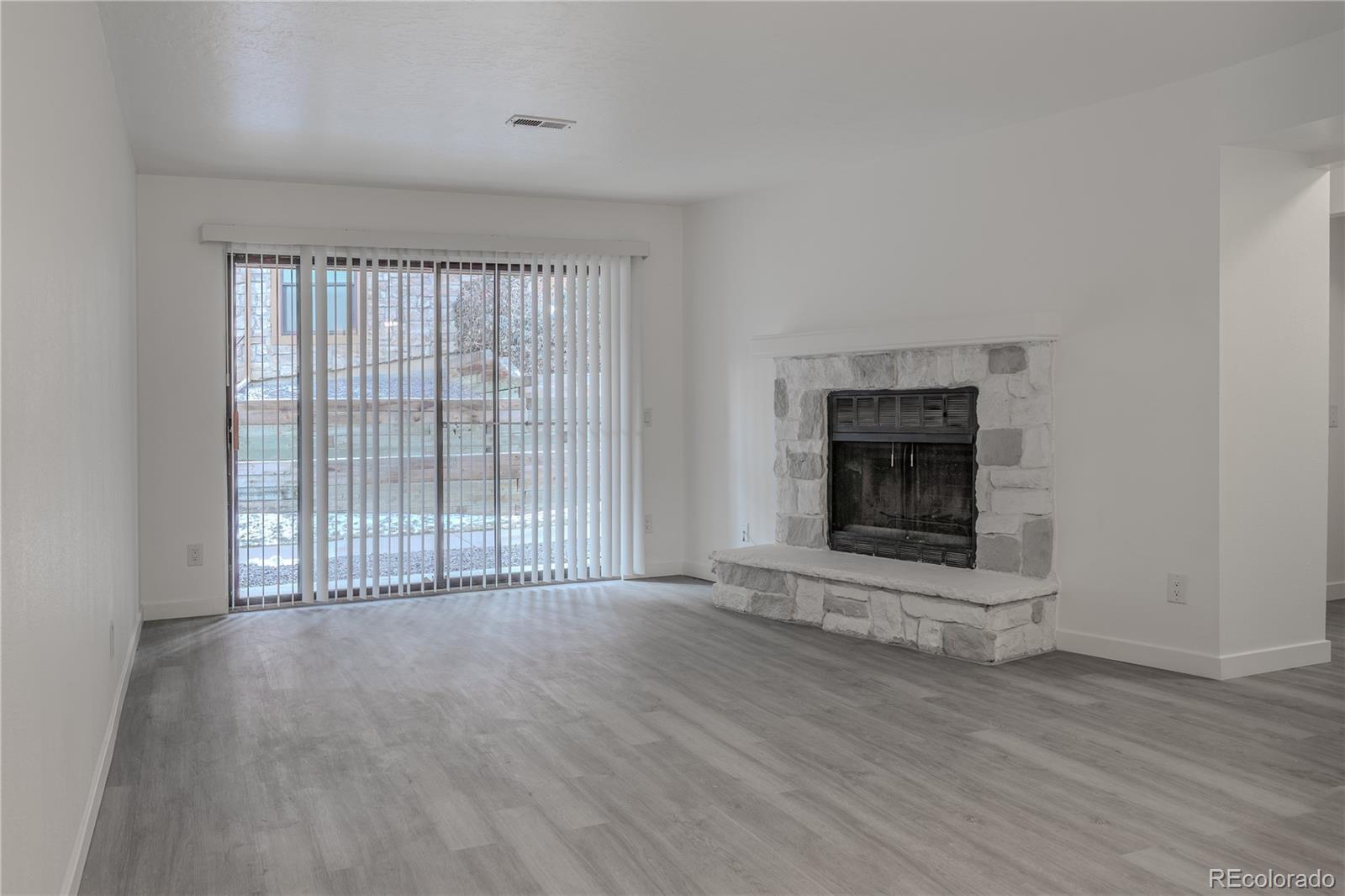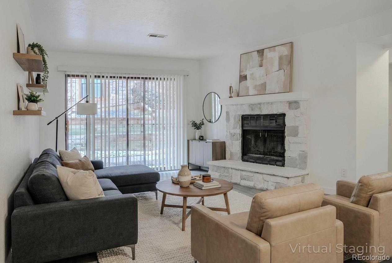 Move-in ready and fully updated, this light-filled 2-bedroom, 1-bath condo with an additional second sink and vanity is located in the Chaparral Condo community and offers both comfort and style. The open layout features vaulted ceilings and brand-new luxury vinyl plank flooring throughout, creating a bright and welcoming feel from the moment you enter. The updated kitchen offers granite countertops, stainless steel appliances, including side by side refrigerator with in the door ice/water dispenser. New tile backsplash, and refreshed cabinetry, providing a modern and functional space for everyday living. Overlooking the living space for form and functionality. The living room is anchored by a cozy wood-burning fireplace with a wood newly painted mantel, perfect for relaxing evenings or entertaining guests. Large patio door opens to your own patio space for grilling or morning coffee. Both bedrooms are generously sized with ample walk in closet space. The full bathroom has been updated with a modern vanity, updated fixtures, and tile accents, while the second sink and vanity add extra convenience and flexibility to the primary bedroom which has direct access to the full bath. An in-unit stackable washer and dryer is included for convenience. Your large storage closet directly across the hall for bikes, costco storing of items, you name it. Conveniently located within the highly regarded Cherry Creek School District, this home offers easy access to shopping, dining, and major roadways. Schedule your showing today and take advantage of this updated, well-priced opportunity.