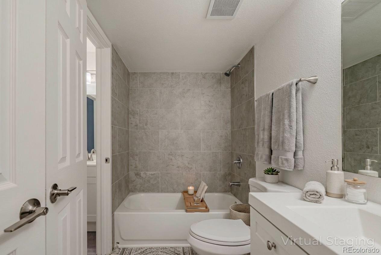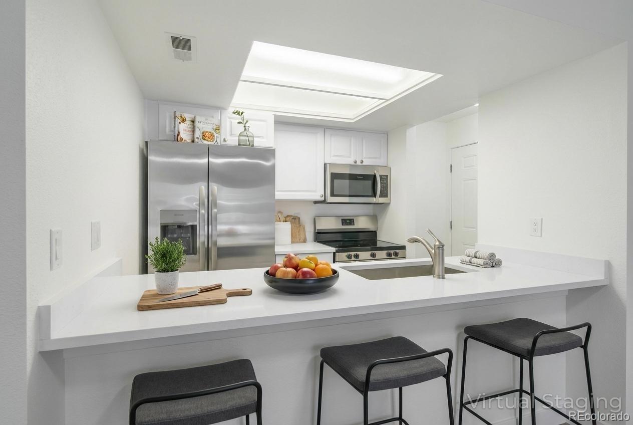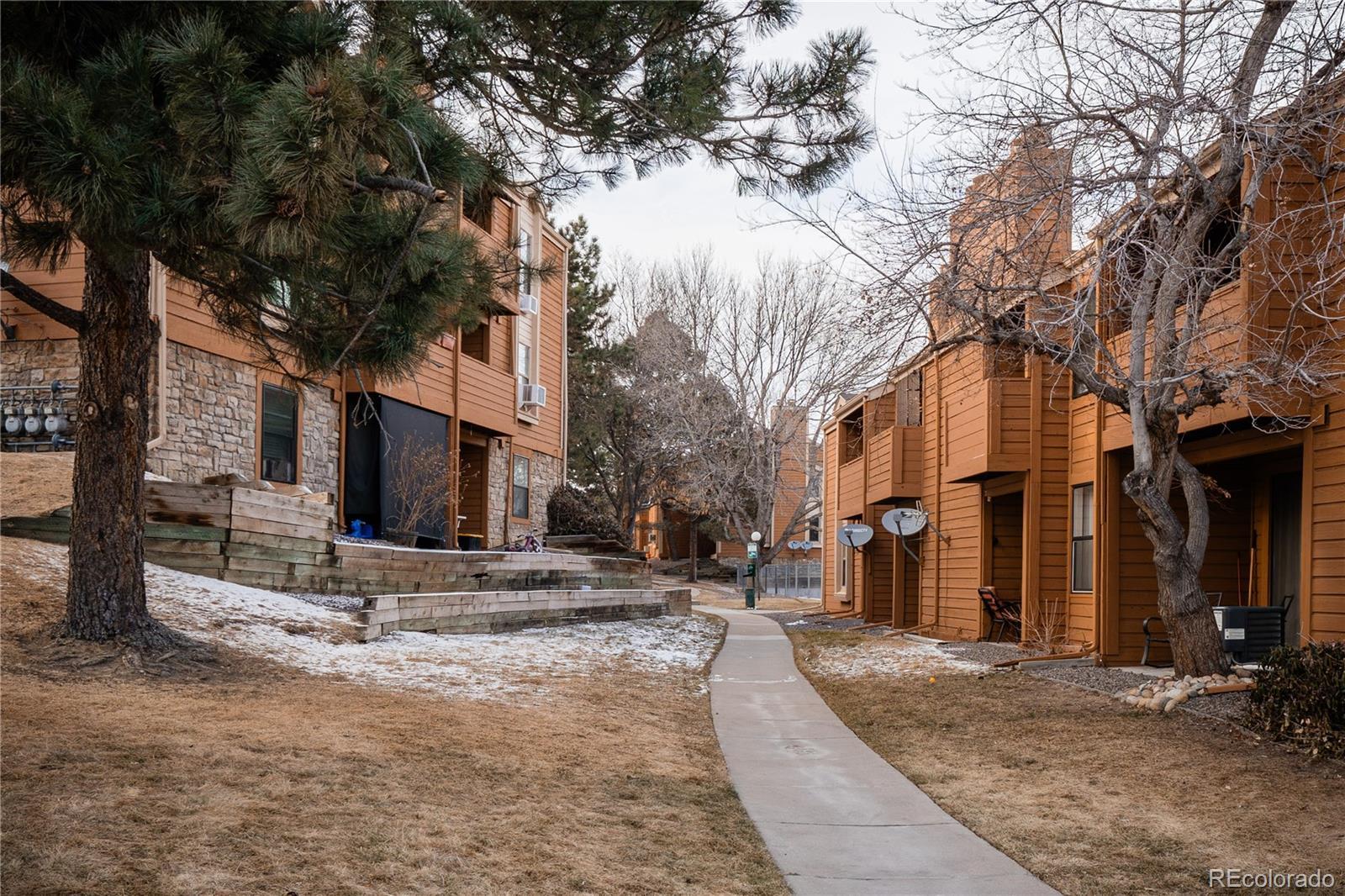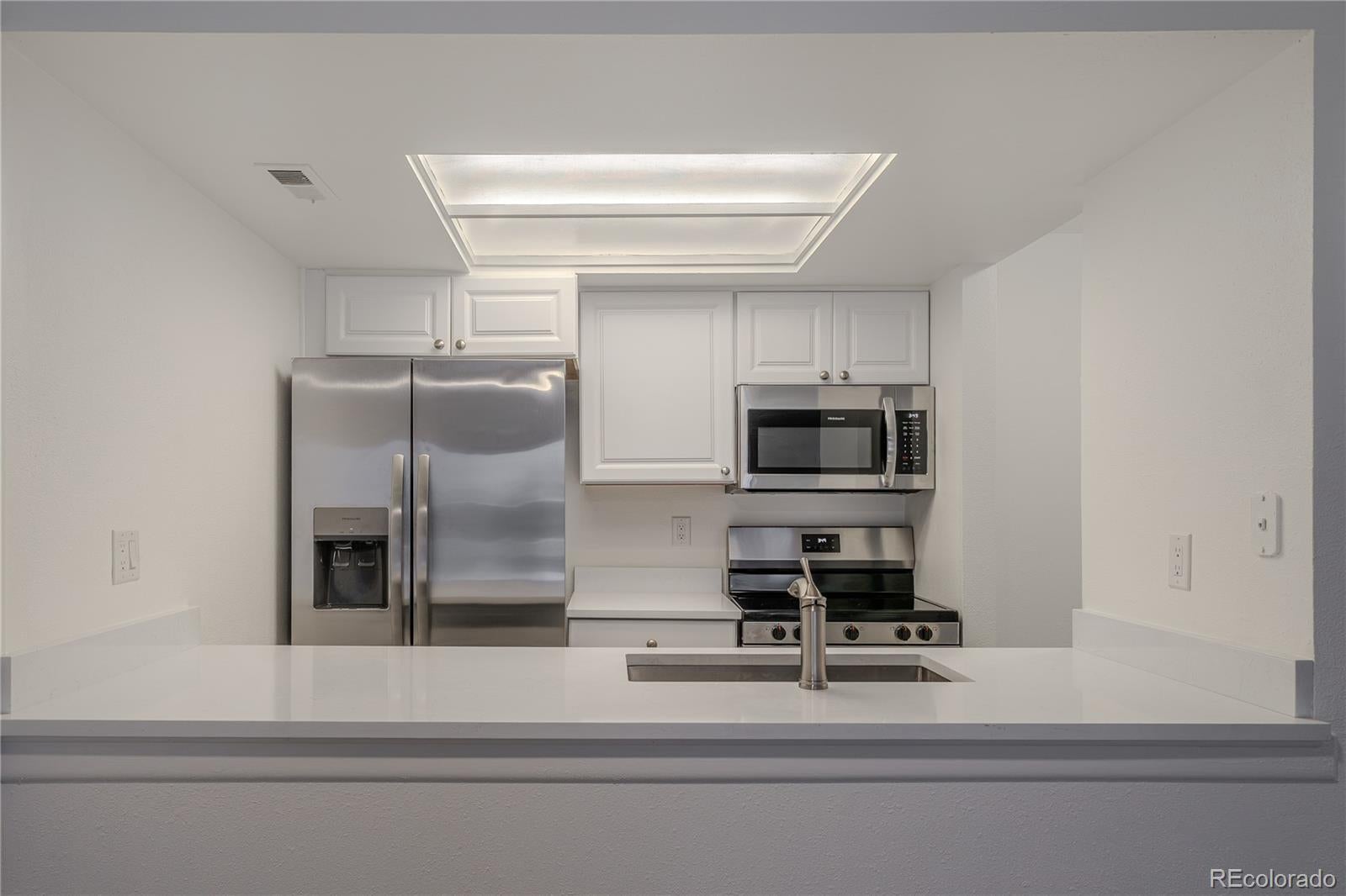 Move-in ready and fully updated, this light-filled 2-bedroom, 1-bath condo with an additional second sink and vanity is located in the Chaparral Condo community and offers both comfort and style. The open layout features vaulted ceilings and brand-new luxury vinyl plank flooring throughout, creating a bright and welcoming feel from the moment you enter. The updated kitchen offers granite countertops, stainless steel appliances, including side by side refrigerator with in the door ice/water dispenser. New tile backsplash, and refreshed cabinetry, providing a modern and functional space for everyday living. Overlooking the living space for form and functionality. The living room is anchored by a cozy wood-burning fireplace with a wood newly painted mantel, perfect for relaxing evenings or entertaining guests. Large patio door opens to your own patio space for grilling or morning coffee. Both bedrooms are generously sized with ample walk in closet space. The full bathroom has been updated with a modern vanity, updated fixtures, and tile accents, while the second sink and vanity add extra convenience and flexibility to the primary bedroom which has direct access to the full bath. An in-unit stackable washer and dryer is included for convenience. Your large storage closet directly across the hall for bikes, costco storing of items, you name it. Conveniently located within the highly regarded Cherry Creek School District, this home offers easy access to shopping, dining, and major roadways. Schedule your showing today and take advantage of this updated, well-priced opportunity.