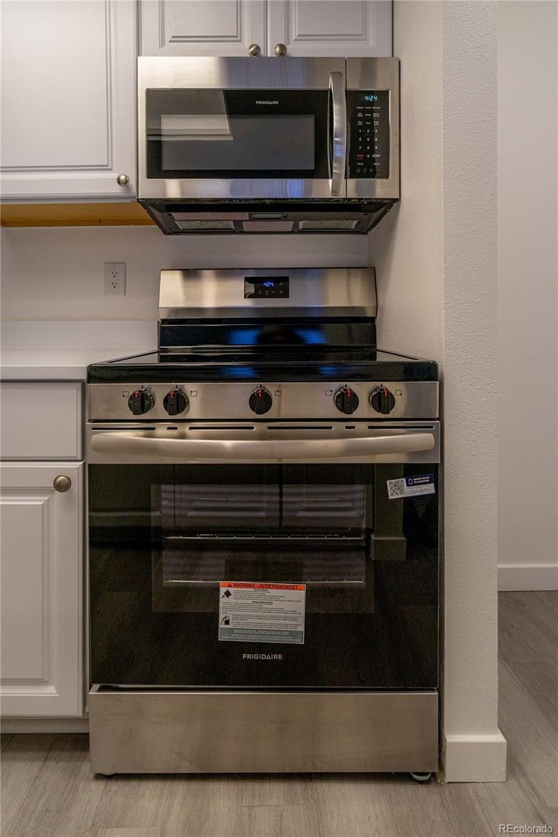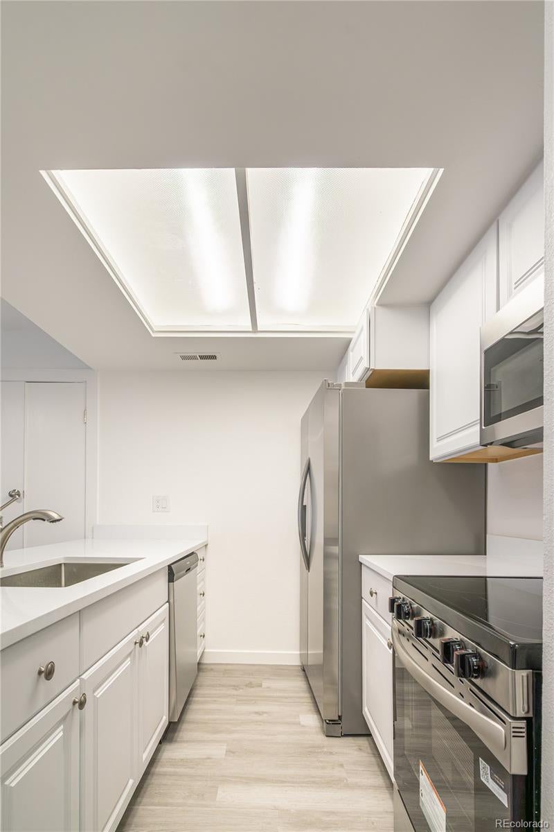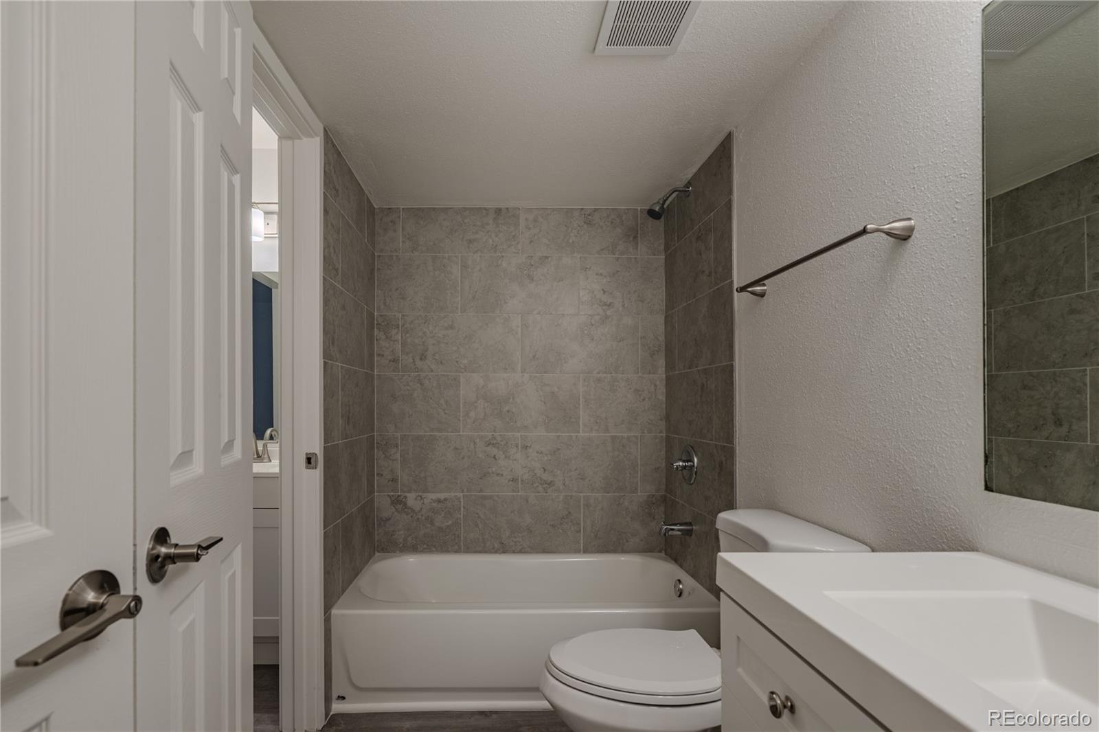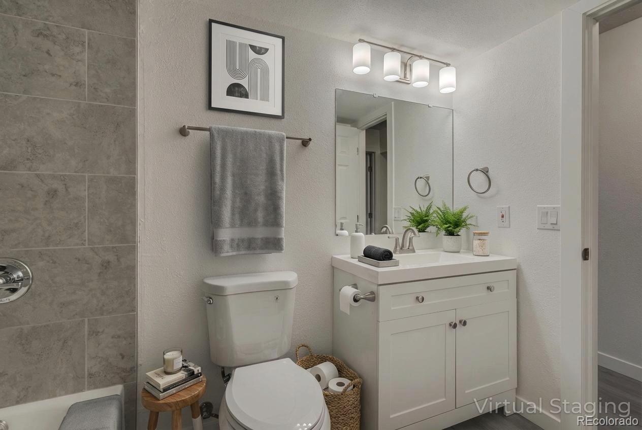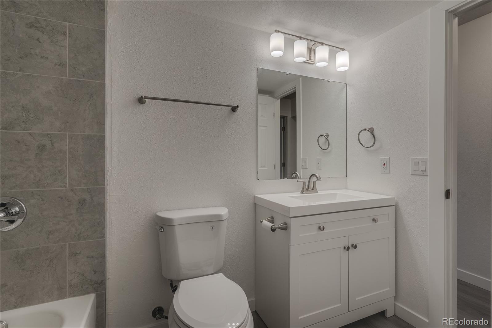 Move-in ready and fully updated, this light-filled 2-bedroom, 1-bath condo with an additional second sink and vanity is located in the Chaparral Condo community and offers both comfort and style. The open layout features vaulted ceilings and brand-new luxury vinyl plank flooring throughout, creating a bright and welcoming feel from the moment you enter. The updated kitchen offers granite countertops, stainless steel appliances, including side by side refrigerator with in the door ice/water dispenser. New tile backsplash, and refreshed cabinetry, providing a modern and functional space for everyday living. Overlooking the living space for form and functionality. The living room is anchored by a cozy wood-burning fireplace with a wood newly painted mantel, perfect for relaxing evenings or entertaining guests. Large patio door opens to your own patio space for grilling or morning coffee. Both bedrooms are generously sized with ample walk in closet space. The full bathroom has been updated with a modern vanity, updated fixtures, and tile accents, while the second sink and vanity add extra convenience and flexibility to the primary bedroom which has direct access to the full bath. An in-unit stackable washer and dryer is included for convenience. Your large storage closet directly across the hall for bikes, costco storing of items, you name it. Conveniently located within the highly regarded Cherry Creek School District, this home offers easy access to shopping, dining, and major roadways. Schedule your showing today and take advantage of this updated, well-priced opportunity.